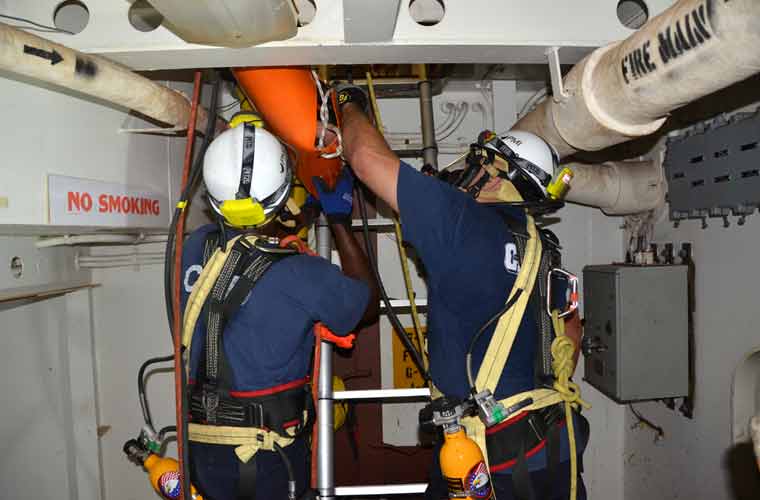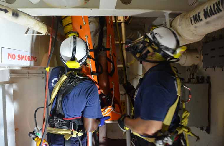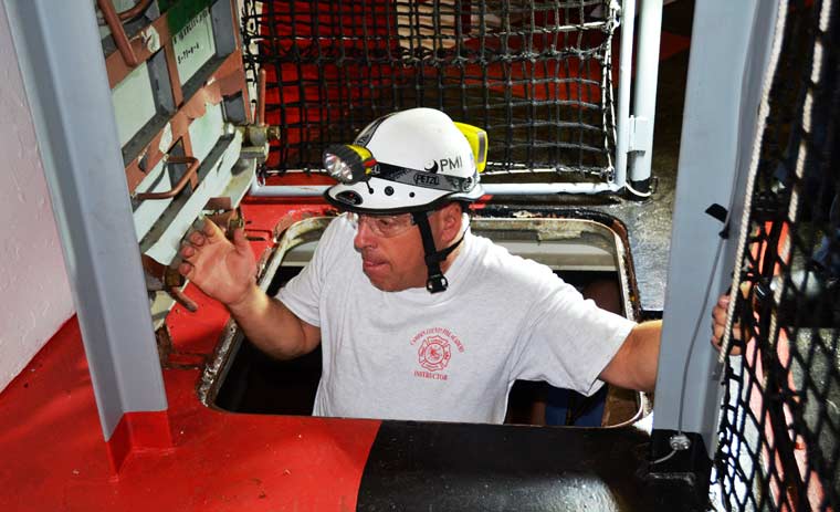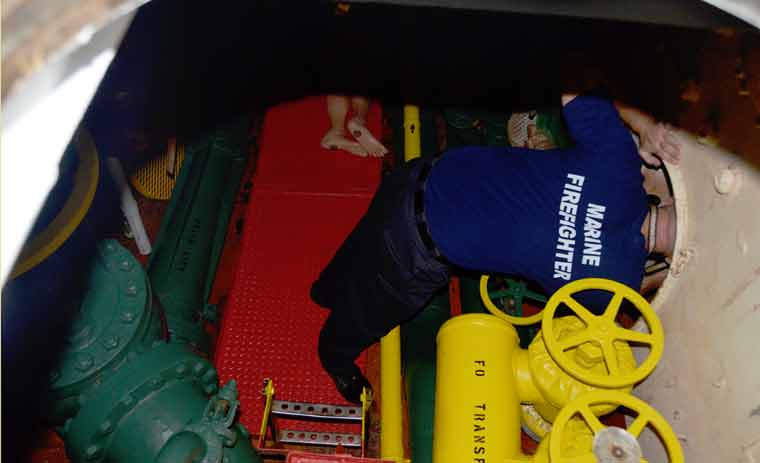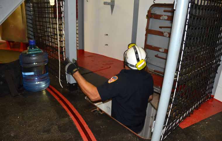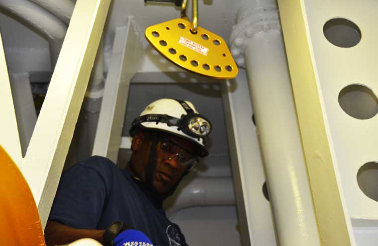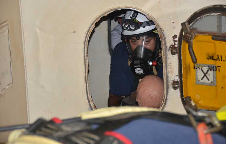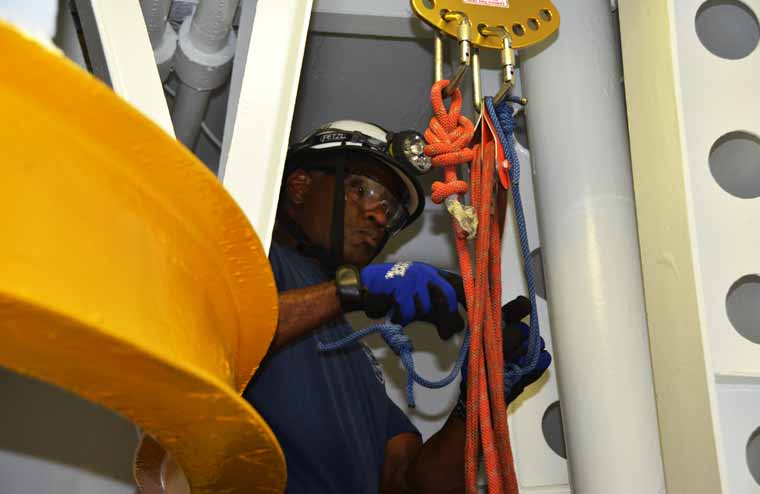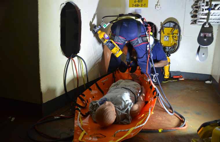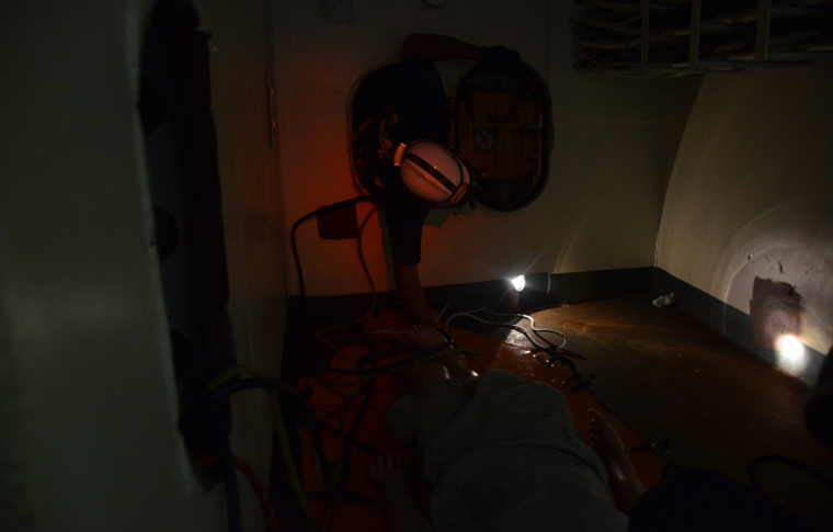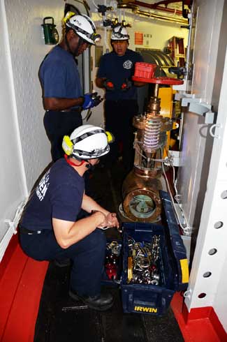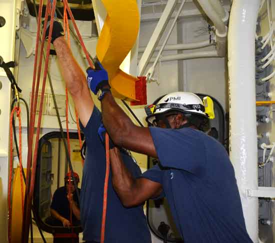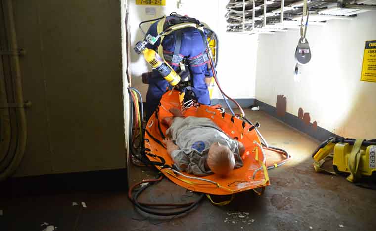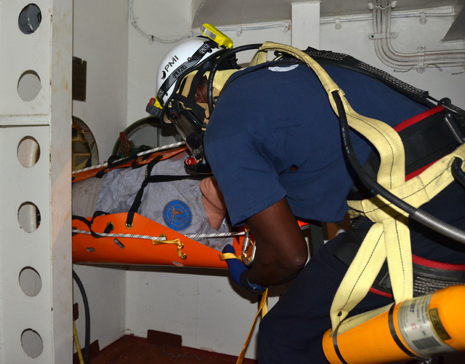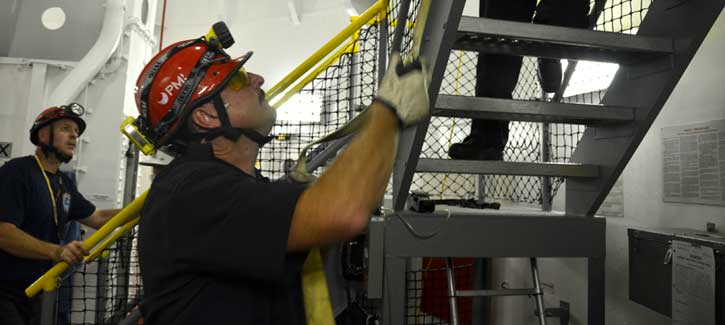 Each and every time the call comes to the Camden Fire Department, it's men and women face what may be potentially life-threatening circumstances. Standards and practices to ensure the safety of the public and first responders have been developed over the past 160-odd years, and while many at City Hall and elsewhere in State and County government may believe corners can be cut, far too many examples.. fatalities and injuries… have proven that is a falsehood. Firefighting and rescue is a dangerous business… roughly 70% of all deaths occurring in rescue operations are those of rescuers, not of rescuees. As part of ongoing training, Camden Fire Department personnel were given training in confined space rescue operations over the course of several days in September of 2011, first at Liberty Station on Broadway, followed by sessions on the battleship USS New Jersey BB-62, which is docked along the Camden waterfront. I was privileged to be allowed to monitor both parts of the course given. On September 12 I accompanied Battalion Chief Donald Johnson and Captains Frank Sandrock and David Dilks, who were conducting the class, aboard the USS New Jersey. Two groups of Camden firefighters took the training. The morning group consisted of Firefighters Brian Beach, David Diaz, Orland Nunez, and Lacy Phelps. The afternoon session attended by Captain Manny Martinez and Firefighters Efi Mercado, Gamalier Rivera, Frank Thompson, and Ken White. I have captioned some of the photos and attempted to describe what was occurring, and may well have either got it wrong or used improper terminology. If any interested party would like to assist, please comment at the bottom of the page. September 14, 2011 |