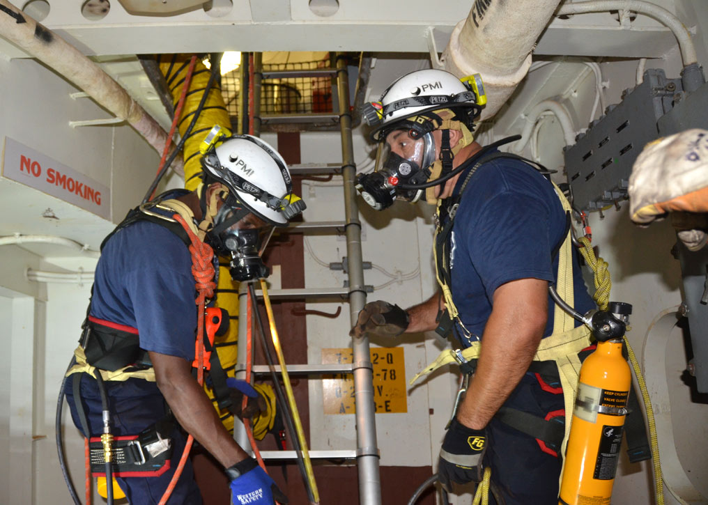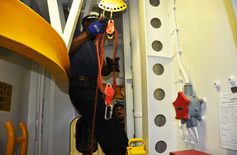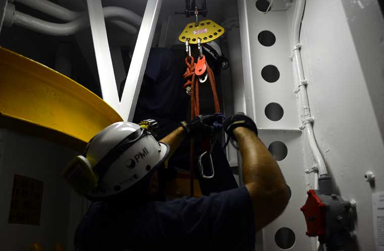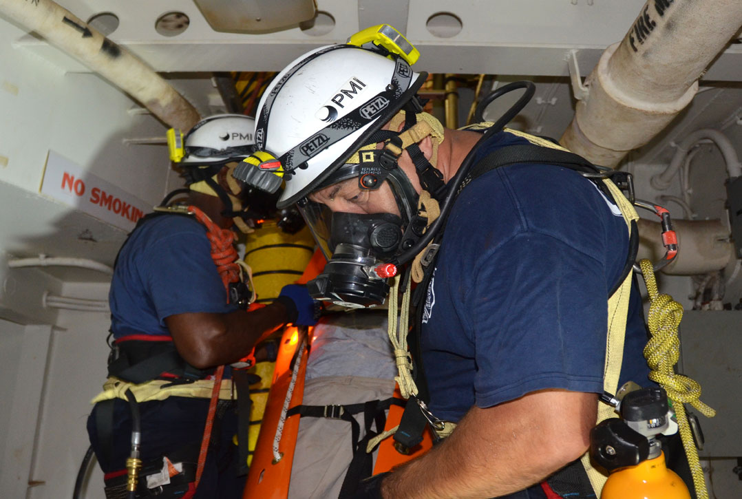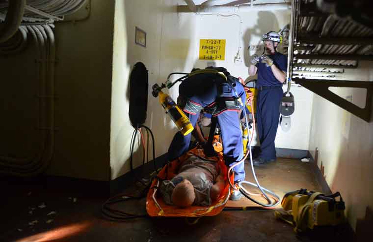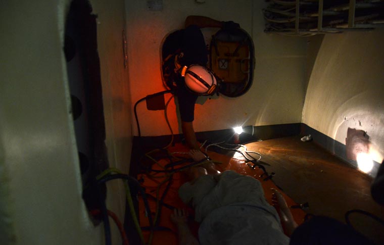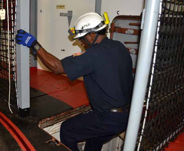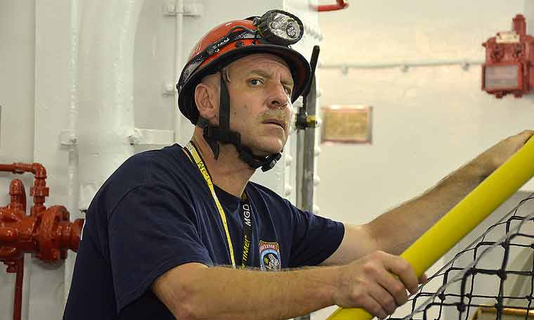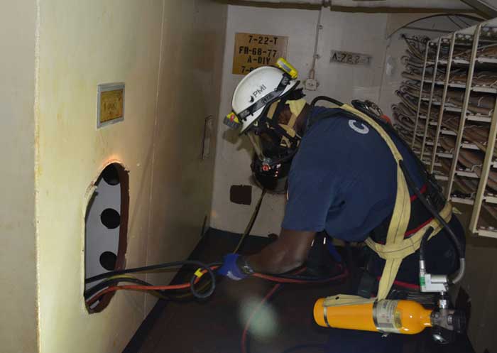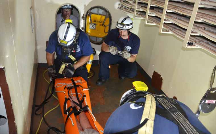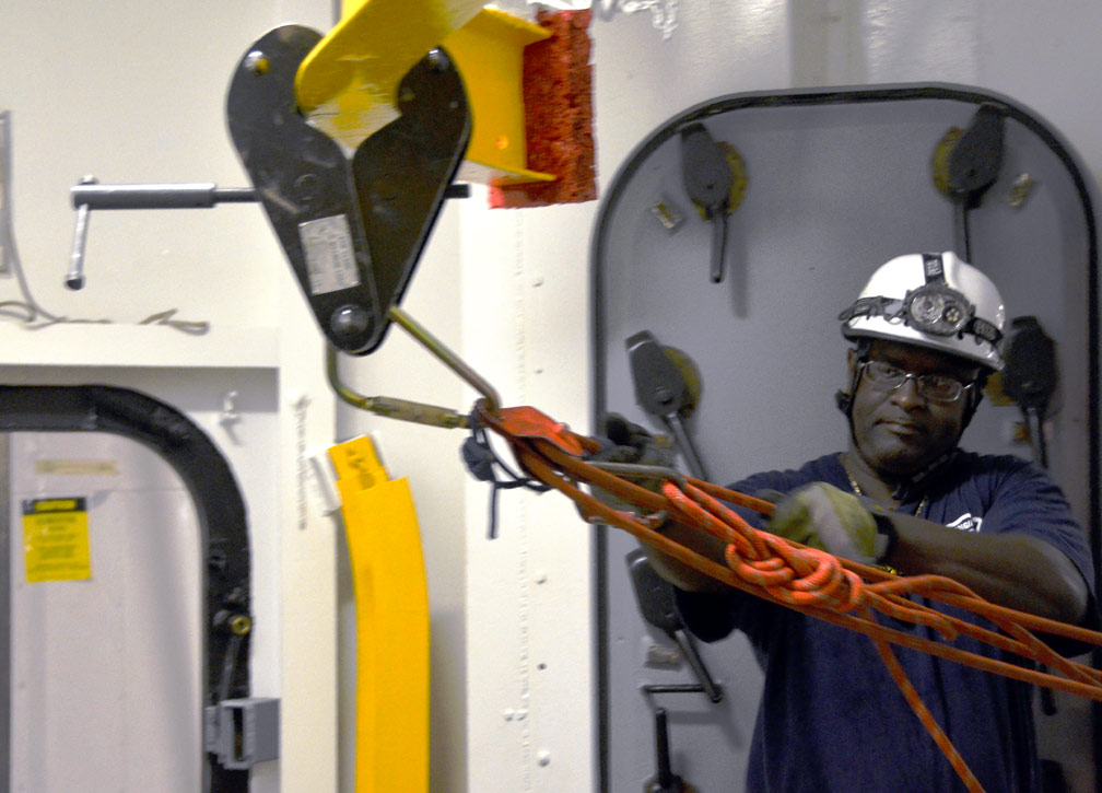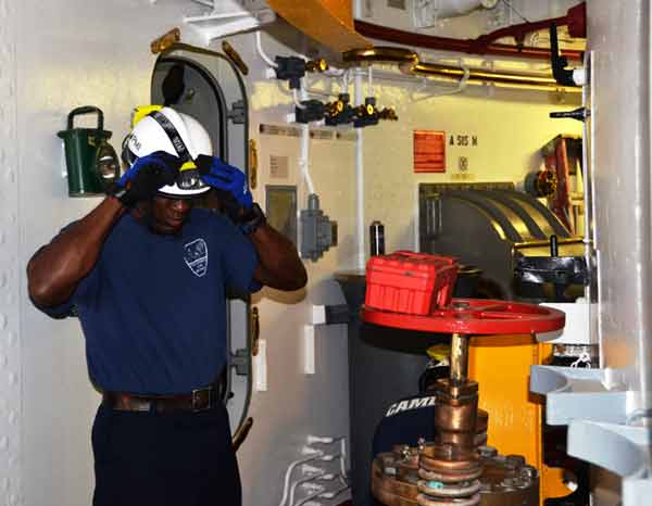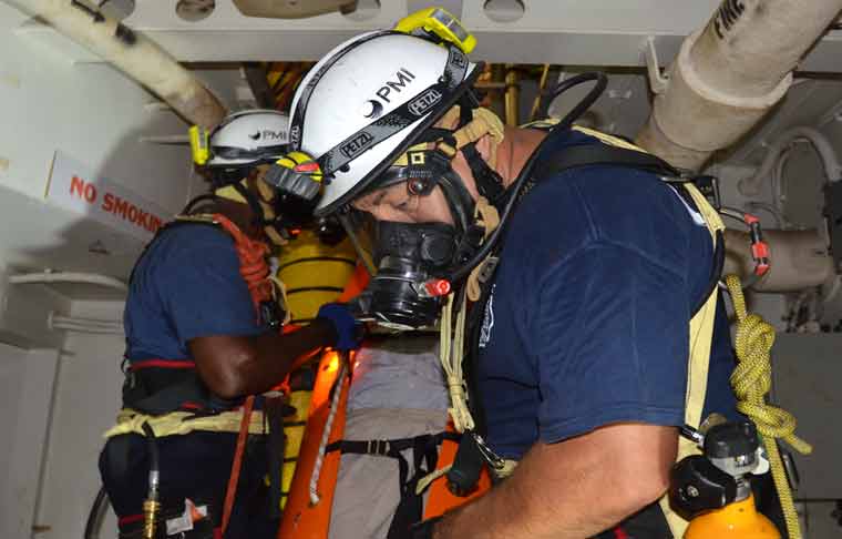 Each and every time the call comes to the Camden Fire Department, it's men and women face what may be potentially life-threatening circumstances. Standards and practices to ensure the safety of the public and first responders have been developed over the past 160-odd years, and while many at City Hall and elsewhere in State and County government may believe corners can be cut, far too many examples.. fatalities and injuries… have proven that is a falsehood. Firefighting and rescue is a dangerous business… roughly 70% of all deaths occurring in rescue operations are those of rescuers, not of rescuees. As part of ongoing training, Camden Fire Department personnel were given training in confined space rescue operations over the course of several days in September of 2011, first at Liberty Station on Broadway, followed by sessions on the battleship USS New Jersey BB-62, which is docked along the Camden waterfront. I was privileged to be allowed to monitor both parts of the course given. On September 12 I accompanied Battalion Chief Donald Johnson and Captains Frank Sandrock and David Dilks, who were conducting the class, aboard the USS New Jersey. Two groups of Camden firefighters took the training. The morning group consisted of Firefighters Brian Beach, David Diaz, Orland Nunez, and Lacy Phelps. The afternoon session attended by Captain Manny Martinez and Firefighters Efi Mercado, Gamalier Rivera, Frank Thompson, and Ken White. I have captioned some of the photos and attempted to describe what was occurring, and may well have either got it wrong or used improper terminology. If any interested party would like to assist, please comment at the bottom of the page. September 14, 2011 |
