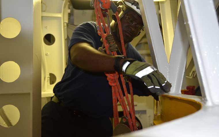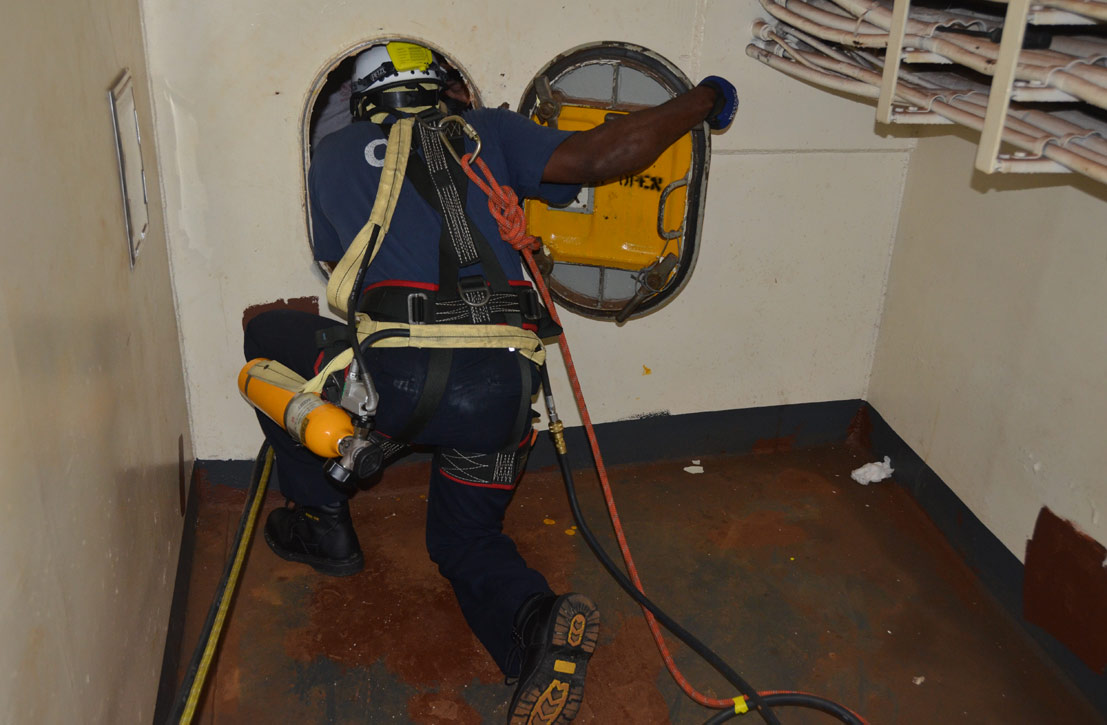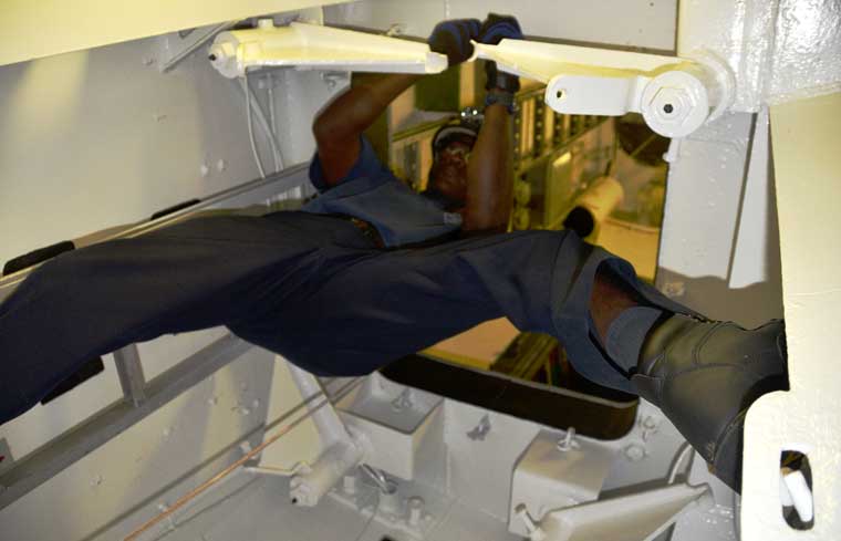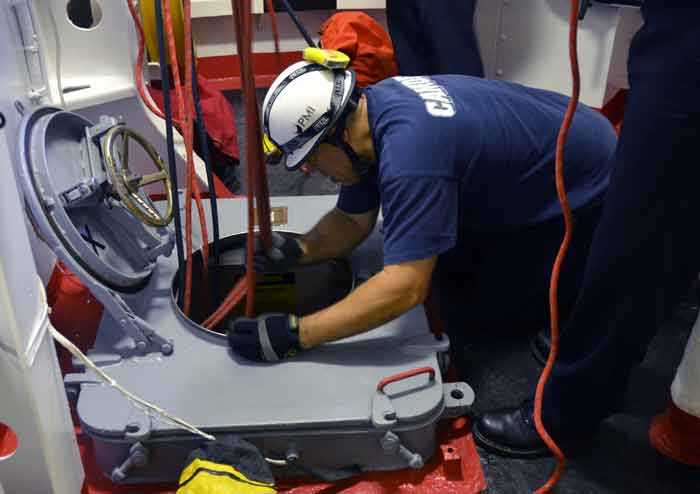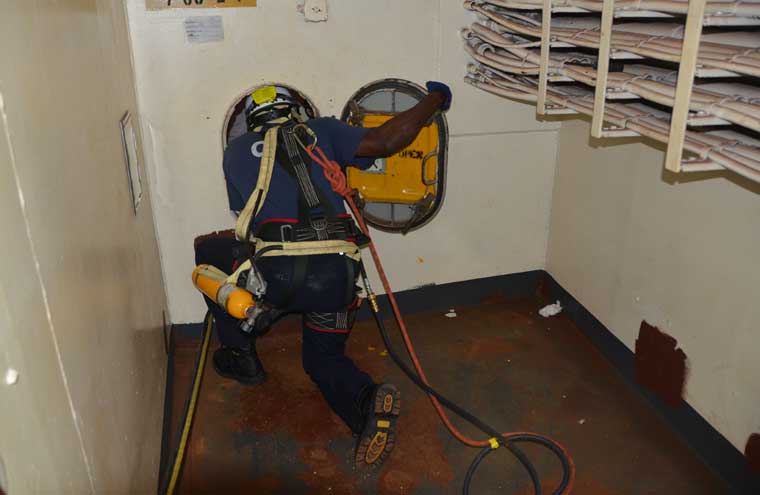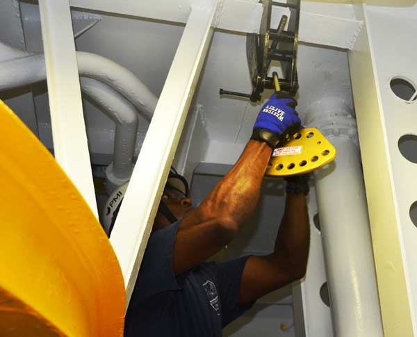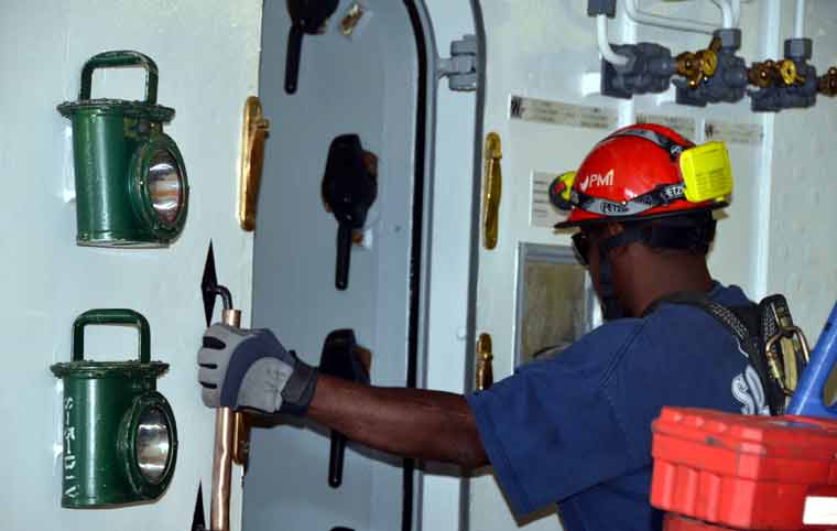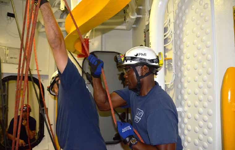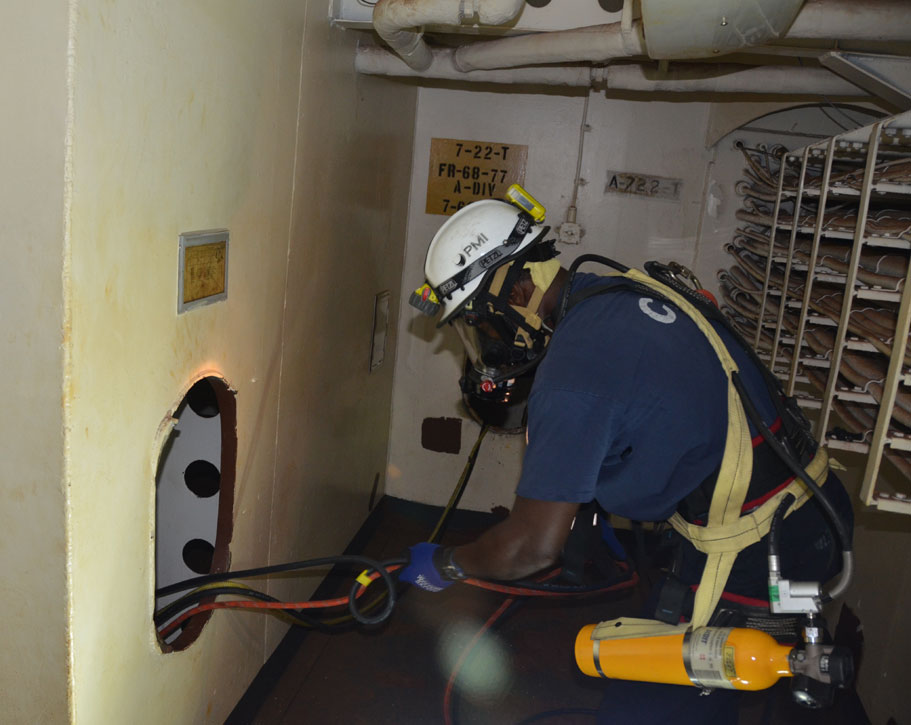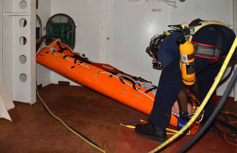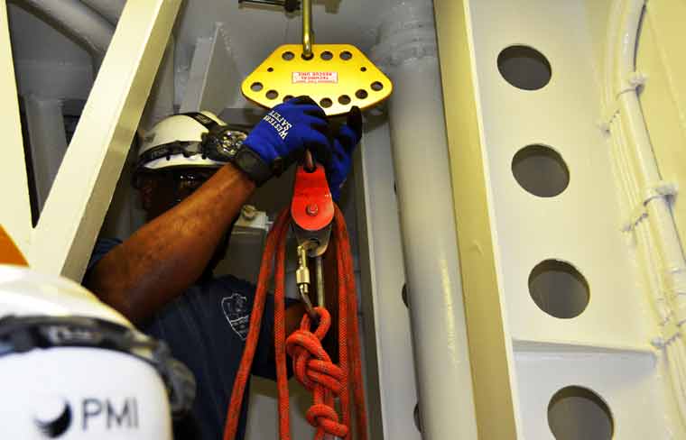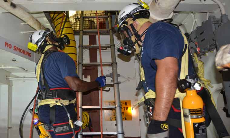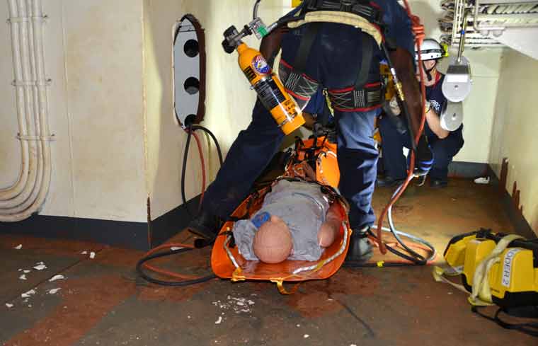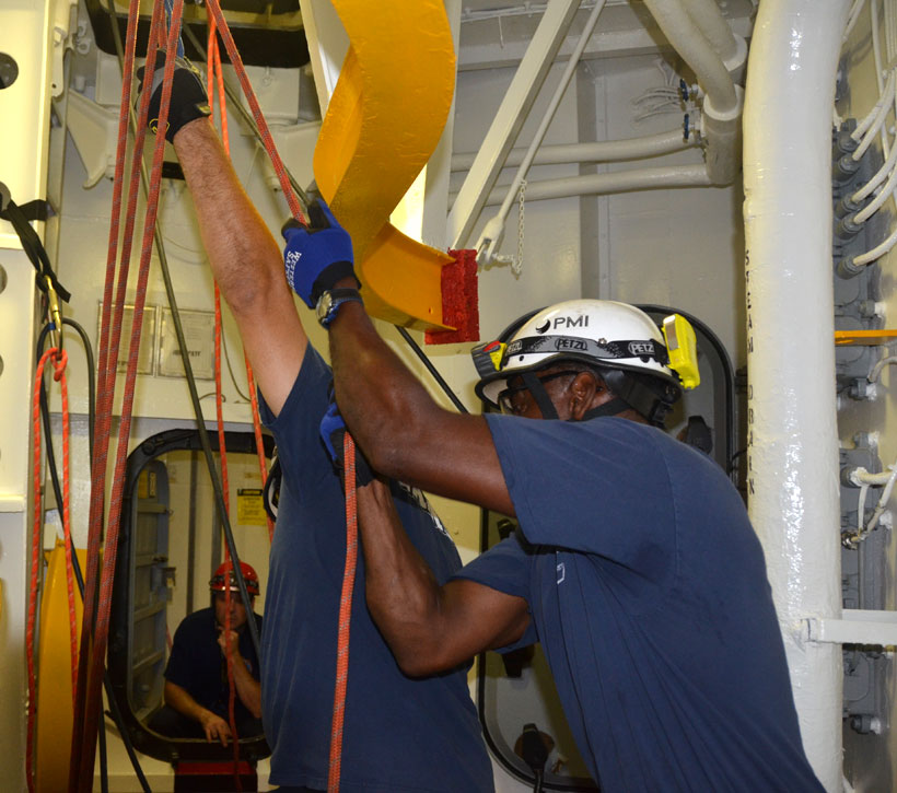 Each and every time the call comes to the Camden Fire Department, it's men and women face what may be potentially life-threatening circumstances. Standards and practices to ensure the safety of the public and first responders have been developed over the past 160-odd years, and while many at City Hall and elsewhere in State and County government may believe corners can be cut, far too many examples.. fatalities and injuries… have proven that is a falsehood. Firefighting and rescue is a dangerous business… roughly 70% of all deaths occurring in rescue operations are those of rescuers, not of rescuees. As part of ongoing training, Camden Fire Department personnel were given training in confined space rescue operations over the course of several days in September of 2011, first at Liberty Station on Broadway, followed by sessions on the battleship USS New Jersey BB-62, which is docked along the Camden waterfront. I was privileged to be allowed to monitor both parts of the course given. On September 12 I accompanied Battalion Chief Donald Johnson and Captains Frank Sandrock and David Dilks, who were conducting the class, aboard the USS New Jersey. Two groups of Camden firefighters took the training. The morning group consisted of Firefighters Brian Beach, David Diaz, Orland Nunez, and Lacy Phelps. The afternoon session attended by Captain Manny Martinez and Firefighters Efi Mercado, Gamalier Rivera, Frank Thompson, and Ken White. I have captioned some of the photos and attempted to describe what was occurring, and may well have either got it wrong or used improper terminology. If any interested party would like to assist, please comment at the bottom of the page. September 14, 2011 |