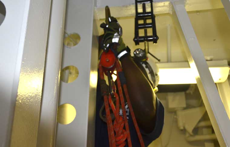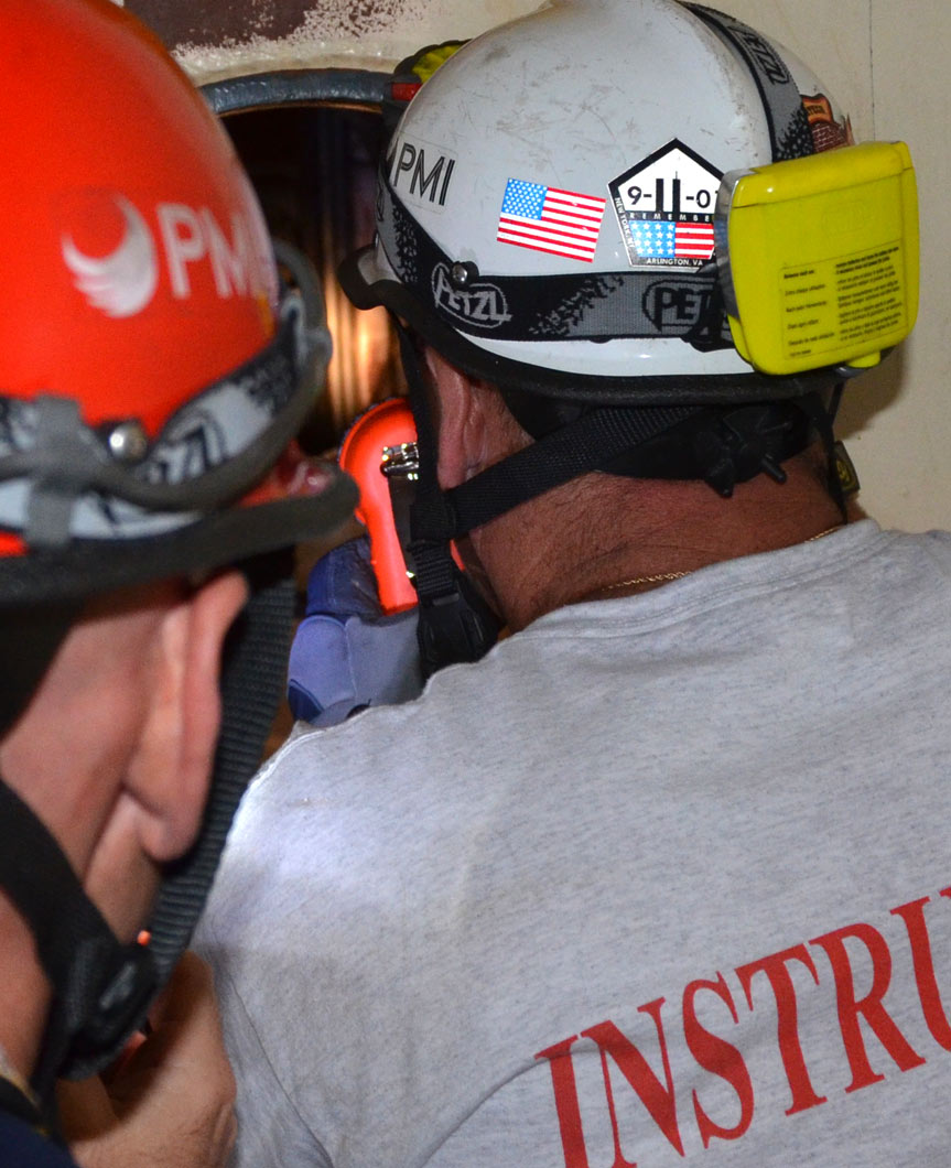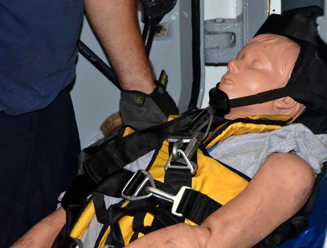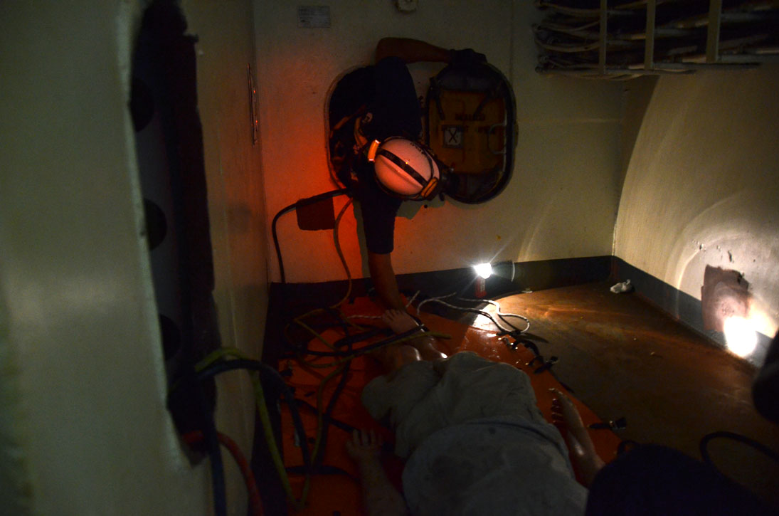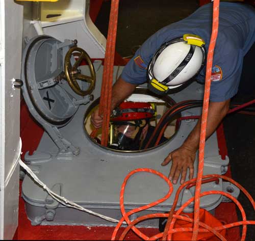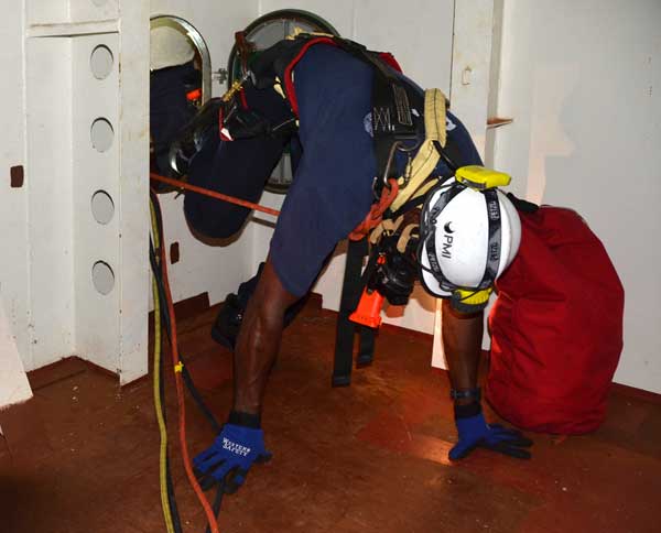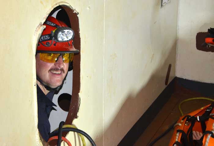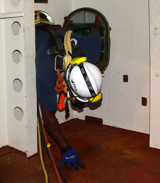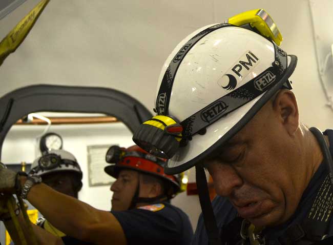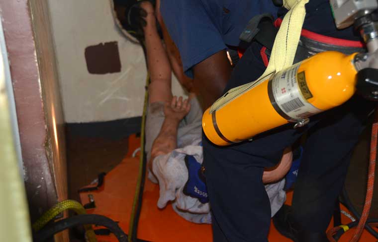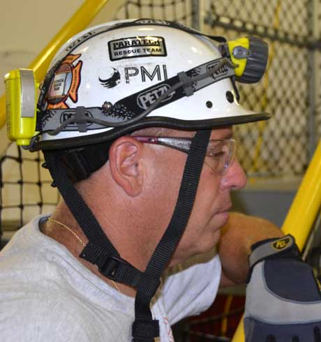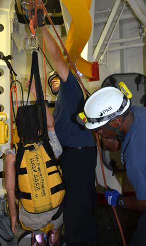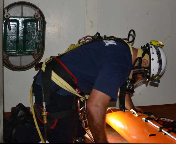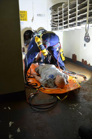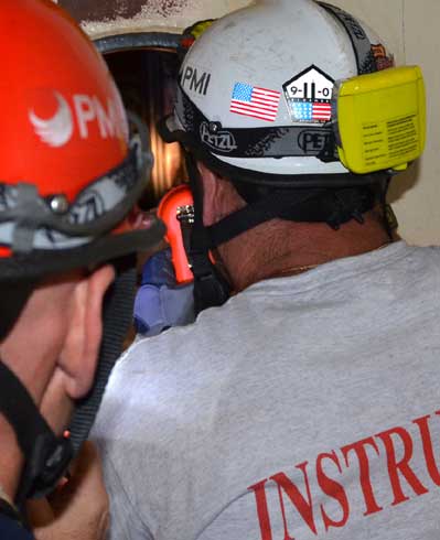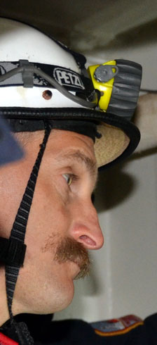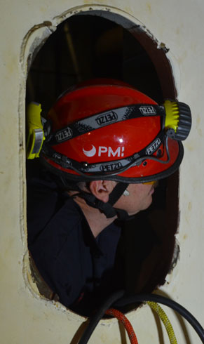 At this point I went back through the hole. Lacy Phelps followed me, then Orlando Nunez passed the patient through to him. Once through, the patient was attached to the rigging system, and brought above. |