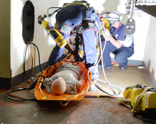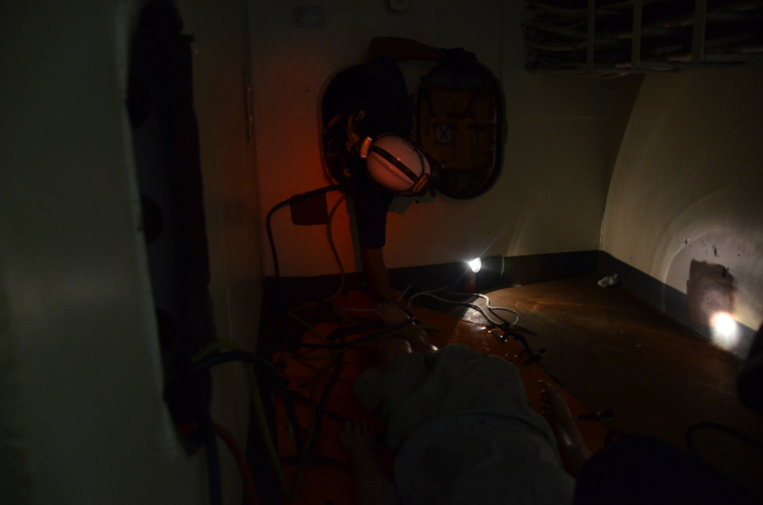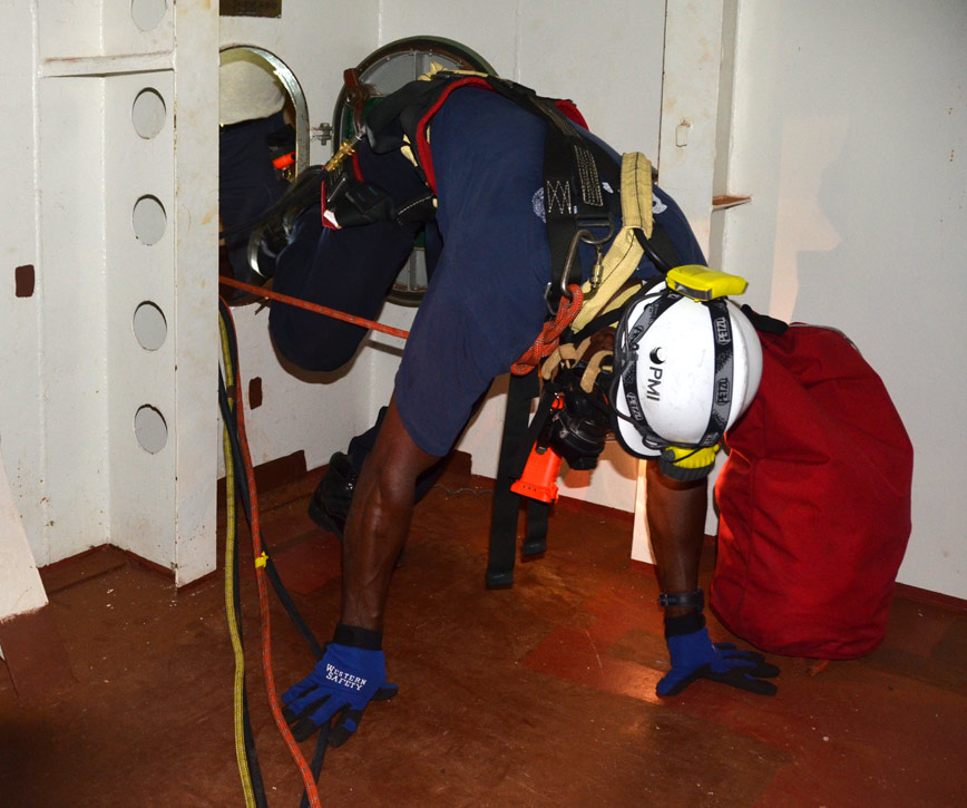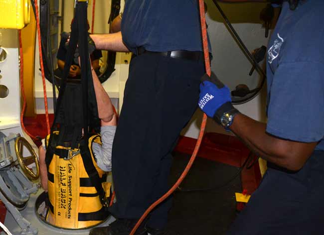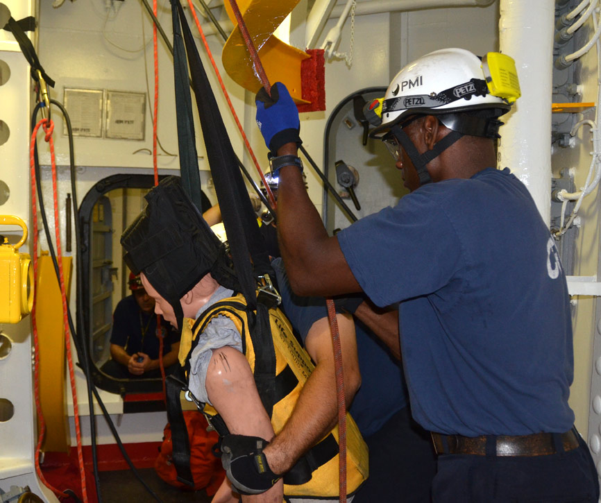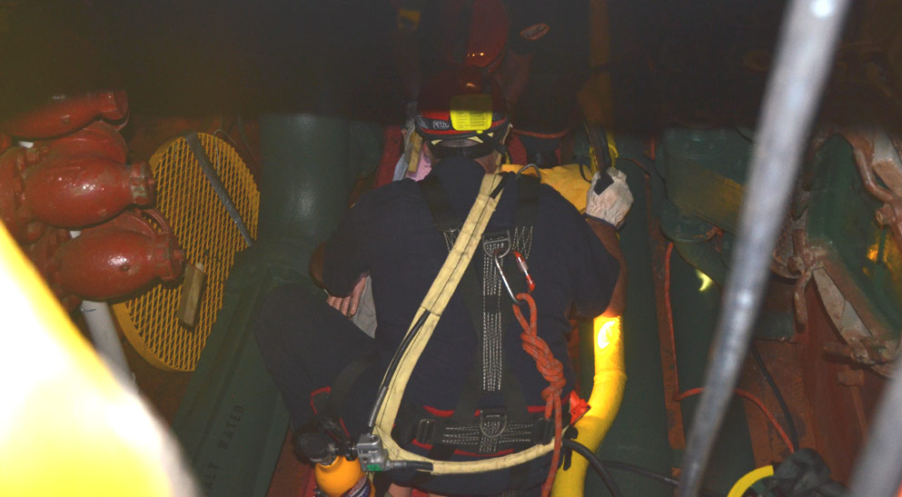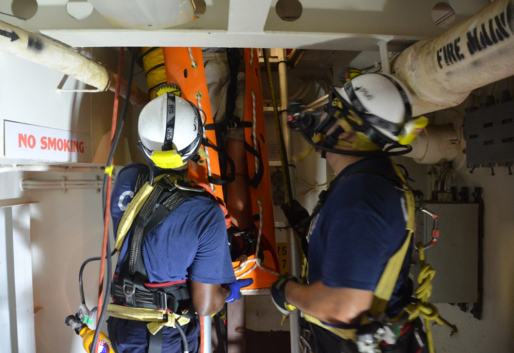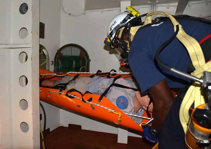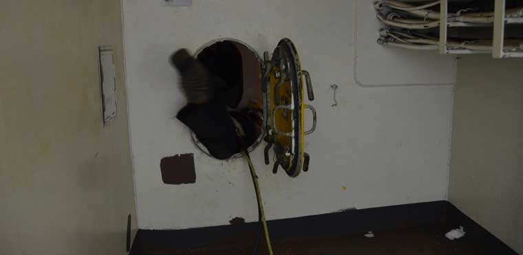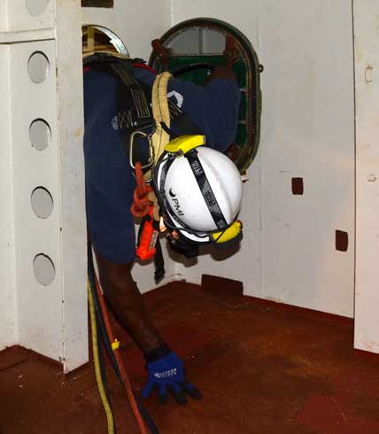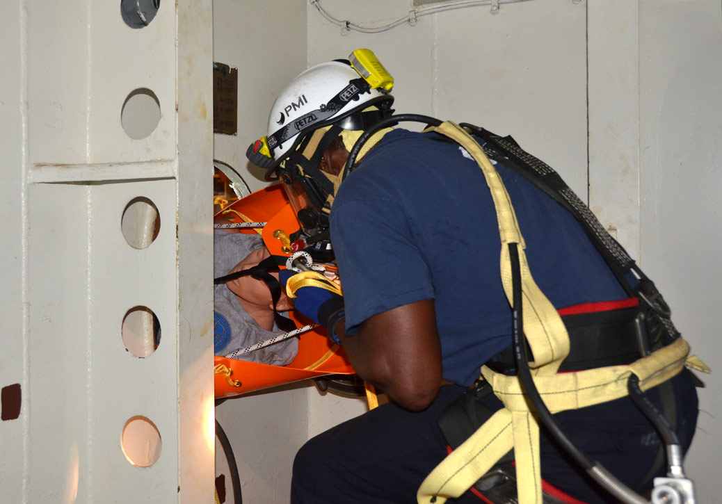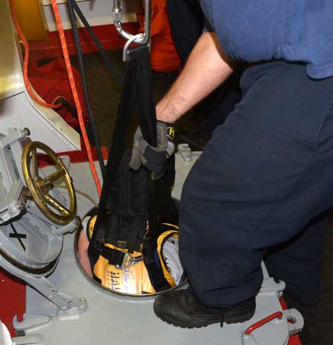 At this point I went back through the hole. Lacy Phelps followed me, then Orlando Nunez passed the patient through to him. Once through, the patient was attached to the rigging system, and brought above. |