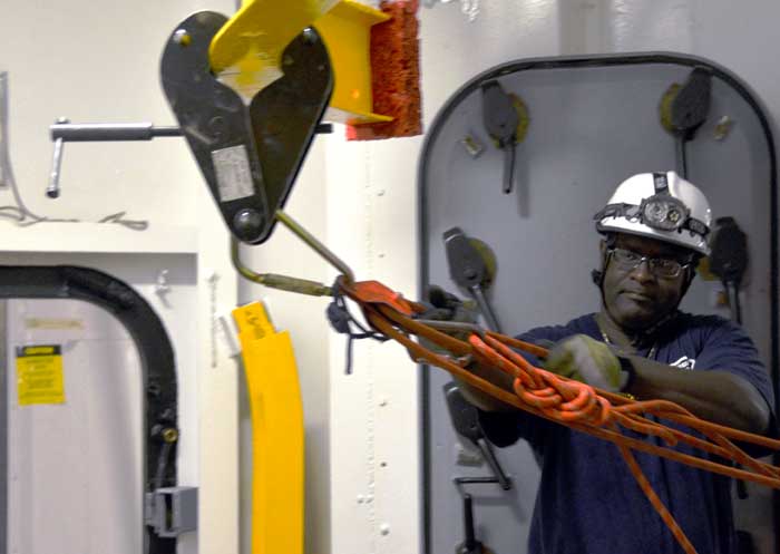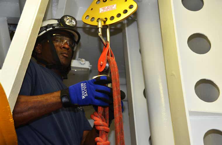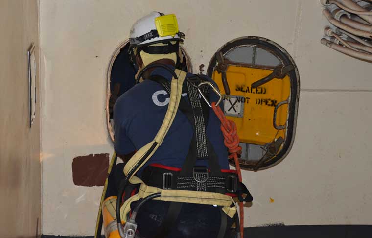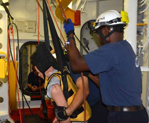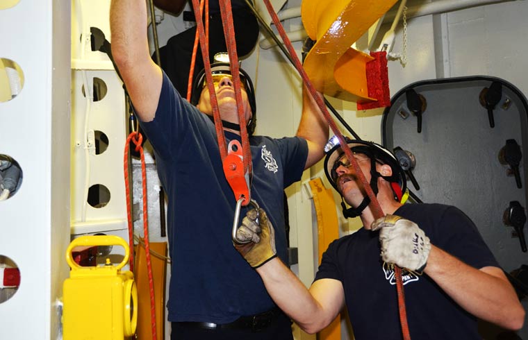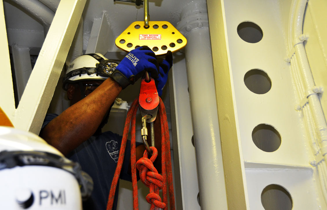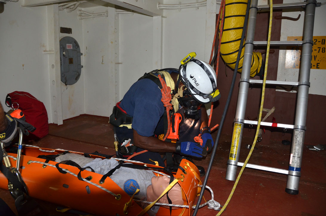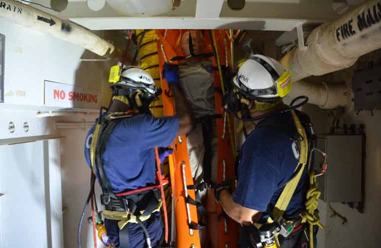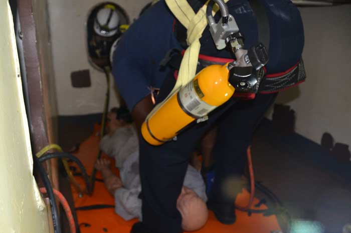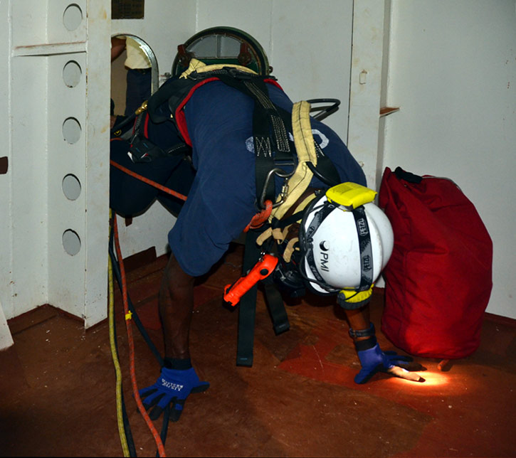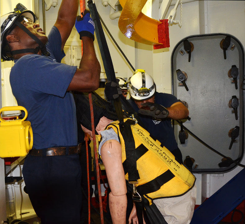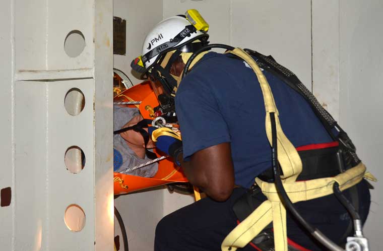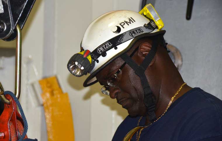 At this point I went back through the hole. Lacy Phelps followed me, then Orlando Nunez passed the patient through to him. Once through, the patient was attached to the rigging system, and brought above. |