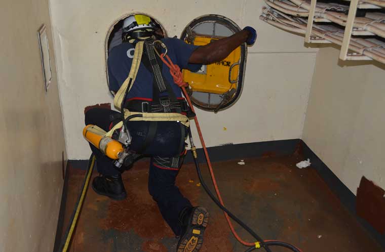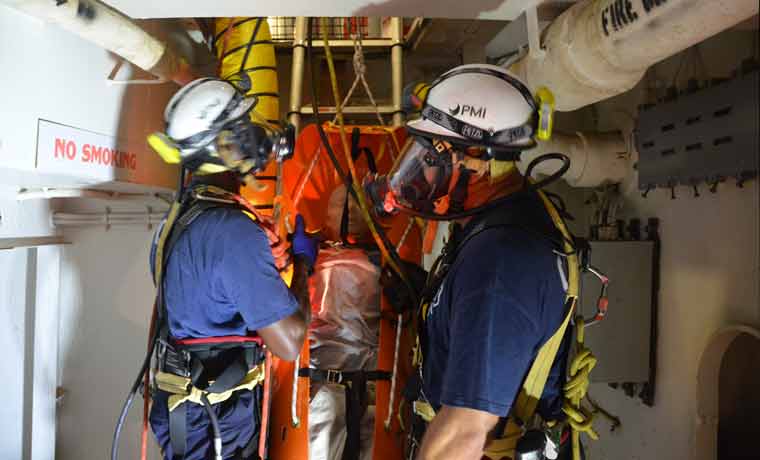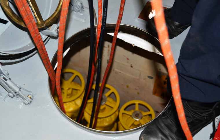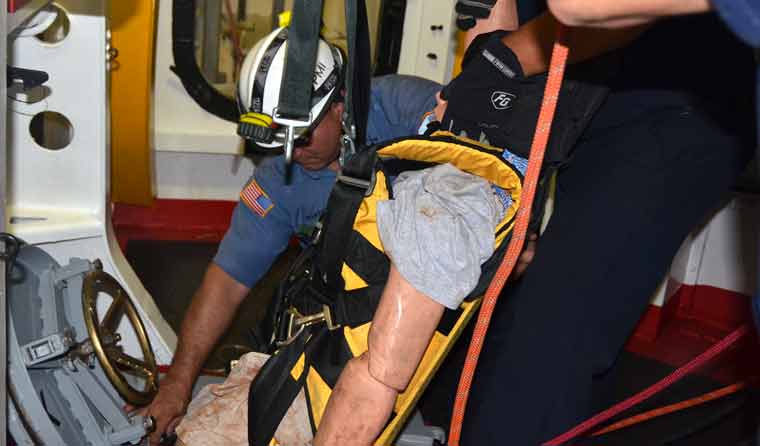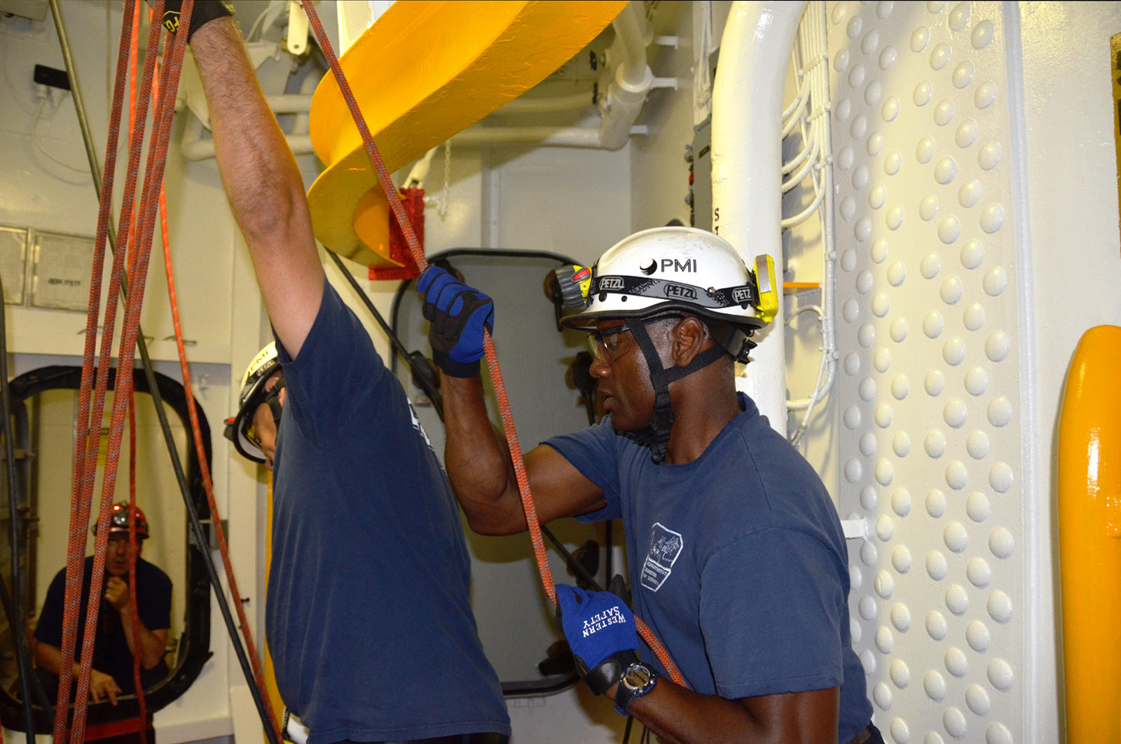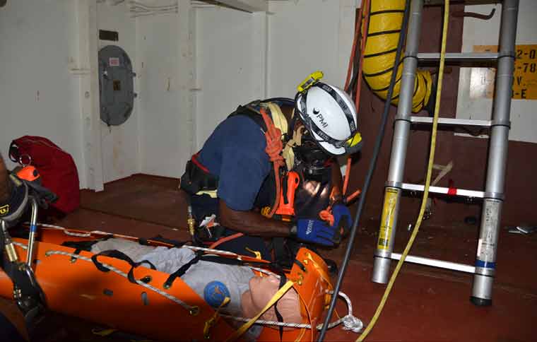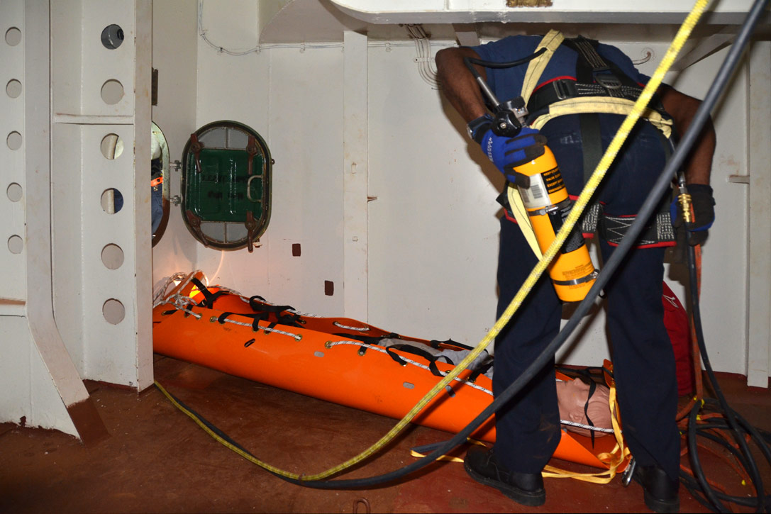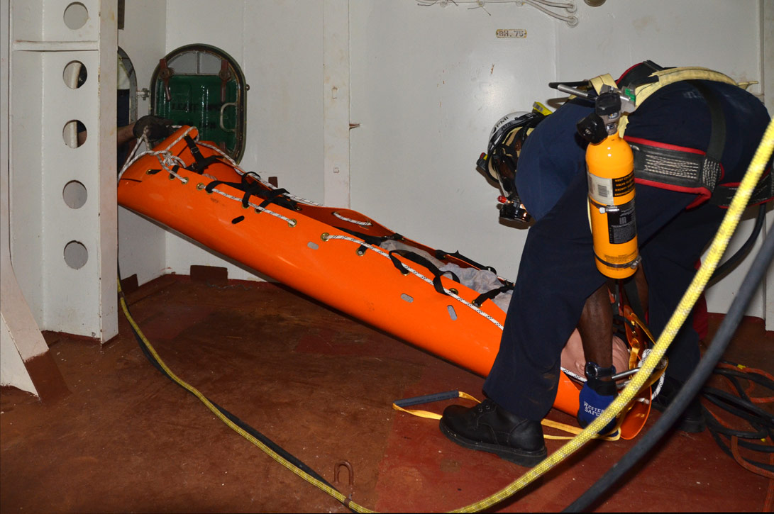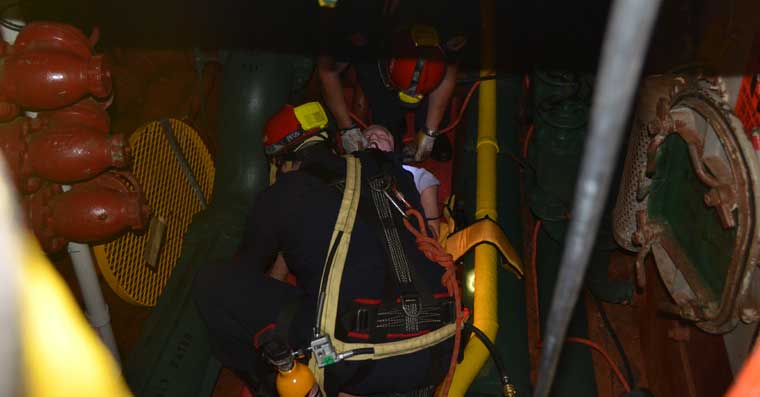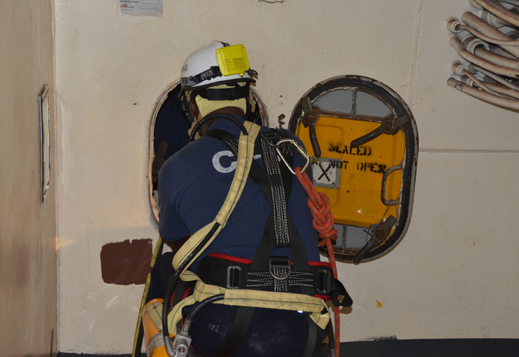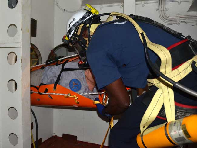 At this point I went back through the hole. Lacy Phelps followed me, then Orlando Nunez passed the patient through to him. Once through, the patient was attached to the rigging system, and brought above. |