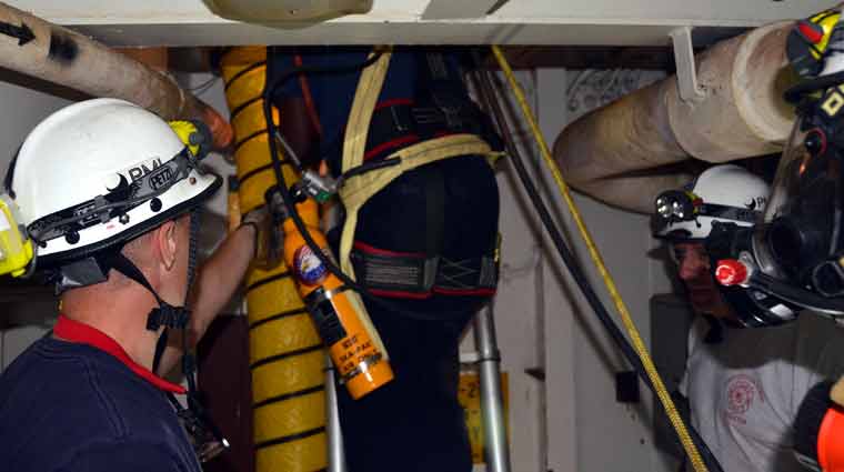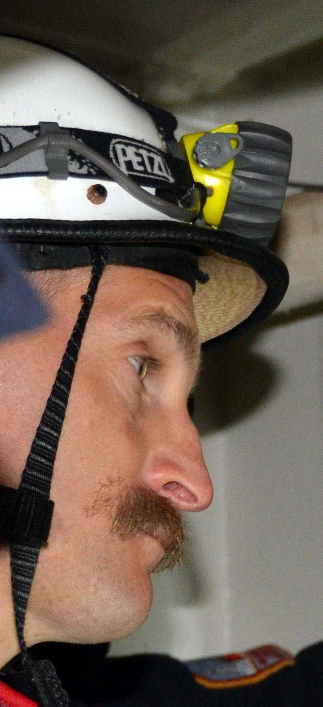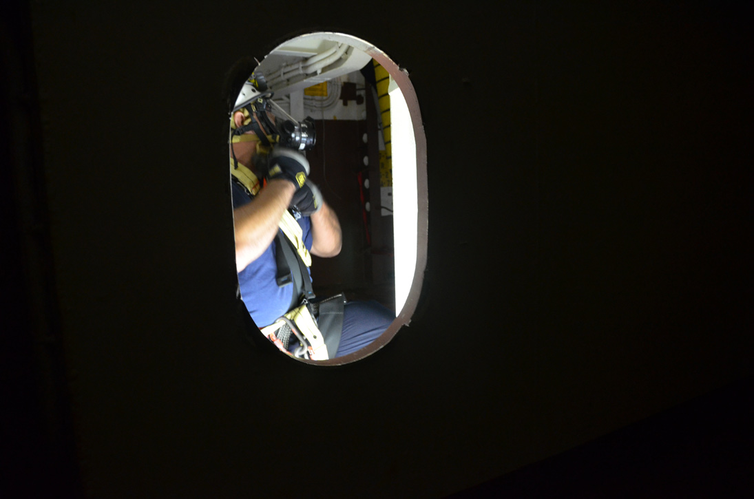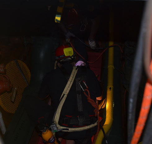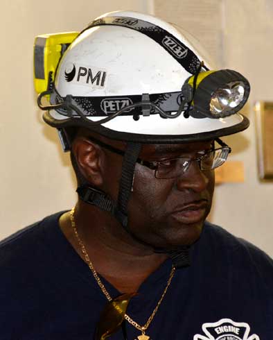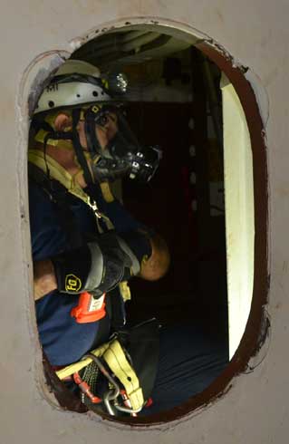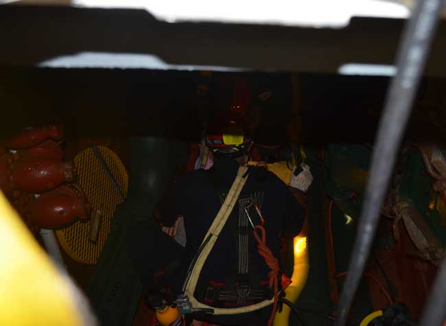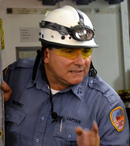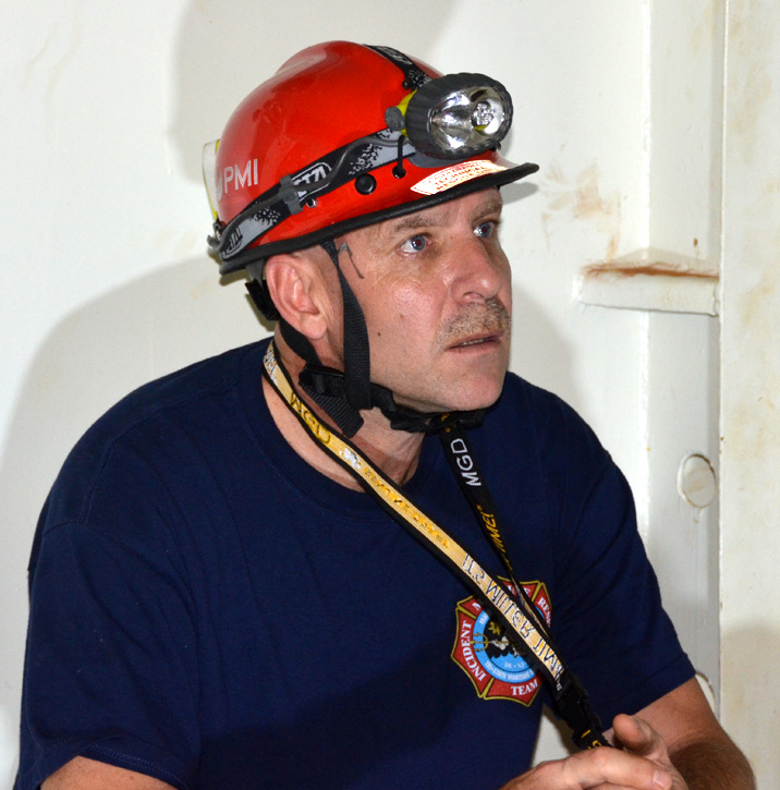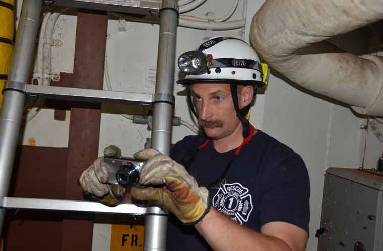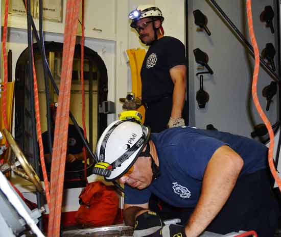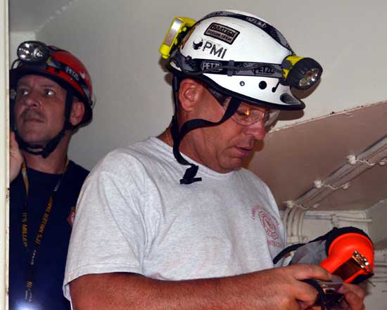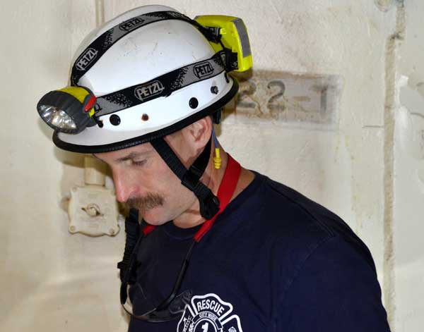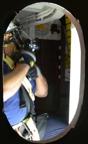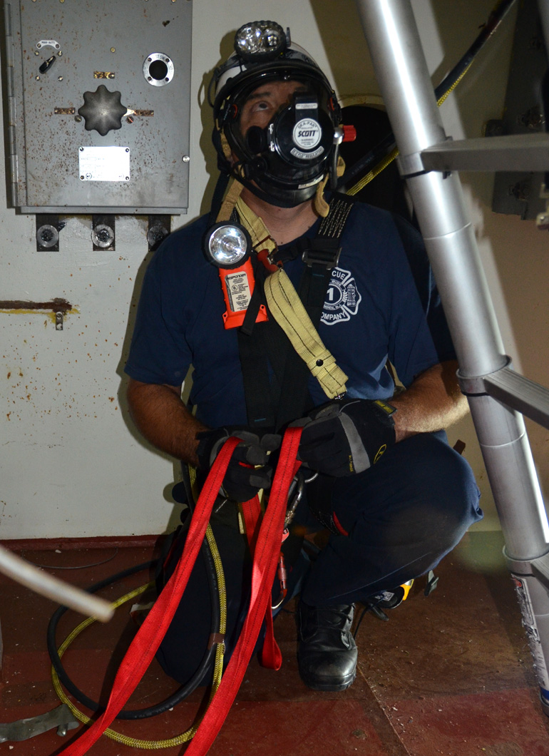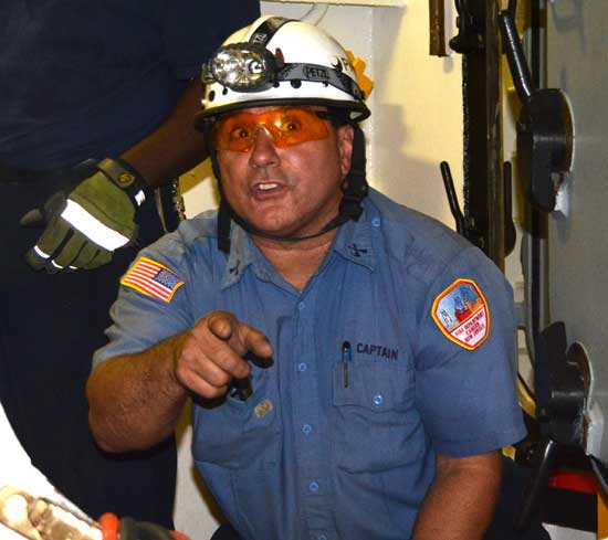 Here is where things got a lot more complicated, for me, that is. As it had already been determined that it was safe, I got permission to go into the confined space from Captain Sandrock. It is pitch black in this area, all lighting coming from equipment the firefighters brought down or the flash in my camera, leaving me with a dilemma of how to do two things- one, record what was going on with a degree of detail that you who are reading this can appreciate and learn from; and two, convey some sense of how tight and how dark it was in this space. You will see a few pictures below where I changed different settings on the camera to accomplish the second objective. I am NOT a professional photographer and this was the first time this problem has come my way, so I so hope my solution works for you! September 14, 2011 |
