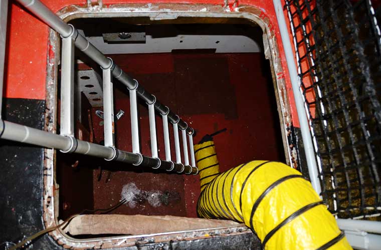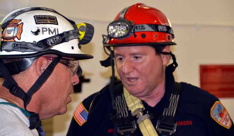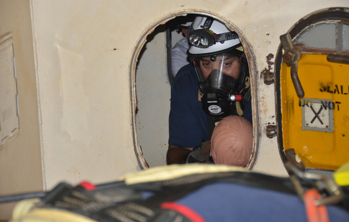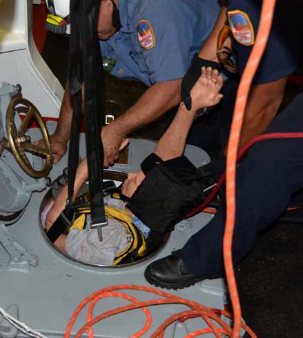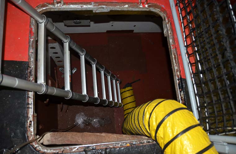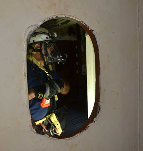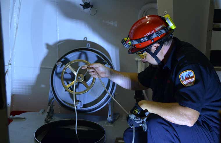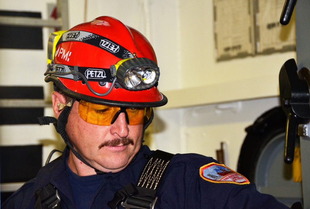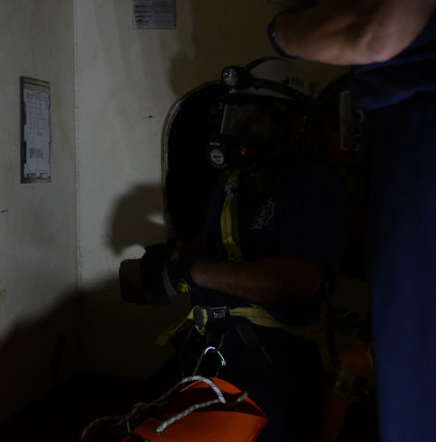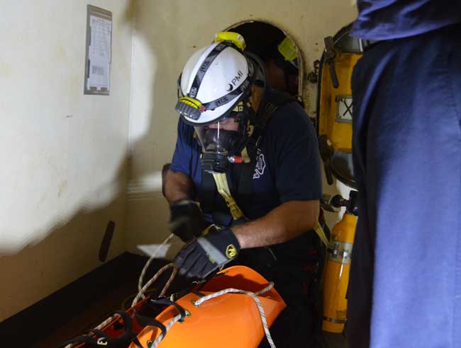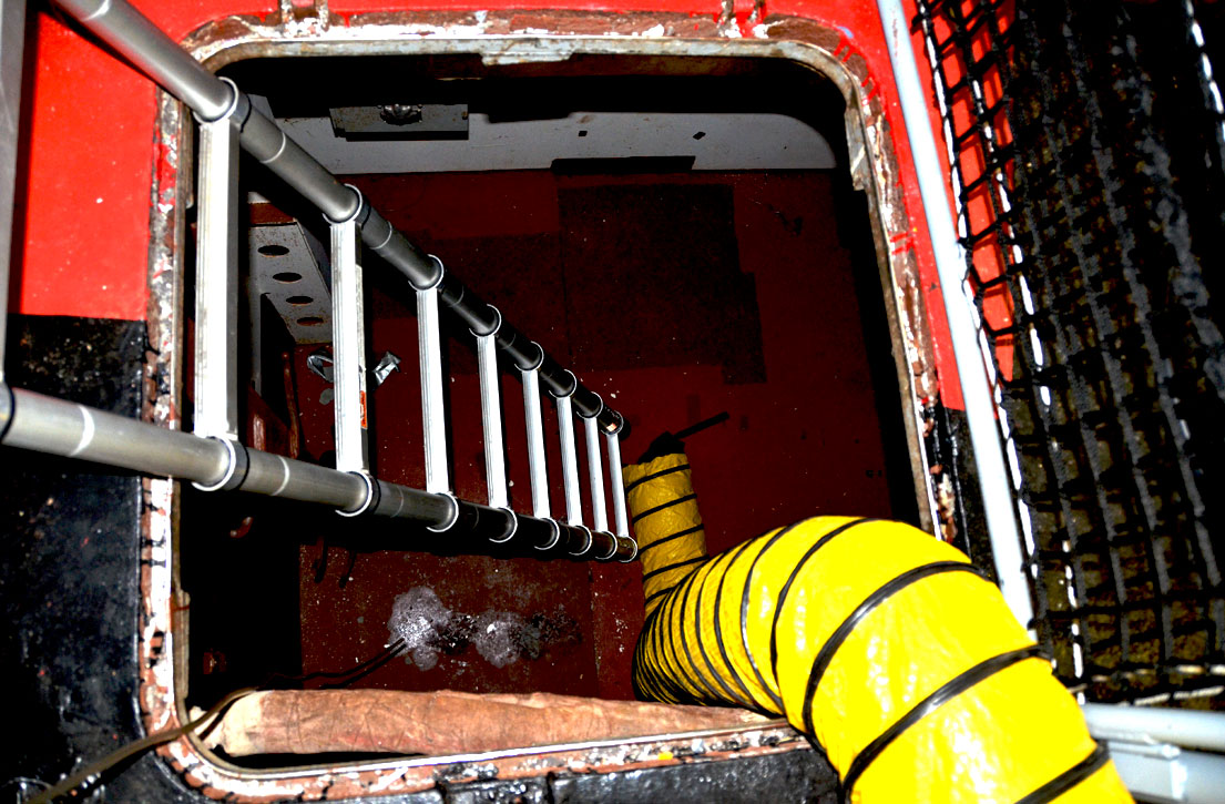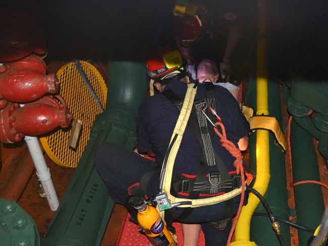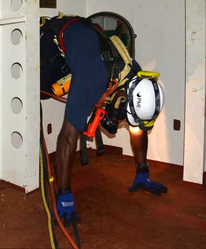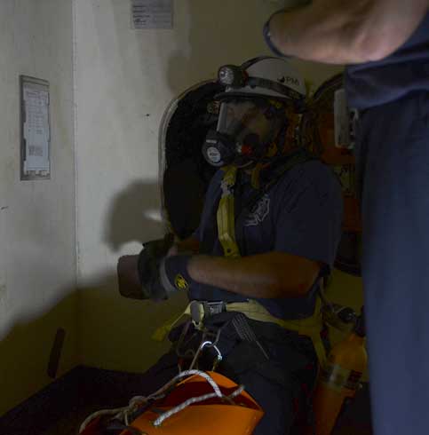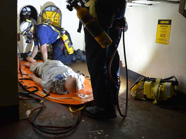 Here is where things got a lot more complicated, for me, that is. As it had already been determined that it was safe, I got permission to go into the confined space from Captain Sandrock. It is pitch black in this area, all lighting coming from equipment the firefighters brought down or the flash in my camera, leaving me with a dilemma of how to do two things- one, record what was going on with a degree of detail that you who are reading this can appreciate and learn from; and two, convey some sense of how tight and how dark it was in this space. You will see a few pictures below where I changed different settings on the camera to accomplish the second objective. I am NOT a professional photographer and this was the first time this problem has come my way, so I so hope my solution works for you! September 14, 2011 |