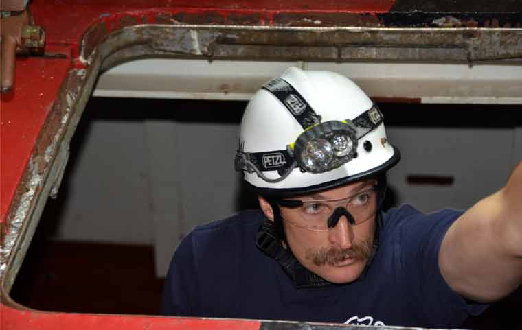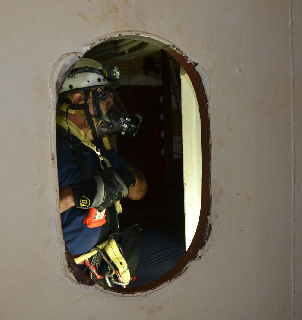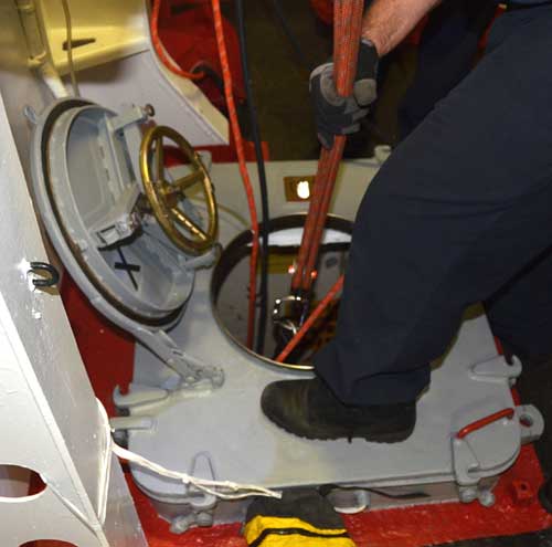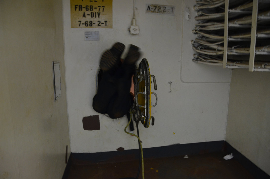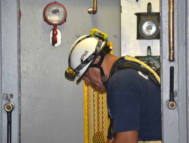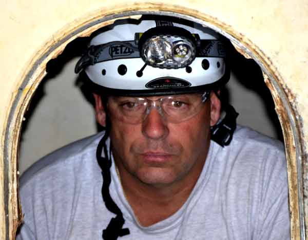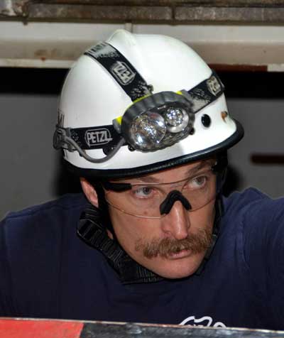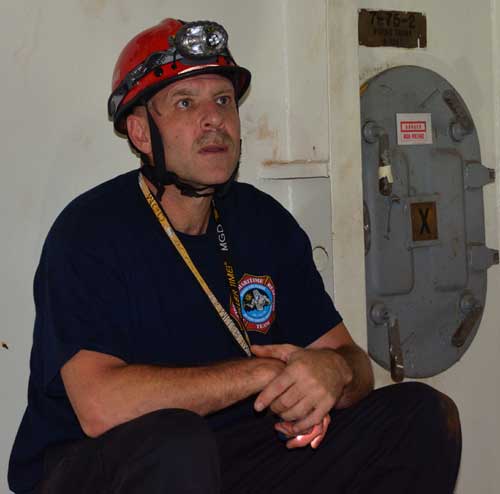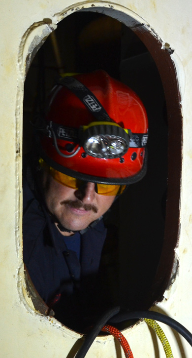 Going throught that hole was a learning process…a very small hole and a somewhat overly large me. This is a problem that rescue personnel face, as they are going in with air tanks and all sorts of other equipment strapped on. One has to be very careful not to get caught on something going while going about the business at hand. |