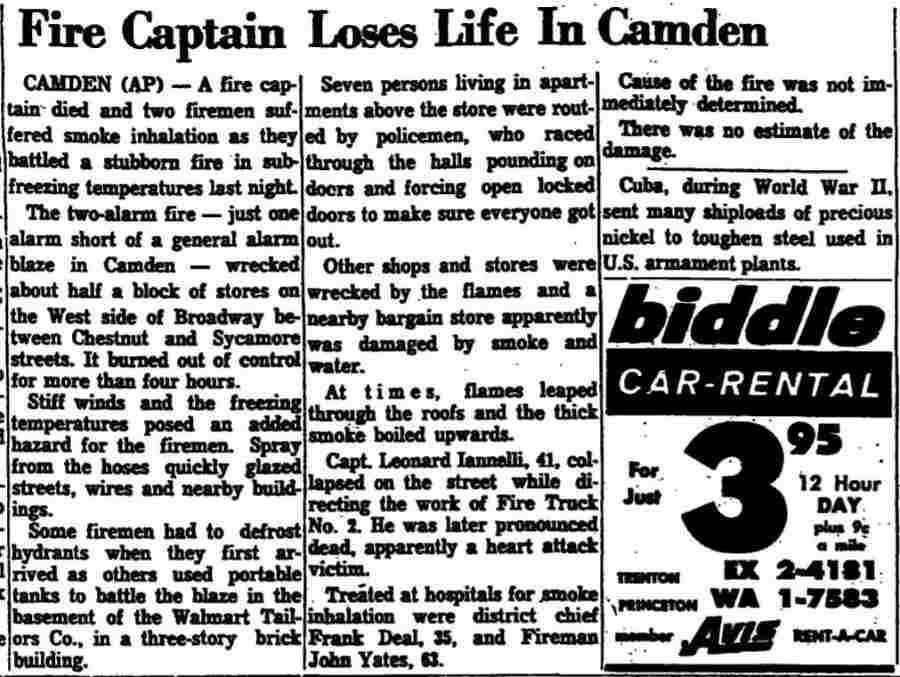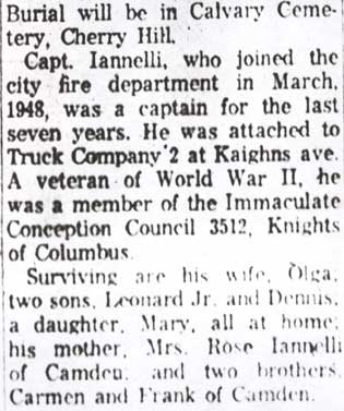 Blaze Destroys 3 Buildings; Fireman Dies, Two Are Injured 9 Left Without Homes By Fredrick Smigelski and Charles Q. Finley A fast moving fire fanned by a bitterly cold wind destroyed three buildings in South Camden last night, left one fireman dead, two others injured, and nine persons homeless. As dense smoke, chunks of flaming debris and showers of sparks spewed high into the night, the roaring blaze wrecked Walmart Tailors, Inc. at 1101 Broadway and two floors above the store used as an apartment house, the Style Nook Dress Shop at 1103 Broadway, and Jean's Hosiery Shop at 1105 Broadway. With only seconds to spare, Police Sergeant John Ferry and Patrolman Alfred Hayes entered the 1101 building and led the occupants, many of them elderly, to safety as flames mushroomed from the basement toward the roof. Eleven pieces of equipment were still at the scene this morning. Captain Dies Fire Captain Leonard Iannelli, 41, of 3055 Stevens Street and attached to Truck Company 2, collapsed at the scene. He was dead on arrival at Cooper Hospital of an apparent heart attack. Fire District Chief Frank Deal, 39, of 412 North 37th Street, was treated at Cooper Hospital for smoke inhalation.John Yates, 63, of 2400 South 8th Street with Engine Company 2, was treated at West Jersey Hospital for smoke inhalation and a back injury. Among those made homeless by the fire were Claude W. Darnell and Mrs. Carey Morgan, both 80; William Schaffer, 77; and Charles Hill, 67 and his wife who is 62; Mrs. Frances Matthews, 53; Helen Saltzman and James Early. Iannelli was standing on Broadway next to Lieutenant Colonel William A. Gwynne of the Volunteers of America, a chaplain, who was serving coffee and food. District Chief Theodore Primas gave mouth to mouth resuscitation on the way to the hospital. Coroner Schaffhauser was notified. He said Iannelli died either from a heart attack or smoke inhalation. The possibility of an autopsy was being discussed this morning. Police Aid Elderly Iannelli's brother, Carmen, is with Engine Company 9 and was on duty on the time but not at the fire. He went to the hospital when told of the tragedy. Ferry and Hayes were first on the scene after the alarm was sounded at 6:03 by a nearby merchant. They entered through a back door and ran upstairs to the second floor where they kicked in doors, rounded up the confused occupants and got them out safely. They then went to the third floor and found Early and Darnell. The fore spread rapidly and soon huge balls of flame were pouring from the windows as burning frames fell to the pavement. Chairs, a shower fixture, a mirror on a wall, could be seen briefly through the windows in the mass of flame inside, then they fell into the inferno. The roof collapsed, then sections of the third floor wall on the Chestnut Street side began falling into the fire. Firewall Credited Smoke filled Schrack's Paint Store at 1107 Broadway and a firewall was credited with helping to save John's Bargain Store at 1109-1111 Broadway. Firemen carried a hose to the roof of the Camden Roofing Supply Company on Chestnut Street to the rear of the fire. At one point a half dozen streams of water were being poured into the flames as they burned furiously on one side of a small alley which separated the roofing company from the fire. Harold Walter, owner of Walmart Tailors, Inc. was trying to get his car out of a snow bank nearby when the fire started, He gave firemen keys to open the gate he had just closed across the front of his store. Fire Chief Edward MacDowell said the blaze had apparently started in the basement of 1101 Broadway but no cause had been determined immediately. Fireplugs Froze Engine Companies 8 and 1 and Truck 2 responded to the first alarm with District Chief Theodore Primas. The second alarm was sounded at 6:10, bringing Engine Companies 3 and 7, and Truck Company 1, Rescue Squad 1, District Chief Deal and Deputy Fire Chief Austin Marks. At 8:02 Engine Company 2 was summoned and at 8:45 35 off duty firemen were called to relieve firemen exhausted by the cold. The spray from hoselines covered streets and equipment with sheets of ice. When firemen arrived they found fireplugs frozen and had to use heaters to get the water flowing. Police held back large crowds which gathered despite the cold and wind. The fire burned out of control for six hours and was not declared under control until midnight. The area was closed to traffic during the fire. Traffic this morning was detoured off Broadway between Mt. Vernon Street and Kaighn Avenue. Wind Shifted Primas said there was a west wind when the fire broke out but that it shifted to the north, during the flames into the buildings to the south. Iannelli is survived by his wife Olga, two sons, Leonard Jr. and Dennis, and a daughter, Mary, at home; his mother, Mrs. Rose Iannelli, of Camden; and two brothers, Carmen and Frank of Camden. Iannelli's late father, Frank, was a firemen 21 years and died of a heart attack after fighting a fire in April of 1942. Iannelli joined the fire department in March, 1948 and was made captain four years later. He was a veteran of World War II. Because of the large amount of stock involved, the extent of the damages were not immediately known. |