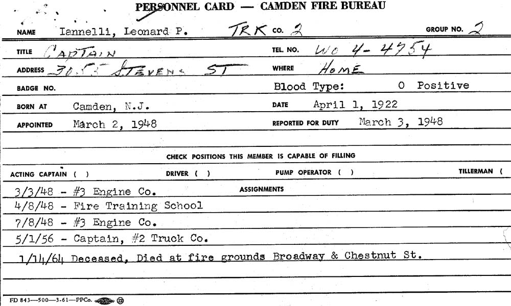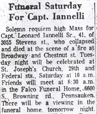 LEONARD IANNELLI was a second-generation Camden firefighter. His father, Frank Iannelli, died while fighting a fire as a member of Engine Company 9 on April 5, 1942. A June 1942 graduate of Camden High School, Leonard Iannelli had become a member of the Camden Fire Department by the mid-1950s, and had risen to the rank of Captain by 1964. He was serving as Captain of ladder company 2 when the year started. On the bitter cold night of January 14th, 1964, as members were standing roll call throughout the firehouses of the City, Box 328 tapped in for Broadway and Chestnut Street at 6:02 P.M. Engine Company 1, Engine Company 8, Ladder Company 2 and Chief Theodore Primas of the 3rd Battalion responded. Arriving units found heavy smoke pushing from the first floor of Walmart Tailors, a three-story building with apartments above. Police had already led nine occupants to safety before the arrival of the fire fighters. Engine 8 stretched the first line while Ladder 2 was ordered to force the door. Moments later, the plate glass windows failed and the store front lit up in a ball of fire. Chief Primas transmitted a second alarm and ordered the deployment of master streams. The fire extended to all floors of the building and broke through the roof as bitter cold winds whipped the flames out into the street. Extreme icing upon ladders, apparatus and streets surfaces made for treacherous operations. Deputy Chief Austin Marks who responded to the second alarm, special called an additional engine company and further ordered the recall of 35 off duty members , directly to the fire for relief purposes. As conditions deteriorated, a third alarm was transmitted to reinforce relief operations. Shortly after the third alarm, Captain Leonard Iannelli of Ladder Company 2 - the first due truck, collapsed on the sidewalk from a heart attack. Brother firemen rushed to his aid and Battalion Chief Primas personally attended to the unconscious officer. In the ambulance while enroute to the hospital, Chief Primas performed mouth to mouth resuscitation all the way. In spite of these efforts, Captain Iannelli was pronounced dead at the hospital. By this time, the fire had destroyed most of the building as the roof collapsed on to the top floor causing some wall sections to fall into Chestnut Street. Fire fighters concentrated their efforts on saving the adjoining Camden Roofing Supply Company. At one point a half-dozen master streams were directed into a narrow alley that separated the roofing supply from the fire building. Units were successful in protecting this exposure and firemen were also credited with saving the huge John's Bargain Store just a few doors down from the fire. Following a six hour battle, the blaze was controlled shortly before midnight although companies would remain at the scene for over 24 hours. On the following morning, the scene resembled an ice palace as firemen used axes and halligan bars to pry frozen hose embedded in thick street ice. Like his father, Leonard Iannelli died in the line of duty as a Camden fire fighter. Tragically, Captain Iannelli's brother, Carmen Iannelli would also give his life while protecting the City of Camden, in 1975. |