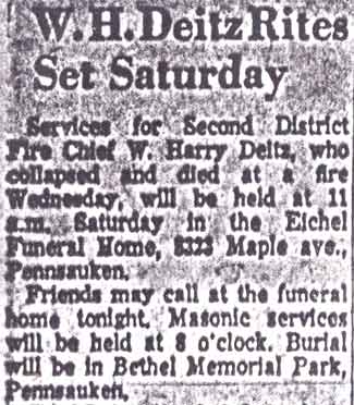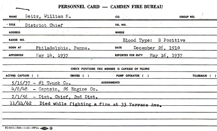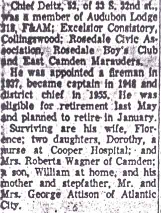 WILLIAM HARRY DEITZ was born in Philadelphia, Pennsylvania on May 16, 1937 to Frank C. and Caroline Deitz. By June of 1917 the family had moved to 153 Maple Terrace in Merchantville NJ, the home of his paternal grandfather, also named William H. Deitz. Frank Dietz was then a cab driver for the Black & White Taxi Company in Philadelphia. When the Census was taken in 1920, young William Dietz and his mother were still living in Merchantville. By the time the 1924 Camden City Directory was compiled, William H. Deitz's mother had married a Camden fire fighter, George W. Attison. The family was then living at 314 Royden Street in Camden NJ. When the Census was taken in April of 1930, William H. Dietz, mother Caroline and step-father George Attison had moved to 511 Royden Street. George Addison was still a member of the Camden Fire Department then, and while his stepson William was at the time working as a cook's helper in a hotel kitchen, he would soon follow in his stepfather's footsteps. Among their neighbors was young William Bovell, who lived around the corner (or over the back fence, depending how you looked at it) on Clinton Street, who sadly would die in a Japanese prison camp in the Philippines during World War II. Another neighbor, Mary McClyment, who lived on Williams Street, would make front page headlines more than once in Camden newspapers during the 1930s. William H. Deitz became a member of the Camden Fire Department on May 16, 1937. Her served for the first 11 years of his career with Ladder Company 1. He was promoted to Captain and assigned to Engine Company 6 at 337 North Front Street in North Camden on April 8, 1948. During this time he served at Engine 6 with, among others Captain Harold Megee, and Fire Fighters John "Shorty" Prucella, Mario Fattore, Philip Farrow, robert dukes, Harrison Pike, Edwin Callahan, thomas mcparland, Thomas Winstanley, James Stewart, William Reed, and Howell S. Needham. The Deitz family was living at 4120 Westfield Avenue when the 1947 Camden City Directory was compiled. On February 1, 1956 William H. Deitz was promoted to District Chief, the rough equivalent of today's Battalion Chief. The Deitz family remained East Camden residents in these years. Chief Deitz was active in the Rosedale Civic Association, the Rosedale Boy's Club and the East Camden Marauders, a youth sports organization. He was also a member of Audubon Lodge 318, Free & Accepted Masons. Chief Deitz suffered a fatal heart attack at the scene of a fire at 33 Terrace Avenue on November 14, 1962. Last a resident of 33 south 32nd street in East Camden, he was buried at Bethel Cemetery in Pennsauken NJ. He was survived by his wife, Florence M. Deitz, son William, and daughters Dorothy and Roberta, as well as his mother and stepfather. |