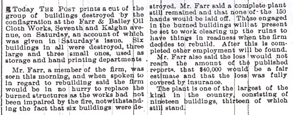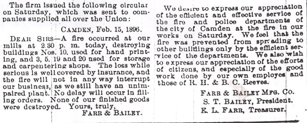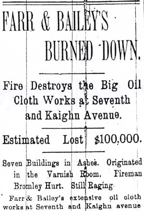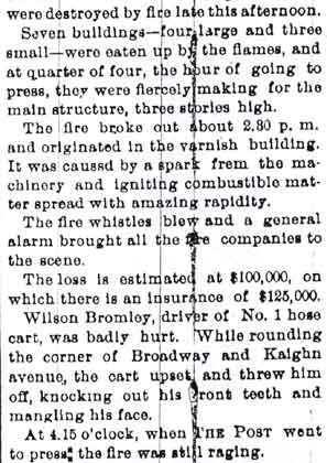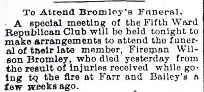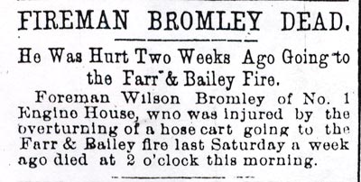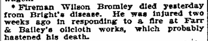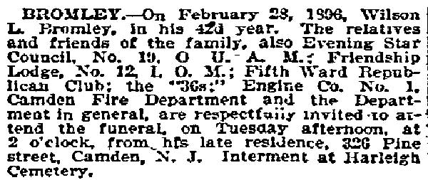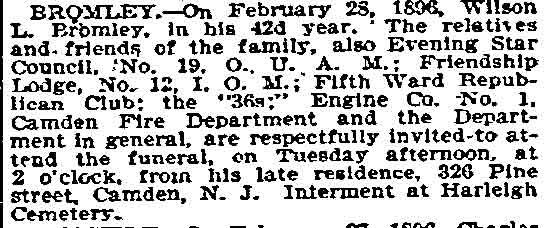 WILSON L. BROMLEY was born in New Jersey around 1853 to Joseph and Ann Eliza Bromley. Joseph Bromley worked as a boilermaker. The Bromley family was living in South Camden when the Census was enumerated in 1860. The 1860 Census list four children at home, Joseph, 10; Wilson, 8; Daniel, 5; and Eliza, 2. All three of the Bromley sons were at one time or another appointed to the Camden Fire Department, only Wilson, however, made a career of it. Wilson Bromley was working in a brass foundry in 1870. He married in the 1870s. When the Census was taken in 1880 he was living with his wife Hannah and son Joseph at 710 Oak Street in Camden's Fifth Ward. His next door neighbor was William Morris, both men were appointed to the Camden Fire Department in the spring of 1884. Oak Street was renamed Locust Street around 1883. Later in the decade, the family moved to 716 Locust Street. He was then working as a boilermaker. By 1886 he had joined the Camden Fire Department. In 1886 the Camden Steam Fire Engine Company Number 1 was located at 409 Pine Street in a three story 20 by 90 foot brick building (the old Independence Fire Company No. 3 engine house). The company's apparatus was an Amoskeag second class steamer (maker's plate 6318) drawn by two horses and one Silsby two wheel hose cart drawn by a single horse. The company was equipped with 1000 feet of good hose, axes, lamps, etc. The company roster included John Stockton, Foreman; G. Rudolph Tenner, Engineer; William Deno, driver; William W. Laird, stoker; Wilson Bromley and jacob f nesson, hosemen. call men were William Deith, andrew miller and William Bogia. Bromley and Bogia would later suffer line of duty deaths. Wilson Bromley and his family had moved to 326 Pine Street by 1890, only a few doors away from the firehouse where he was stationed. Wilson Bromley and Assistant Chief Samuel Buzine were injured on July 29, 1895 when Engine Company 1's hose cart overturned at South 6th and Royden Streets. They had been responding to a test alarm sent by the Fire Committee of City Council. Fire fighter Wilson Bromley was injured while responding the a fire at the Farr & Bailey oil cloth plant at South 7th Street and Kaighn Avenue on February 15, 1896. He died as a result of his injuries on February 28, 1896. |