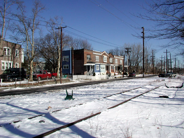 - February 7, 2004 Looking through the alley, one can see two houses on Merriel Avenue, & in the background the Westfield Tower senior citizens high rise apartment building |