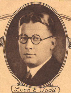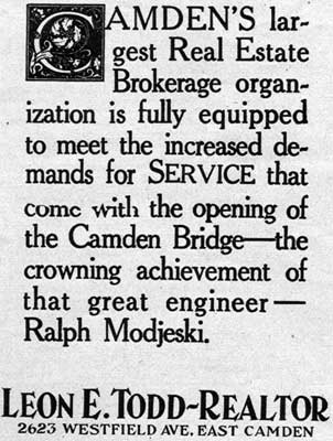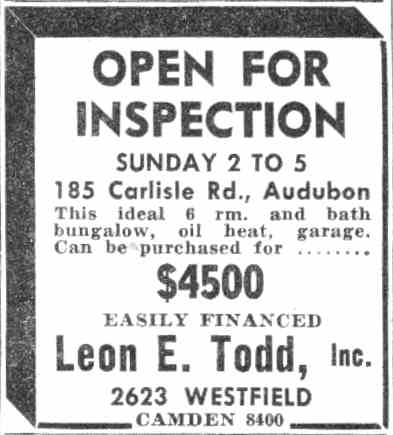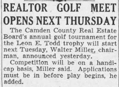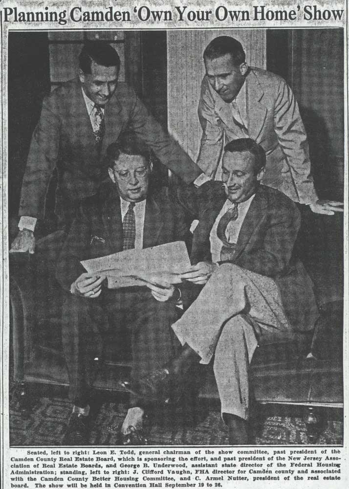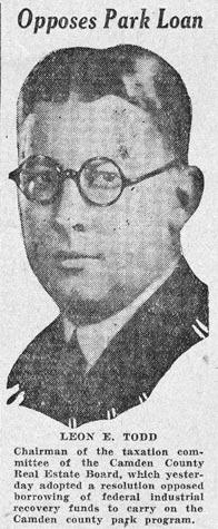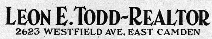 Leon Edgar Todd Sr. was born in Camden NJ on November 22, 1893. He operated his real estate agency for many years in Camden at 2623 Westfield Avenue, a building designed by the Camden architectural firm of Lackey & Hettel. Besides handling real estate transactions between buyers and sellers, Leon Todd developed several neighborhoods. One of his most successful projects were the row homes built between Rosedale Street and Westfield Avenue, below North 33rd Street, in East Camden, which were completed in 1925. He also was involved in the fundraising drive that culminated in the building of the Walt Whitman Hotel at Broadway and Cooper streets in 1925. Later in the 1920s, Leon Todd became involved in the development of Medford Lakes, and was instrumental in that town's becoming an independent borough. He had founded the Medford Lakes Colony Club in 1927, and developed the area, known for its log cabins. In 1939 Medford Lakes separated from Medford Township, and Mr. Todd was unanimously elected the town's first mayor. Leon Todd's son, Ensign Leon E. Todd Jr. was killed in action in the South Pacific while serving with the United States Navy on July 2, 1943. Leon E. Todd Sr. died while on vacation in Pompano Beach FL on February 10, 1959. |