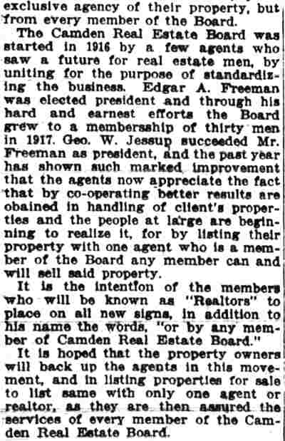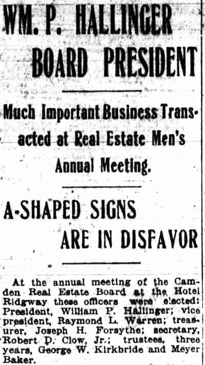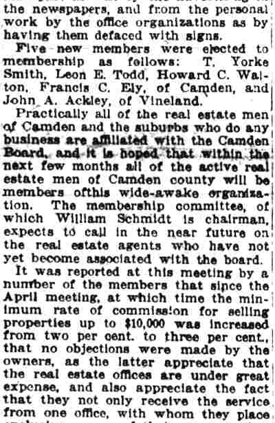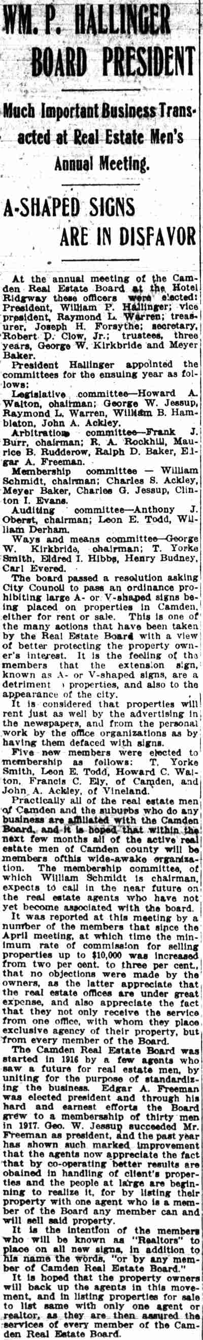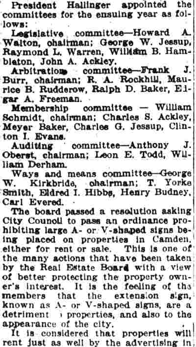 TO BE GUEST Of REALTY BOARD Edward J. Borden will be guest of honor tonight of the Camden County Real Estate Board at a banquet in honor of his election as president of the New Jersey Real Estate Commission. The banquet, to be held in the Camden Club, 315 Cooper street, will be attended by lawyers, real estate men and public officials from all sections of the state. The Real Estate Board, of which borden was thrice president, is giving the dinner. Among the guests who will attend are former U. S. Senator David Baird, Jr., Assemblyman Frank M. Travaline, Jr., Mayor Roy R. Stewart and other members of the Camden City Commission; Dr. Leon N. Neulen, city superintendent of schools, and Police Judge Garfield Pancoast. The speakers include William S. Abbott, president of the Camden County Real Estate Board; Leon E. Todd , former president; Vincent P. Bradley, of Trenton, retiring president of the New Jersey Real Estate Commission; Carleton E. Adams, of Atlantic City, vice president of the New Jersey Association of Real Estate Boards; Samuel P. Orlando, former assistant prosecutor of Camden county, and C. Armel Nutter, general chairman of the banquet committee. On the banquet program appears the gilded outline of a bee, typifying borden 's activities in the interests of real estate advancement in Camden county. Wayland P. Cramer is chairman of the program, committee. Chairmen of other committees follow: William A. Eppright, attendance; T. J., McCormick, entertainment; Carl R. Evered , door prizes, and Todd , speakers and guests. George B. Robeson, former president of the Real Estate Board, Is toastmaster of the banquet, which will begin at 7:30 p. m. |