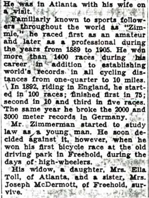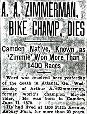 ARTHUR AUGUST ZIMMERMAN was the third child born to Theodore and Anna Zimmerman in Camden's Central Ward on June 11, 1870. Theodore Zimmerman was employed as a U.S. Postal Agent in Camden. By 1880 the family had moved to Wall Township in Monmouth County NJ, where Theodore Zimmerman operated a hotel. Long before Lance Armstrong was born, Arthur Zimmerman dominated the sport of cycling as no man ever had previously. Between 1889 and 1905 he rode as both an amateur and professional bicycle racer. At his peak he was without question the world's champion in that sport. He won 1400 races during his career and at one time or another set the world record in every cycling distance from one-quarter to 10 miles. Known to his fans as "Zimmy", Arthur A. Zimmerman had moved to Freehold NJ, in the 1880s. He had been a law student, but gave that career up for cycling. In Freehold he started racing, as an amateur in 1889. In those days racers used the high wheel bike. Arthur Zimmerman rode competitively in Europe and the United States. His dominance of competitive cycling in 1892, when he started 100 races, winning 75, coming in second in 10 races, and third in five, ensured his world wide fame. Zimmerman was the first American named as World Champion Amateur cyclist when he won both the one mile and ten mile events in Chicago, Illinois in 1893. David Metz, who operates the Metz Bicycle Museum at 54 W. Main St. in Freehold, said "Arthur Zimmerman was the world's first bicycle racing champion in the 1880s. When he retired in 1895, he opened the Arthur A. Zimmerman Cycle Co. on Elm Street in Freehold. From 1895 to 1900 he manufactured several models of the 'Zimmy' bicycle, including the one I have on display." Arthur A. Zimmerman settled in Asbury Park NJ around 1916. He passed away in Atlanta GA on Wednesday, October 21, 1936 while visiting his daughter. Today the Century Road Association sponsors a race in New York where the Lou Maltese Memorial & Arthur Zimmerman Cup are awarded. |