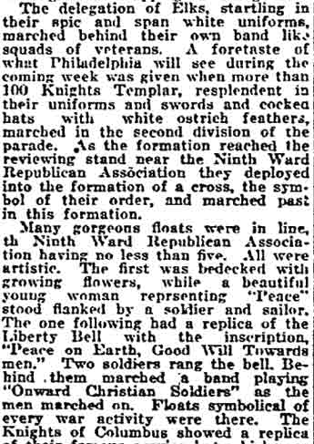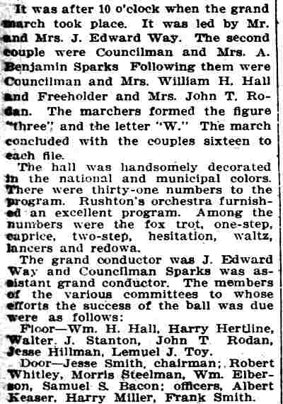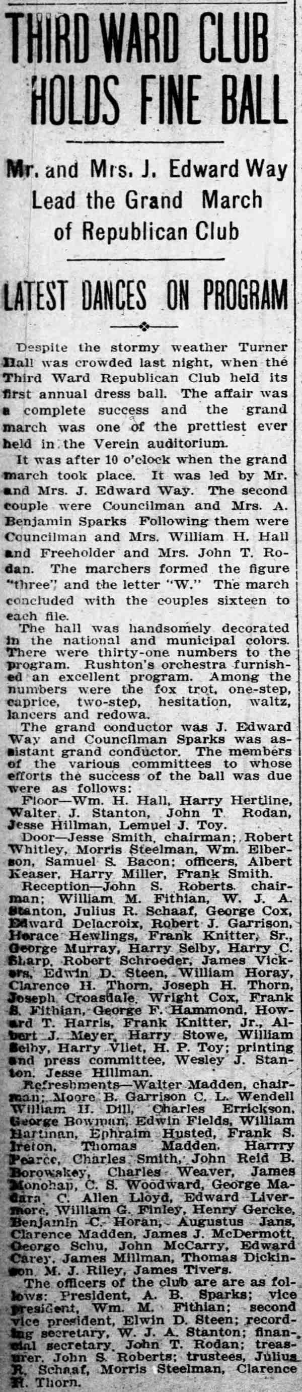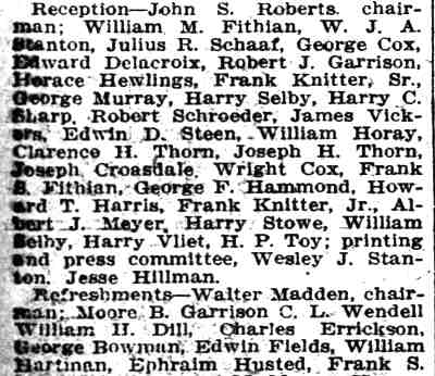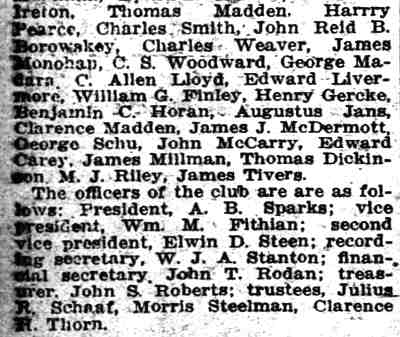 Sparks William H. Hall - John T. Rodan - Rushton's Orchestra - Harry Hertline - Walter J. Stanton - Jesse Hillman Lemuel Toy - Jesse Smith - Morris Steelman - William Elberson - Samuel S. Bacon - Albert Keaser Harry Miller - Frank Smith - John S. Roberts - George Murry - Harry Selby - Harry C. Sharp Robert Schroeder - James Vickers - Elwyn D. Steen - William Horay - Clarence H. Thorn - Wright Cox Frank S. Fithian - George F. Hammond - Albert J. Meyer - Harry Stowe - Wesley J. Stanton Thomas Dickinson - Edwin Fields - William H. Dill - Frank S. Ireton - Gustav Jans Charles H. Errickson - Henry Gerke - James MacDemott - George Schu - William M. Fithian Julius R. Schaaf - James Monahan - Thomas Madden - George Cox - Robert J. Garrison |