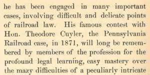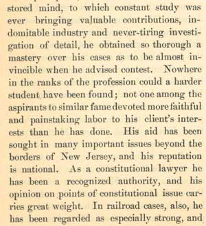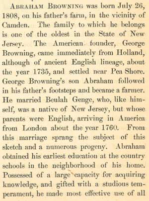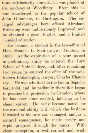 ABRAHAM BROWNING was a prominent attorney in Camden who rose to the post of New Jersey Attorney General during his career. Born near Camden on July 26, 1808, he entered the New Jersey Bar in September of 1834. In 1843 he served with John W. Mickle as delegates to the New Jersey Constitutional Convention. He was named Attorney General in January of 1845, and served until 1850. In these times he was a principal in the Market Street ferry.. For $5185 Robert K. Matlack and Abraham Browning bought a tract of 1037 acres located in Gloucester and Cumberland Counties at a public sale on May 29, 1858. In 1860, Thomas Wilson purchased a large tract of land for $10,000 from Matlack and Browning. The Pennsylvania, Reading, and Seashore Railroad extending from Camden to Millville, branched off to connect with the seashore resorts. In 1863 this point was called Newfield, and Newfield became a borough in 1924. He was a Democrat, and was a delegate to the Democratic National Convention from New Jersey in, 1864. He also was a founder and the first president of the Camden County Bar Association. Alfred M. Heston, in his two-volume work, Jersey Waggon Jaunts, published in 1926 (Camden, NJ, Atlantic County Historical Society, 1926), twice credits Abraham Browning of Camden with coining the name at the Centennial Exhibition in Philadelphia on New Jersey Day, August 24, 1876. On page 310 of volume 2 he writes: "In his address Mr. Browning compared New Jersey to an immense barrel, filled with good things to eat and open at both ends, with Pennsylvanians grabbing from one end and the New Yorkers from the other. He called New Jersey the Garden State, and the name has clung to it ever since." The problem with this is that the image of a barrel tapped at both ends dates back at least to Benjamin Franklin, so this statement crediting Browning with naming the Garden State can not be taken at face value. Abraham Browning made his home at 127 Market Street. Among his neighbors were William Calhoun, Sheriff of Camden County in the late 1870s and early 1880s, Charles Kalt, and prominent attorneys James B. Dayton and Peter L. Voorhees. Abraham Browning passed away in Camden on August 22, 1889. The Abraham Browning Council No. 122 of the Junior Order of United American Mechanics, a fraternal organization that was active in Camden from the late 19th through the mid-20th centuries, was named in his honor when it was incorporated in 1898. Abraham Browning is not to be confused with Capt. Abraham M. Browning (1843-1880), who owned a farm called Cherry Hill Farm in what is now Cherry Hill NJ, on the site of the present-day Cherry Hill Mall and Loews Theater complex. |