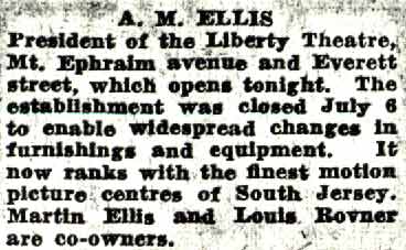 ABRAHAM M. ELLIS was the president of the Broadway Amusement Company, which owned the Broadway Theater in Camden, in the 1930s. He also was a partner, with Martin Ellis and Louis Rovner, in the ownership of the Liberty Theater on mount ephraim avenue at Everett Street, in 1936.