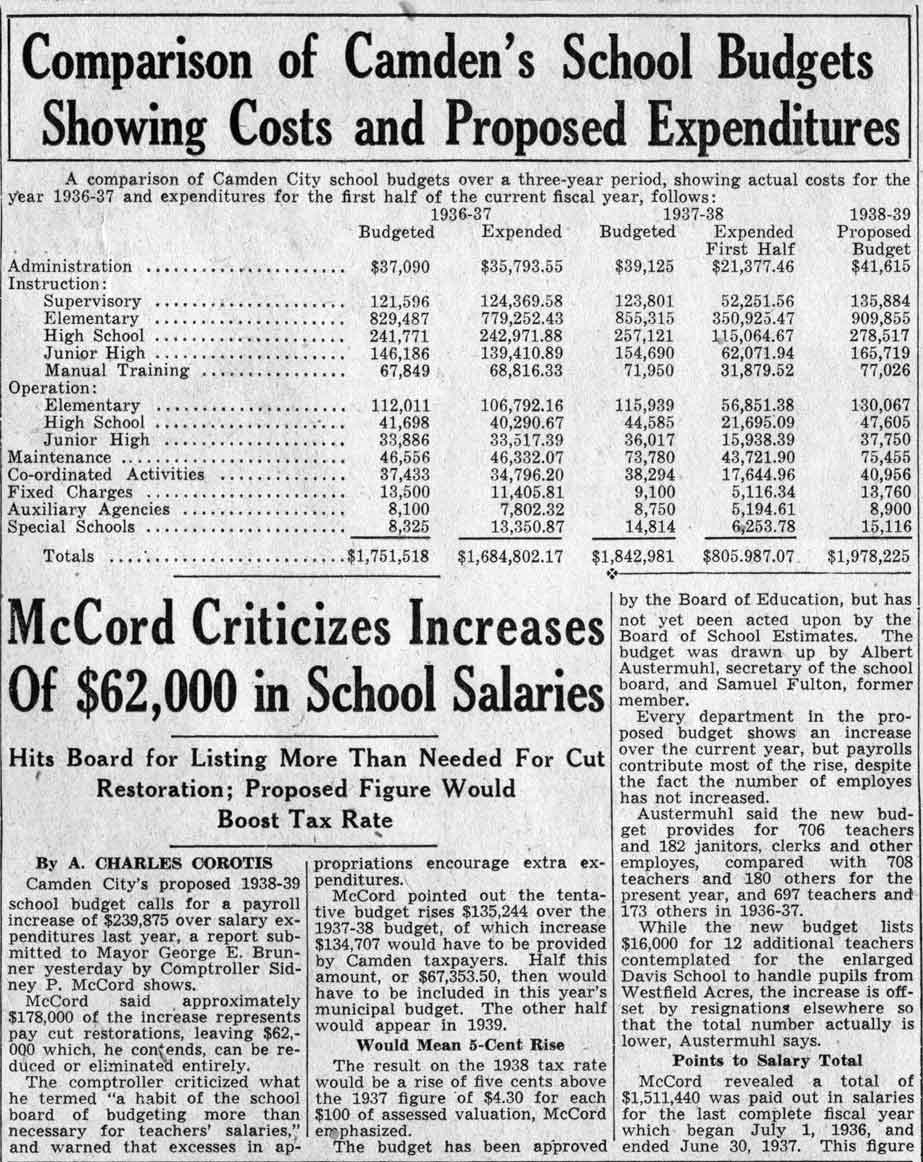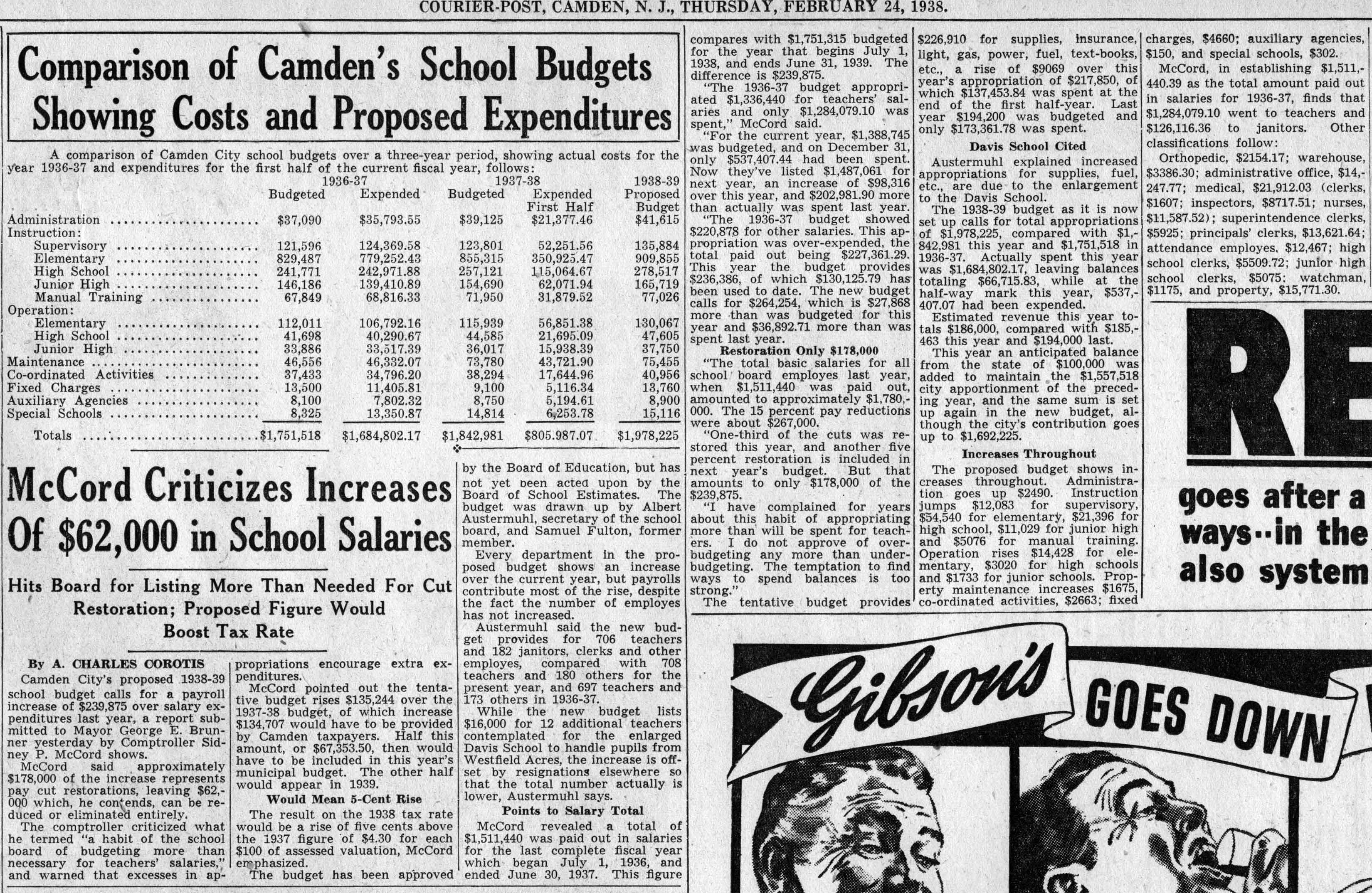 REVENUES RISE $1,268,771.83 IN 1937 OVER PREVIOUS YEAR Camden City collected $1,268,771.83 more in current and delinquent taxes and miscellaneous revenues in 1937 than in 1936, it was revealed in an official report prepared by Comptroller Sidney P. McCord arid released yesterday by Mayor George E. Brunner. Current tax collections increased from $3,951,300.99 to $4,153,493.71, a gain of $202,192.72, while receipts from tax title liens more than doubled as a result of the intensive liquidation campaign carried on by the department of revenue and finance through its certificate bureau, headed by Isadore H. Hermann. Whereas revenue from liens amounted to only $229,027.99 in 1936, last years' collections from this source totaled $482,562.68. Delinquent tax collections were $14,667.23 and under 1936, due mainly to the improvement in current collections in 1936 as compared with prior years, which left less taxes outstanding at the end of the year of levy. Cross-Receipts Levy Is Windfall Contributing virtually half the record-breaking revenue increase was the windfall from gross-receipts taxes. Against an anticipated $322,648.31 and 1936 receipts of $107,265.09, the city actually got $728,068.15. In addition it collected $284,939.46 in franchise taxes, compared with $185,008 for 1936. These two gains followed the decision by the Court of Errors and Appeals holding State Tax Commissioner J. H. Thayer Martin without authority to disregard municipal assessments of utilities personal property and substitute his own figures, derived from its "unit-capacity-production" yardstick. The largest advances in miscellaneous revenues, exclusive of these two sources, came from miscellaneous interest and costs. which jumped $79,558.83, and surplus from the water bureau, which jumped $65,999.21. The water bureau, operated under Commissioner Frank J. Hartmann, turned over to the city treasury $253,804.24 as against a 1936 total of $187,805.03. Water collections, aggregated $619,451.12, made up of $325,984.92 in current fiat rates, $206,431.53 in current meter, $52,213.36 in one-year delinquent flat-rates, $19,625.37 in one-year meters and $15,195.95 in miscellaneous revenue. Other Sources Swell Revenue The 1936 total was $570,919.01, broken down into $281,861.27, current flat; $198,972.68, current meter; $72,156.91 delinquent fiat and $17,928.15 miscellaneous. Other sources of revenue which showed increases over 1936 were bank stock taxes, city clerk's office, city property, District Court, building bureau, treasurer's office, cemeteries, municipal markets and Convention Hall. Accounts that decreased were the highway bureau, department of public safety, Recorder's Court, electrical bureau, health bureau, plumbing inspectors, radio station WCAM, South Jersey Port Commission and assessments. Budget Estimates Far Exceeded The Port Commission, which for years had returned only $50,000 of the $190,000 which the City annually appropriates to it, and from which Mayor Brunner received $66,750 in 1936, dropped back to $56,750 last year. Actual receipts exceeded budget estimates of miscellaneous revenues last year by $694,003,06, of which surplus $405,419.84 came from gross receipts taxes while franchise taxes contributed $99,939.46. In 1936 the receipts were $108,062,27 above anticipations, marking the first time in many years that a deficit did not exist. A favorite trick of previous administrations was to inflate miscellaneous revenue estimates beyond all reasonable expectations to hold down tax levies and rates.. |