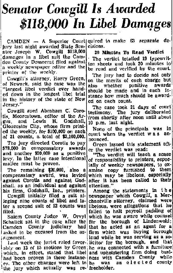 retained by the State Department of Education was paid beyond the statutory Farley Bill Vindicates McCord Comptroller Sidney P. McCord, of Camden, has argued against payment, of interest on the 90 percent from the start, and has steadfastly refused to honor bills totaling $83,-39.35, presented periodically by the county. Brunner lauded McCord for his refusal to pay. He said the comptroller's action will represent a clear saving 'to the city if the Farley bill becomes law. Meanwhile the county appropriated the sum in its 1937 budget under orders from State Auditor Waiter R. Darby, although Darby has railed since that counties need not budget interest on delinquent state taxes owed by municipalities. The county never paid the money to the state because the city refused to pay the county, and Darby ordered it held in reserve pending ยป settlement. If A-122 is enacted the city automatically will be relieved and the reserve will be freed, available for general purposes once the Board of Freeholders acts to divert it back into the treasury. Then enough of the $83,000 can be added to the tentative $400,000 appropriation of surplus revenue to hold the tax levy down to last year's level, without disturbing the $850,000 surplus remaining. Budget Meeting Tomorrow The county budget is scheduled for introduction on first reading at a special freeholders' meeting tonight. Present plans call for approval with the higher levy and subsequent amendment before public hearing and adoption, providing the bill is passed. That the measure will become law was predicted by legislators and observers. A vote was taken in the Republican majority caucus of the House yesterday, without a single dissenter. Farley sought immediate action to aid Atlantic City in preparation of its 1938 budget, but so much objection was voiced to consideration of bills on the day they were printed that the matter was held in abeyance. The possibility exists that both houses may act next Monday under suspension of rules, considering the bill emergency legislation because of its effect on budgets. According to the office of County Treasurer Edward J. Kelleher, Camden is the only municipality in the county affected by the measure. All Interest Paid on 10 Percent Camden, acting upon the advice of its comptroller, has refused to pay the claim. mccord insists the bill does not represent a legitimate obligation. He points out that of state school taxes paid by any district, only 10 percent goes to the state and the rest is apportioned among the municipalities of the county. Camden paid its 90 percent to the county with a warrant, on the basis of which the county issued its own warrants to the other municipalities, thereby making the funds available without imposing hardships on any districts. All interest due on the 10 percent was paid, mccord pointed out. During a conference with Darby in Trenton last year McCord warned him that any attempt to compel inclusion of the appropriation in the budget would result in court action, and Mayor Brunner supported him. Darby insisted the item would have to be budgeted, but a last-minute move by the Legislature deferred for a year certain drastic features of the new budget act and automatically permitted exclusion of the item. Darby is expected to force the appropriation this year, however, and Camden is prepared to institute legal action. Passage of the Farley bill would clear the situation. Scrip Practice Recalled The bill's statement of purpose explains the matter clearly. It follows: "In 1933 the school scrip act was passed. The purpose was to allow municipalities which could not meet their state school tax in cash to do so in scrip. There was a provision that each municipality might pay to the county treasurer its school taxes in scrip except the 10 percent to be retained by the state. "Under the old law the full 100 percent would be paid to the State Treasurer in cash, he would retain 10 percent for state school purposes and the balance of 90 percent would be distributed among the various school districts entitled to; it. "Under the provisions of the 1933 act the scrip was sent directly to the county treasurer, who in turn would distribute it to the school districts on warrants of the county school superintendent and transmit directly to the state treasurer, the 10 percent due to the state. "In some instances the county treasurer, because of the financial inability of certain municipalities to pay the state school taxes in full when due, was late in transmitting to the state treasurer the 10 percent due the state. Because of uncertainty of the law covering this situation, the state treasurer is now demanding of the counties which were late in transmitting the state's 10 percent under the 1933 act and amendments thereof, interest on the full 100 percent and not on the 10 percent alone, even though the school districts making payment in scrip have delivered the school scrip in time, and also the receiving districts had received their school scrip in full and within time. "There is no reason why the county treasurer, who is merely a disbursing agent, should be called upon to pay to the state any more than interest on the delinquency due the state, to wit: on 10 percent of the state school tax, especially in view of the fact Section .3 of Chapter 156 of the Laws of 1933 provides that 'the county shall be relieved of that part of its obligation to the state for 90 percent of the state school tax when the county treasurer shall have filed with the state treasurer receipts from the custodians of the several school districts.' ". |