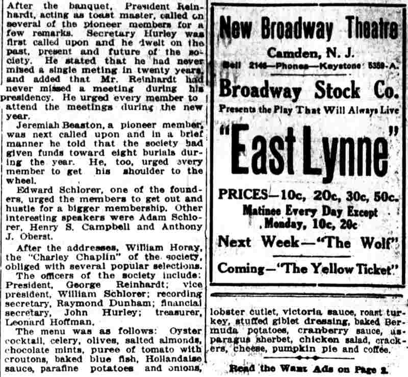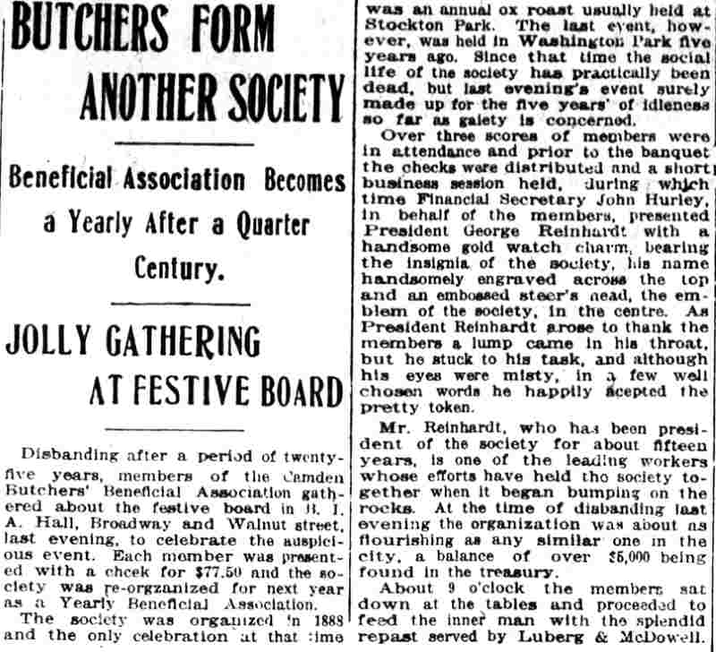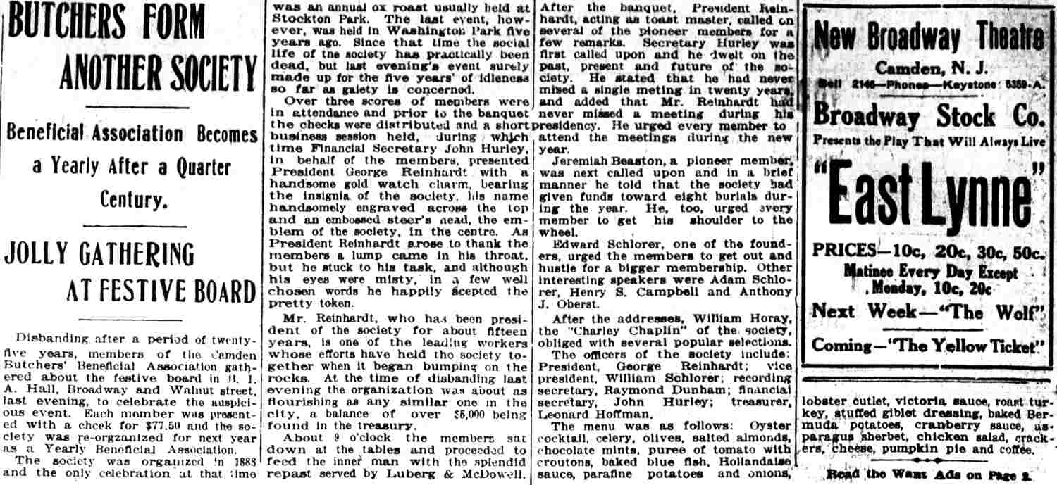 ADAM SCHLORER had established a meat business in 1883 in Camden. The business was originally at Second and Arch Streets, moved to 800-804 Chestnut Street in 1888, and would remain there into the 1950s. By 1887 Adam Schlorer was living at 415 Chestnut Street. His brother Edward Schlorer, also a butcher, lived next door at 413 Chestnut. After marrying Wilhelmina Zinn in Camden in 1885, son William Schlorer was born in 1887, John A. Schlorer came in 1889, followed by daughters Elsie and Amelia. In early 1888 Adam Schlorer set up a second location at the southeast corner of South 8th & Chestnut Streets. In 1906 he consolidated the business at the South 8th & Chestnut Street location, where he also made his home. During the 1910s he served as a member of the Board of Directors of the broadway trust company bank, at broadway and Walnut Street. He retired in 1926. Sons John and William would carry on the family business. Adam Schlorer passed away at his home in Wildwood NJ on January 25, 1928. John A. Schlorer would remain with the family business, A. Schlorer & Sons, his entire life, before suffering a fatal heart attack while visiting his daughter in Haddonfield NJ in July of 1950. By 1956 A. Schlorer & Sons had shut its doors forever. |