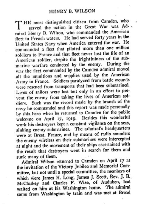 Henry Braid Wilson Jr. was born on Mount Vernon Street in Camden NJ on February 23, 1861 to Henry Braid Wilson Sr. and his wife Mary Ann. His father was a prominent citizen in Camden NJ, a successful businessman who served on City Council, on the the Commission of Public Instruction, the precursor of the city Board of Education, and as Postmaster for Camden at different times. Henry Wilson Jr. enrolled at the United States Naval Academy at the age of 15, and graduated in 1881. He soon began his illustrious Navy career, first as a training officer for apprentices, then serving in the West Indies, Bering Sea, Pacific Ocean and the Great Lakes. Wilson saw action in the Spanish-American War as a lieutenant, and was "highly commended for coolness and bravery," says a newspaper account. In
