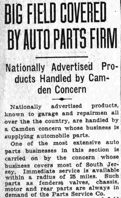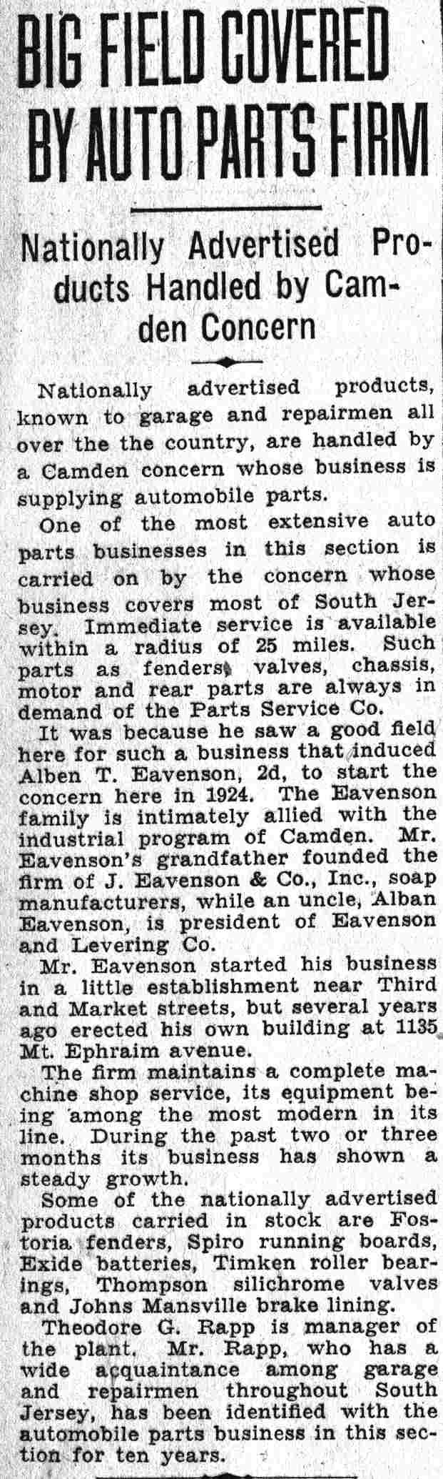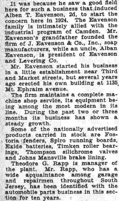 ALBAN TAYLOR EAVENSON was born in Philadelphia on November 9, 1895 to Louis L. Eavenson and the former Rachel T. Scott. His grandfather, Alban Taylor Eavenson was the co-founder of the Eavenson & Levering wools scouring business that was located at 301 Jackson Street in Camden. His great-grandfather, Jones Eavenson, founded the J. Eavenson & Sons Co., which manufactured soap products in Camden for over 100 years. In the early 1920s and 1930s Alban T. Eavenson II operated an auto parts concern, the Parts Service Company in Camden. The 1924 City Directory shows the business at 32 North 3rd Street. By 1926 he had moved to an old building at 1139 Mt. Ephraim Avenue, temporary quarters while a new building at 1135 Mt. Ephraim Avenue was being built. By 1928 the new building had been completed and occupied. However, by 1934 Mr. Eavenson, a Pennsylvania resident, had moved his business to Norristown, Pennsylvania. Alban T. Eavenson II died of a heart attack at Taylor Hospital in Ridley Park, Pennsylvania on June 9, 1951. |