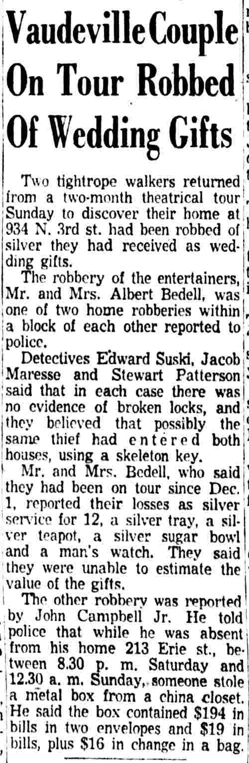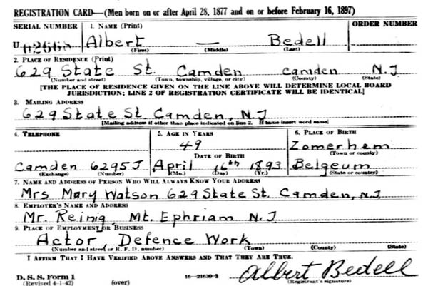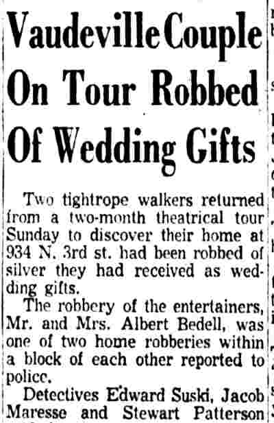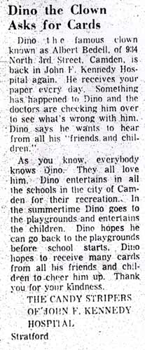 ALBERT BEDELL was born on April 16, 1893 in Zomerhem, Belgium. According to the 1930 census, he came to America in 1913. The 1930 Census shows that Albert Bedell had not yet become a United States citizen. He was living in Paterson, New Jersey, where he worked as a silk weaver. He had been married to his wife Eva for approximately five years, and there was a son, Norman, aged 4 at the time of the Census. The Bedells divorced at some point during the 1930s. By 1940 Albert Bedell was living in Camden, at 629 State Street, boarding with Mrs. Mary Watson. When he registered for the draft in the spring of 1942, he listed his occupation as "Actor, Defense Work", and stated that he was employed by a Mr. Reinig in Mt. Ephraim, New Jersey. He and his wife developed a tightrope walking act which they took on the road for weeks at a time with. It appears that he remained in North Camden throughout the 1950s. By February of 1954 he and his wife were living at 934 North Third Street. He lived at this address for the rest of his days. Albert Bedell at some point in his life also became a clown, and developed an act with "clown dogs" as well. By the 1960s he was entertaining children in Camden schools throughout the school year and on the city playgrounds during the summer months. Albert Bedell had fallen ill by mid-July of 1967, and was admitted to Kennedy Hospital in Stratford NJ. He passed away in August of that year. |