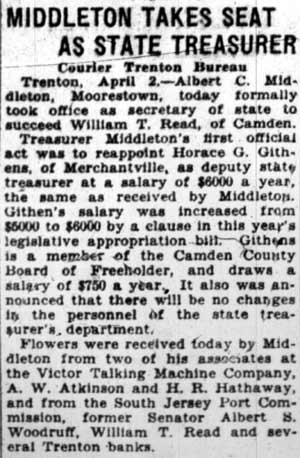 A member of one of South Jersey's oldest Quaker families, Mr. Middleton was educated in Friends' schools in Camden and in Philadelphia. He early made his mark in the business and political world, but except as State Treasurer and membership on the South Jersey Port Commission, which he held to his death, never occupied public positions. He was for many years a director of the First Camden National Bank and Trust Company, of the old Camden Safe Deposit and Trust Company, and of the Camden Fire Insurance Company. In 1928 he was elected by joint session of the Legislature as State Treasurer, and was re-elected in 1931. He was for years a member of the Union League, in Philadelphia, and of the old Camden Republican Club when it was located at 308-312 Cooper street.