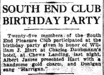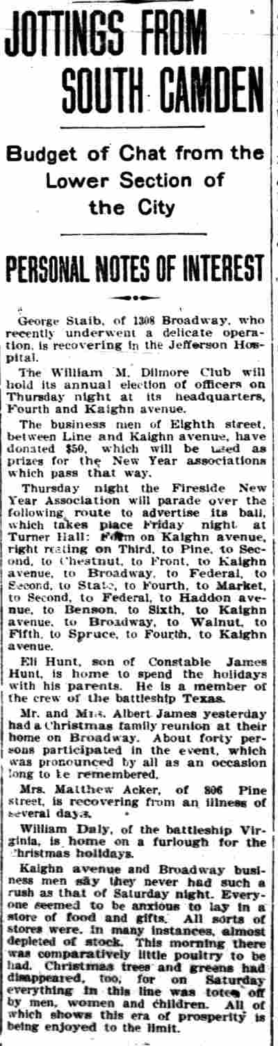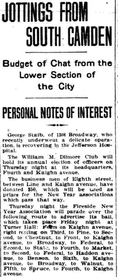 Old Centreville Families WHEN a larger community annexes an adjoining district the newer area is generally regarded, for a time at least, as a step-child. Older residents of East Camden will bear out that truism when they recall how difficult it was to obtain improvements. Years before, Newton Township which became part of Camden, had had the same experience. Under such circumstances, it requires tireless energy on the part of leading men to get what their district needs. Demands often go unheeded unless the community is fortunate in having those of spirit who insist on street improvements, water extension, lighting facilities and schools. That was more in evidence half a century ago than now, of course, for Camden itself was little more than a large village. Down in Centreville there were men who looked after the interests of their constituents, who slowly but surely obtained, improvements and who insisted on being recognized by the powers that be. No one may think of old Centreville without thought of Dr. John W. Donges, whose value to not only that section but Camden at large, has been expatiated upon in these annals. He was not only a leading physician, with a practice extending into Camden, but a leader in many civic movements, and any article on that era would be incomplete without allusion again to the doctor whose services as a real family physician are part of the traditions of many old families. Came Here In 1872 He came here in 1872 from Schuylkill County, Pennsylvania, when his health was affected by overwork through loyalty to his patients. He bought the drugstore at Ferry Avenue and Broadway, remaining there for many years. It was there Supreme Court Justice Ralph W. E. Donges spent his boyhood. There, too, Dr. Clarence B. Donges and Attorney Raymond Donges were boys. Grant E. Kirk, clerk in his store, later becoming a physician and for several years a member of council and at one time being prominently boomed for mayor, married their sister. Dr. Donges was elected to council in 1878 on the Democratic ticket, itself an evidence of the high regard in which he was held, for the Eighth Ward generally was rock-ribbed Republican. Until the early part of this century he resided in his old place, but later went to Broadway and Clinton Streets. In later years, after he had retired, he was city assessor, "just to keep busy." He died a few years ago, well in his 80s, mourned by a great host of Camdenites. There was another widely known Centreville family of the old days, that of Samuel Mills, who had his own abattoir at Broadway and Jackson Street, where city-dressed meats were provided before the days of car refrigeration brought supplies from the great packing places in Chicago. His son, Charlie, was long a member of the Board of Education, while another, William, was a city councilman. Edward Milis, another son, was excise commissioner 35 years ago in the days when there was plenty of trouble with Sunday sellers. Cornelius Schepperkotter was a factor in politics down that way, too, having a grocery store on Ferry Avenue at Ninth, later moving to the southwest corner when the Charles Sumner School was built. That school was torn down two years ago for the recreation center. Schepperkotter was a member of the old Board of Public Instruction in the late 90's, named by Mayor Cooper B. Hatch. In later years and until his death, he was superintendent of Evergreen Cemetery. He was father of Mrs. Frank S. Albright, wife of City Clerk Albright. Frank Covely Shortly after the New York shipyard was opened, there moved to the "Hill" Frank D. L. Covely, who became a joiner and for years was foreman of the joiner shop. He was widely known as a secret society man and also as an effective campaign speaker for the G. O. P. He was a member of the Board of Education. He sought to go to council, but that was at the time Kirk was a power in the ward. Covely laughingly used to tell of a meeting all set for him from which all save the colored folk were drawn away through strategy of his party opponents. But for ten years he was a member of the Board of Recreation Commissioners. That movement owed much to his work. Nor did he forget his colored friends, for he had a playground established for them at Ferry Avenue and Phillips Street and the large one [Staley Park- pmc] at Seventh and Jefferson streets. Long afterward that was named for another city official, but Covely's friends said it should have been for him, as a monument to his services for the boys and girls of Centreville. He died a few years ago at Bellmawr in his 70s, after a hectic experience as a chicken raiser at Port Norris. There, too, was William Dorrell, superjntendent of the old "Narrow Guage" who was one of the leading spirits in the paving of Broadway, nearly 60 years ago the big issue of that section. He lived in a house along the railroad still standing, as the hospital and dispensary of the shipyard. Mention has been made of the Ferrises, the Helmbolds, the Yeagers, of Squire James D. Chester and Squire F. Joseph Rouh. There was also William O. Thompson, the leading contractor down that way for many years and Theodore Tiedeken, who established the wagon works on Van Hook Street, Martin Ewe, who had the hotel at Broadway and Emerald, and down the street a bit James Croker, who operated Tammany Hall. Forty years ago there was one of the best young athletes of the city, Thomas Nicholas, now retired Camden fire chief. He was down in old no. 3 with Bill Rose, long a fire captain, Bill Miller, al james, Sam Lodge, gus dold and Jim Ware. Many of these old timers have passed on, but others are still in the flesh but scattered to all parts of the city but it may be said the survivors look back on the days that were down there in Centreville with an interest that does not dim with the passing years. |