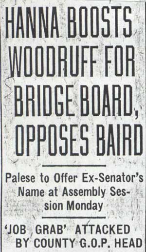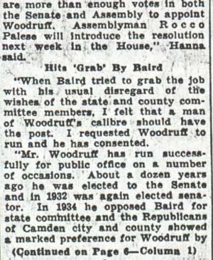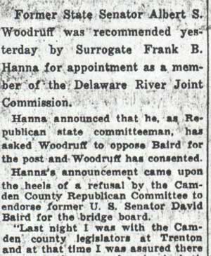 SPAN JOB Line-Up of Solons Supporting Woodruff or Baird Remains Undisclosed Trenton, Jan. 31 - The line-up in the Legislature on election of either former Senator Albert S. Woodruff or David Baird Jr. as Camden member of the Delaware River Joint Commission remained undisclosed as both houses adjourned tonight. No election resolution was introduced in either the Senate or the House, with supporters of both candidates seemingly reluctant to force the issue without assurance of sufficient votes. Today it was understood Assemblyman Rocco Palese was prepared to introduce a resolution in the Assembly for Woodruff, claiming he had enough voted pledged. It was also reported that Baird's backers were trying to delay action on the job at the present time due to the quick and favorable response which greeted the Woodruff candidacy in the Republican clubs of Camden city and county. |