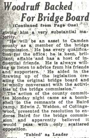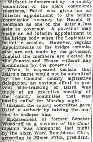 The way some of the members of the Camden County Republican Committee are behaving these days, the Democrats can stay home on their own meeting nights … The Republicans are doing their work for them … Now some 70 of the Republican committeemen have signed a petition to give Baird a job that won't pay him anything… It's about time they're giving him something … They took the U. S. Senatorship away from him … Moore took the governorship away from him … Woodruff took the state committeeship away from him … The New Deal took the city commission away from him … The New Deal took the freeholders away from him:.:. Somebody always is taking something away from Baird … It isn't a question of Baird's ability to fill the bridge job … The only one to even mention that as an issue was Fred von Nieda … He's a city commissioner, you know … It's a matter of principle … At least, that is what Florence Baker, state com-mitteewoman, says … Mrs. Baker is telling Senator, Clee and others at Trenton that they owe it to Baird to support him for the job because he has always helped Clee …Let's, in all fairness to Baird, look at the record … In the primary, during an address at the First Ward Republican Club, Dave Baird stated he was for Cliff Powell against Clee … Mrs. Baker did not come out against Clee … She didn't come out against Powell. Instead, she said she was neutral. In the general election, Mrs. Baker said she was for Clee. Baird never said he was for Clee. (If he had, Clee's majority of 35,000 would have gone to Moore) … So we don't think that Mrs. Baker is very convincing when she tells Clee that baird helped Clee … She said that the Camden county legislative delegation helped Clee's program against Hoffman. Was baird a democrat last year? Sheehan, Roye and Lodge were … Burling was a Republican, and helped Clee, but he is not for baird. perhaps it was because baird "helped" Clee's program against Hoffman opposition, that Hoffman slipped in baird's appointment without the knowledge of Burling or the state or county committee members .... Mrs. Baker stated at a banquet that she has copies of the Courier-Post in 1931 in which baird was praised for his bridge work .... If anyone cares to look at our files, we will show what Mrs. Baker said about baird in the neighborhood of 1931. ... Or what we said about baird at other times .... Also what Mr. van Nieda and Frank Travaline said. But enough ado about nothing .... All we've done is talked about baird when it had been our plan instead to talk about politics. * * * The political ax is hanging over the head of a Mt. Ephraim official on the charge he is assuming too much authority ..... The political ax hanging over the heads of the Delaware township cops is about to be enmeshed in litigation .... One of the policeman is a member of the P.B.A. which will carry his fight into court in a case that will be a precedent for the other township cops, too .... Herb Taylor will be county engineer if it goes to a Republican .... It may be a Democrat however, and newest among the candidates, on that side of the ledger is former City Commissioner Carroll P. Sherwood .... There may be only one assistant county solicitor instead of two in which case it will probably go to Carleton Rowand, city school board member .... By the way, don't, be surprised if under the new contract between the city and county on maintenance of the City Hall, the city takes full control of the building with consent of the county ... Which will be tough on some of the county jobholders ...* * *. Assemblyman Allen now denies he wants all us newspaper fellers to go to the guillotine ... He says he meant lawyers ... Charlie Humes wants to be guillotined ... Standing up ... Incidentally, Charlie is defending his last-place position in the ping-pong league tonight… Firefighter Lennox went to church the other day… And found the roof braced up. When will the borough of Merchantville fix up that dangerous hole in Browning road at the railroad tracks north of Maple Avenue? ... Or is that in the township? Whenever the state police want Detective Wojtkowiak at the prosecutor's office, ·they ask for "Sergeant Watchyourcoatandhat" … The Mt. Ephraim commissioners are going to buy a police car for their chief ... He's also in for a pay rise ... Bellmawr's chief of police won't get the salary increase he wants, but he will get an additional allowance for the use of his car ... Runnemede's two new cops will also get pay increases … The other day an alarm was sent to every police department in the county and also to the Philadelphia cops that a car had been stolen in Audubon ... The culprit is glad no cops saw him ... He was none other than a police official who wanted to borrow a storekeeper's car but took the wrong one by mistake ... His face is almost as red as Vince (deP) Costello's ... At the K. of C. roller skating exhibition the other night, Luke McKenna did a few fancy turns ... Vince recalled he, too, had been pretty good at one time, so he essayed to show his friends ... His intentions were better than his legs, and a couple of well--wishers followed him around the floor with a stretcher. This all happened quietly The Runnemede police received a complaint from two storekeepers ... It appears that a group of high school students from another town had stopped off at Runnemede to purchase some cakes ... Several other articles disappeared from the stores ... A few days later the dean of the high school went to Runnemede paid one shopkeeper $10 and the other $2.60 ... Representing the goods they said were taken ... Aside to that clairvoyant weakly editor who reported yesterday that Joe Van Meter is going to be the Republican nominee for sheriff: A sheriff cannot succeed himself in New Jersey ... Silvio Fittipaldi, former Haddon Heights High star, is a veterinarian and doing nicely ... A Philadelphia college professor who lives in Pennsauken uses his spare time