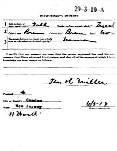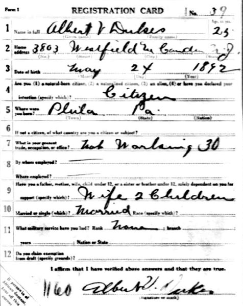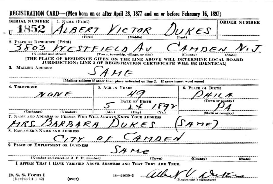 ALBERT VICTOR DUKES SR. was born in Philadelphia on May 2, 1892 to Benjamin and Jane H. Dukes. The 1900 Census shows that his family had moved to Haddon Township, New Jersey. Besides Albert, there was an older step-sister, Mary McCoy, and younger siblings Benjamin F. and Sarah Ruth Dukes, as well as his grandmother Matilda Garrett. Benjamin Dukes worked as a compositor. Albert V. Dukes Sr. was living in Camden when, in Camden on September 8, 1914, his wife Barbara gave birth to there first child, Albert V. Dukes Jr. Two more sons would follow, Charles Dukes and Robert Dukes. His mother lived with them, sadly, she died in July of 1915. The family was then residing at 3803 Westfield Avenue in East Camden. Albert Dukes Sr. was then out of work but soon landed a job working as a record maker at the Victor Talking Machine Company. Shortly after the January 1920 Census enumeration Albert V. Dukes Sr. joined the Camden Fire Department, serving for many years w ith Engine Company No. 9, Twenty-seventh and Federal Streets. The Dukes family remained at 3803 Westfield Avenue through at least 1947. In February of 1938 Albert V. Dukes Jr. joined his father as a member of the Camden Fire Department. Robert Dukes joined the department in 1947 and would serve for over 30 years and rise to the rank of Battalion Chief. By 1952 Albert V. Dukes Sr. had retired from the Camden Fire Department and had moved to Deland, Floriada. He passed away in Florida on May 22, 1953 and was buried there. His widow, Barbara Dukes, was living at 301 Beideman Avenue in Camden's Westfield Acres Apartments when the 1959 New Jersey Bell Telephone Directory was compiled. She died in 1961 and was buried at Arlington Cemetery in Pennsauken, New Jersey. |