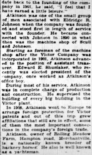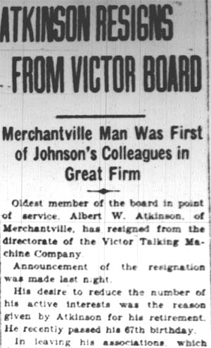 ALBERT W. ATKINSON was born in Burlington County, New Jersey around 1861 to Joseph and Hannah Atkinson. The family had been living in Westampton Township shortly before his birth, and was living in Springfield Township, Burlington County NJ at the time of the 1870 Census. Joseph Atkinson then supported his family, which included daughters Hannah and Frances, working as a laborer. When the census was taken in 1880 Albert Atkinson had left home and was working as a machinist. He was living at Smithville, is Easthampton Township, Burlington County NJ, where Hezekiah B. Smith operated a factory which manufactured woodworking machinery and bicycles. Smith died in November of 1887. By 1888 Albert Atkinson had moved to Mount Holly NJ. That year he began working for the Northrop Manufacturing Company at 117-119-121 North Front Street, a firm which manufactured steam engines. In 1890 be went to work for another company, A Scull & Son, whose machine shop was at 108 North Front Street. Another young machinist was employed there, named Eldridge Johnson. Albert Atkinson and Eldridge Johnson would remain associated for most of the next five decades. When Scull & Son became Scull & Johnson, Albert Atkinson stayed on. Albert Atkinson moved to Camden later in the 1890s. When the Census was taken in 1900, Albert W. Atkinson, his wife Mary, and daughters Celia and Myra were living at 606 Federal Street in Camden. He was then the foreman at a machine shop, probably that of his friend, Eldridge Johnson. When Johnson founded the Victor Talking Machine Company, Albert Atkinson was the firm's first machine shop foreman. He remained with the firm until his retirement in April of 1928, his last position being that of Assistant Treasurer. He also served on the Board of Directors, and oversaw the construction of every large building at the Victor plant, some of which are still standing and in use in 2006. While with Victor, he worked alongside walter staats and Albert C. Middleton, among others. Albert Atkinson and family had moved to West Walnut Avenue in Merchantville NJ by 1910, and by 1920 to 109 East Maple Avenue in the same borough. He raised horses on his Rolling Meadow Farm, on Hampton Road in nearby Delaware Township, and yachting. In 1928 he served as coomodore of the barnegat bay yacht racing association. Albert W. Atkinson passed away less than two years after his retirement. The 1930 Census indicates he was survived by his wife Mary and daughter, Celia Atkinson Patterson. |
