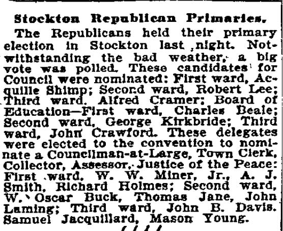 Stockton Annexed Against Protest Of Democrats. Fifty years ago, the old town of Stockton was annexed to the City of Camden over the protests of Democratic members of the town council. But a Republican Legislature approved a bill introduced by former Justice Frank T. Lloyd on March 24, 1899. He was a member of the Assembly at the time. He resided then in the structure now occupied by the Sheltering Arms Home at Eighteenth street and River avenue. The town of Stockton had been in existence five years when the annexation took place. Merchantville and Pennsauken township were part of the original Stockton Township with the present East Camden area. Merchantville received its charter as a borough 75 years ago this month. In 1892. Pennsauken township withdrew, from the. township to become a separate municipality. For two years East Camden remained in the township. In 1894 Alfred Cramer, founder of Cramer Hill, launched a movement to create the town of Stockton and the first governing body was elected. Edward Dudley, then a leading lawyer, was elected councilman-at-large, which entitled him to preside as mayor. William S. Abbott, a lifelong resident, became became clerk. The town was divided into three wards. fred voigt and Justice Lloyd also served with Cramer and Dudley in the town council. The town hall was on the triangle, at Twenty-seventh and Federal Streets. Albert Plum and William C. Reeves were justices of the peace. Samuel M. Jaquillard served on the Board of Freeholders as did W.O. Buck and Joseph Funfer. Charles E. Allen was a member of the Board of Education. After the annexation Abbott was elected to Camden City Council. Others elected were Dr. William H. Kensinger, now a resident of Florida; Frederick S. von Nieda, Frederick H. Finkeldey, president of the first Playground Commission; Arthur R, Gemberling, now of Woodstown. Other active citizens were Lemuel D. Horner, undertaker; Dr. H. F. Hadley, Jacob Bendinger, proprietor of the Rosedale Inn, and Walter L. Tushingham, former vice-president and general manager of the Courier-Post Newspapers. |