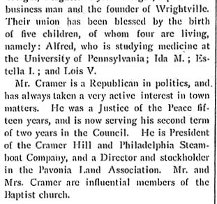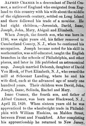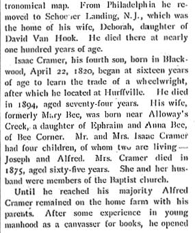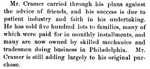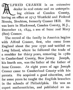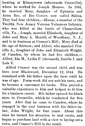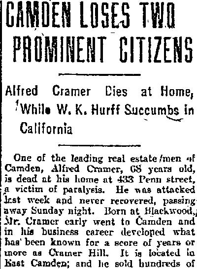 ALFRED CRAMER was born on a farm in Blackwood in 1844. He remained on the farm till the age of sixteen, when he took a position selling books. The sales experience would prove invaluable in his later ventures. In 1870 he married Priscilla Wright, whose father John had founded the village of Wrightsville in Stockton Township, present day East Camden. In the mid-1870s he ventured into real estate, and developed a program of selling building lots on a monthly installment plan. In this manner he purchased large tracts of land in Cramer Hill and East Camden and sold over 5000 building lots. His home and office were, in the late 1880s and early 1890s, on "Westfield Avenue near Cooper Avenue" in Stockton Township. His younger brother, Joseph Cramer, came to Camden, settling at 27th Street and Westfield Avenues, and also became heavily involved in real estate and homebuilding in the area. Alfred Cramer involved himself in politics, serving 16 years as a justice of the peace and at least two terms on city council. He was a Republican. He also served as postmaster in the section for fifteen years, running a "Cramer's Hill" post office from April 24, 1878 to Dec 12, 1893. When he resigned, Charles W. Scott too over as postmaster of "Cramer Hill" from December 12, 1893 to September 30, 1899. After that mail service was then done by Camden. Alfred Cramer passed away at his home, 433 Penn Street, on December 15, 1912. Survived by his wife, Priscilla, he was buried at Evergreen Cemetery in Camden. The Eastside Elementary School, built in 1913 at South 28th and Mickle Streets was renamed the Alfred Cramer Junior High School in his honor, and has been known as the Alfred Cramer Elementary school since 1957. Cramer Street, in East Camden, also was named for him. Of course, Alfred Cramer is forever remembered by the neighborhood which bears his name, Cramer Hill. |