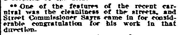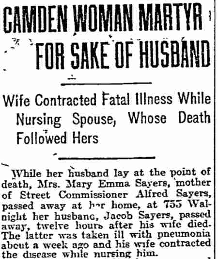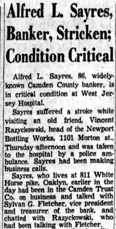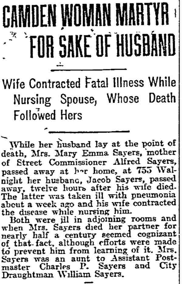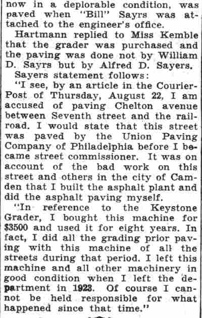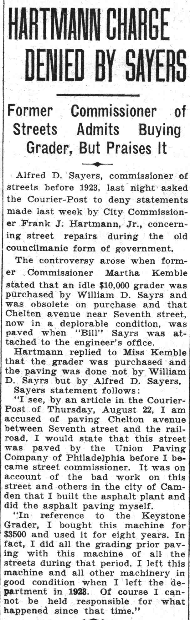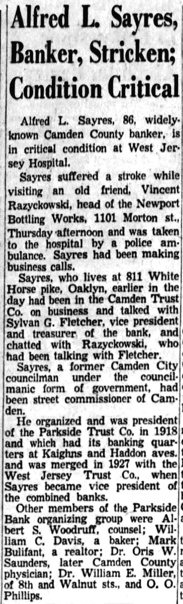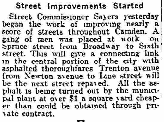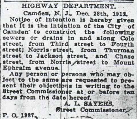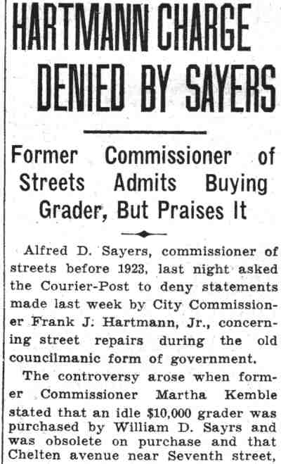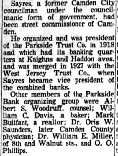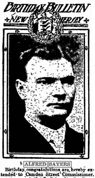 ALFRED L. SAYERS was born in Blackwood NJ, June 9, 1869 to Thornton and Mary Emma Sayers. His family came to Camden when he was a small boy, and lived at 561 Pine Street at the time of the 1880 Census. The Sayers family was living at 745 Walnut in the middle 1880s, and are listed at 806 Walnut in the 1888-1889 and 1890-1891 Camden City Directories. Alfred L. Sayers was educated in the E.A. Stevens School at 430 South 4th Street, Camden, and Abrahamson's Business College, in that city. He entered the Camden Police department April 14, 1894, and while in that department became a steam and hot water contractor, in which he was very successful. He married Clara V. DeBarth around 1896. The first appear in Camden City Directories in 1897, at 821 Spruce Street. By 1898 they had moved to 820 South 8th Street. The Sayers stayed at that address through 1924. In 1904 Alfred Sayers resigned from the Police Department to become a member of the Board of Freeholders, and in 1906 he was made a director and president of that body, and served until 1910, when he resigned to become street commissioner of Camden. Up to this time he had been carrying on his heating and hot water contracting work, but now he sold out and devoted all his time to his position as street commissioner, this service running from 1910 to 1923, under Mayors Charles H. Ellis and Frank S. Van Hart. The city was in the midst of its great expansion both in overall geography, population, and the sheer number of streets and roads that had to be dealt with during his tenure bears recognition. Alfred L. Sayers was a committee clerk in the New Jersey Legislature, associated with William J. Bradley in the Senate 1904-05. On November 6, 1917 the Parkside Trust received its charter. Alfred L. Sayers was among the founders of the new bank. On January 12, 1918 he was made a director of the Parkside Trust. He was active in its organization, which was consummated January 12, 1918, the date of his election, and served as its president from its inception through its May 1927 merger with the West Jersey Trust Company. The new bank was known as the West Jersey-Parkside Trust Company, its first president being newspaper publisher and congressman Francis Ford Patterson Jr. Alfred L. Sayers remained Camden' Streets Commissioner through at least January of 1922. Alfred L. Sayers was living at 1188 Everett Street in Camden when the 1929 Camden City Directory was compiled. Both the 1930 and 1940 Census shows Alfred L. Sayers and his wife, the former Clara DeBarth, living at 815 White Horse Pike in Haddon Township, New Jersey. |