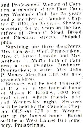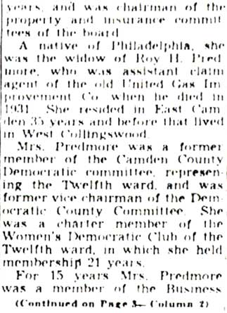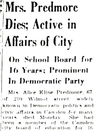 ALICE KLINE PREDMORE was born about 1883 in Philadelphia. Married to Roy H. Predmore, she moved to East Camden around 1918. The Predmore family made its home at 210 Wilmot Street, not far from Woodrow Wilson High School. Alice K. Predmore became involved in city and county politics, served as a committeewoman for the Democratic party from the 12th Ward of Camden, and at one time was vice chairman of the Democratic County Committee for Camden County. When her husband passed away in 1931, she worked as a legal secretary in Philadelphia. In 1935 she was became a member of Camden's Board of Education, and served in that capacity until her death on July 9, 1951 at the age of 67. She also was involved with the Order of the Eastern Star, a Masonic organization. Alice Predmore was survived by a son and three daughters, and her sister. |