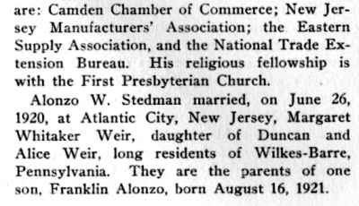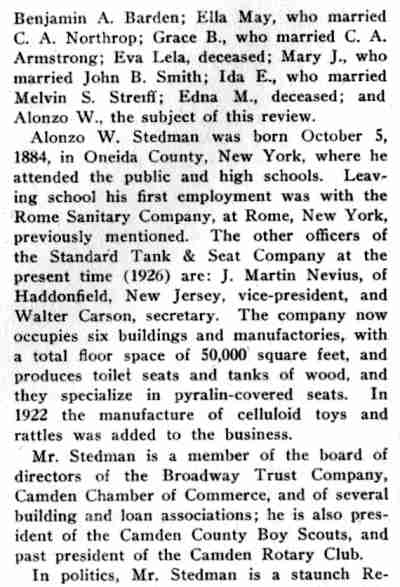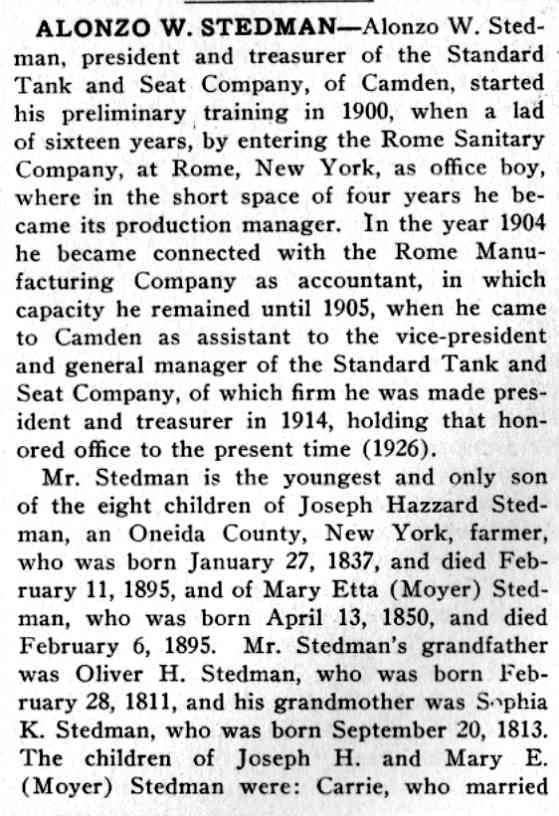 ALONZO WALRATH STEDMAN was born in Annsville, New York on October 5, 1884. He came to Camden in 1905 to accept a management position with the Standard Tank and Seat Company, which was located at 314 North Front Street. By 1914 he had been made president and treasurer of the company.