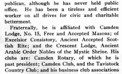 Alonzo W. Stedman was very active in community affairs as president of the Camden County Boy Scouts, as a member of Camden Rotary Club, with the Y.M.C.A., and at one time served as President of the Camden Home for Children. He was director of the Broadway Trust Bank, a member of the Chamber of Commerce and a member of the First Presbyterian Church in Camden. He was also quite active in Masonic affairs.