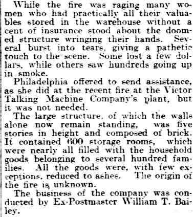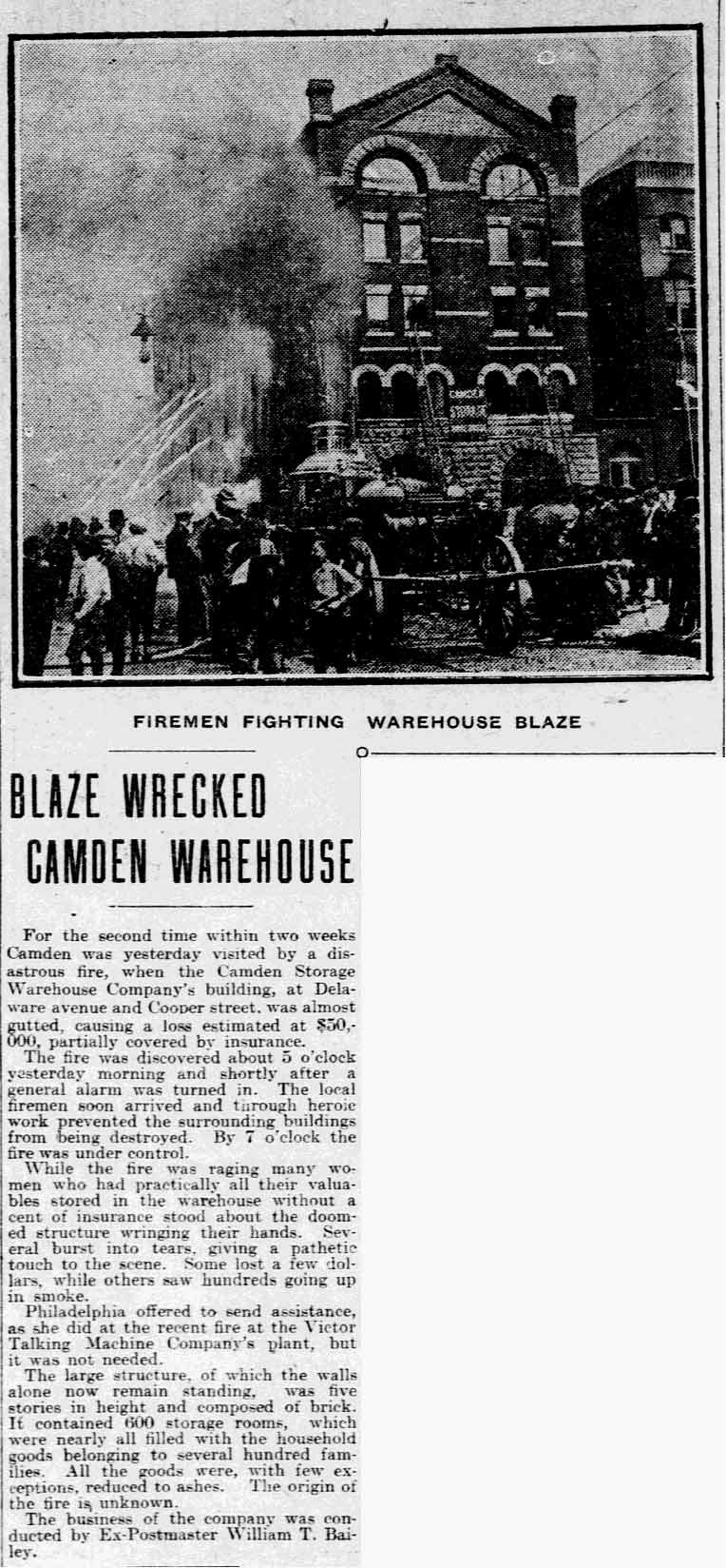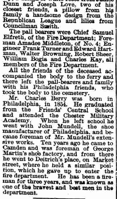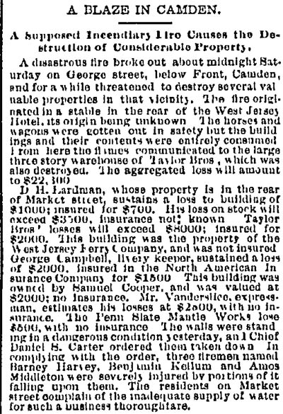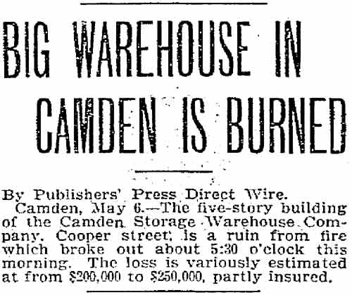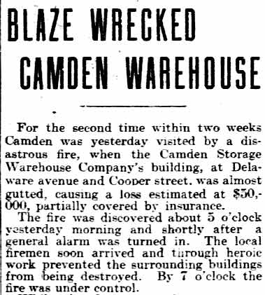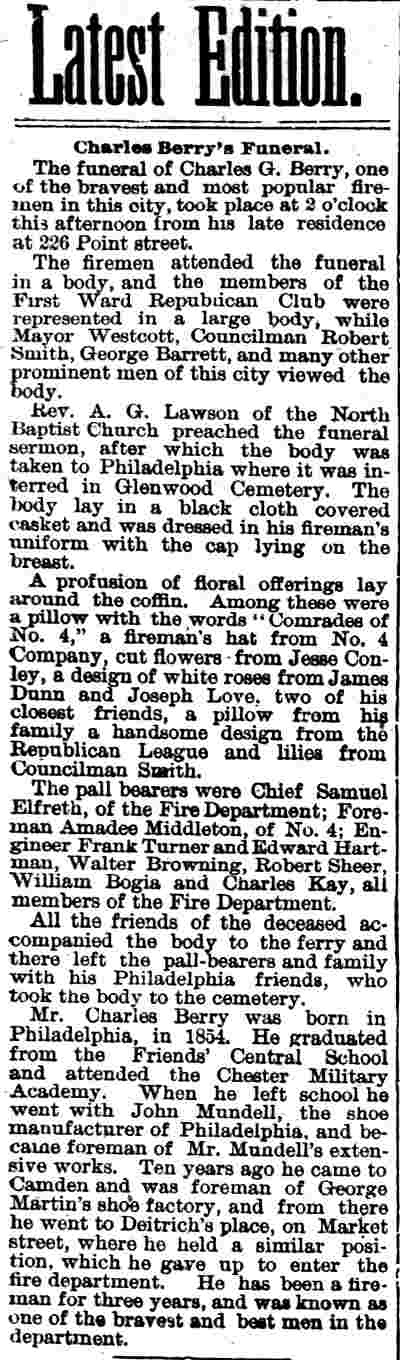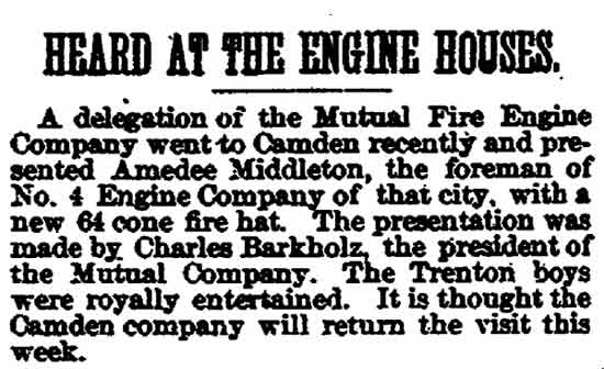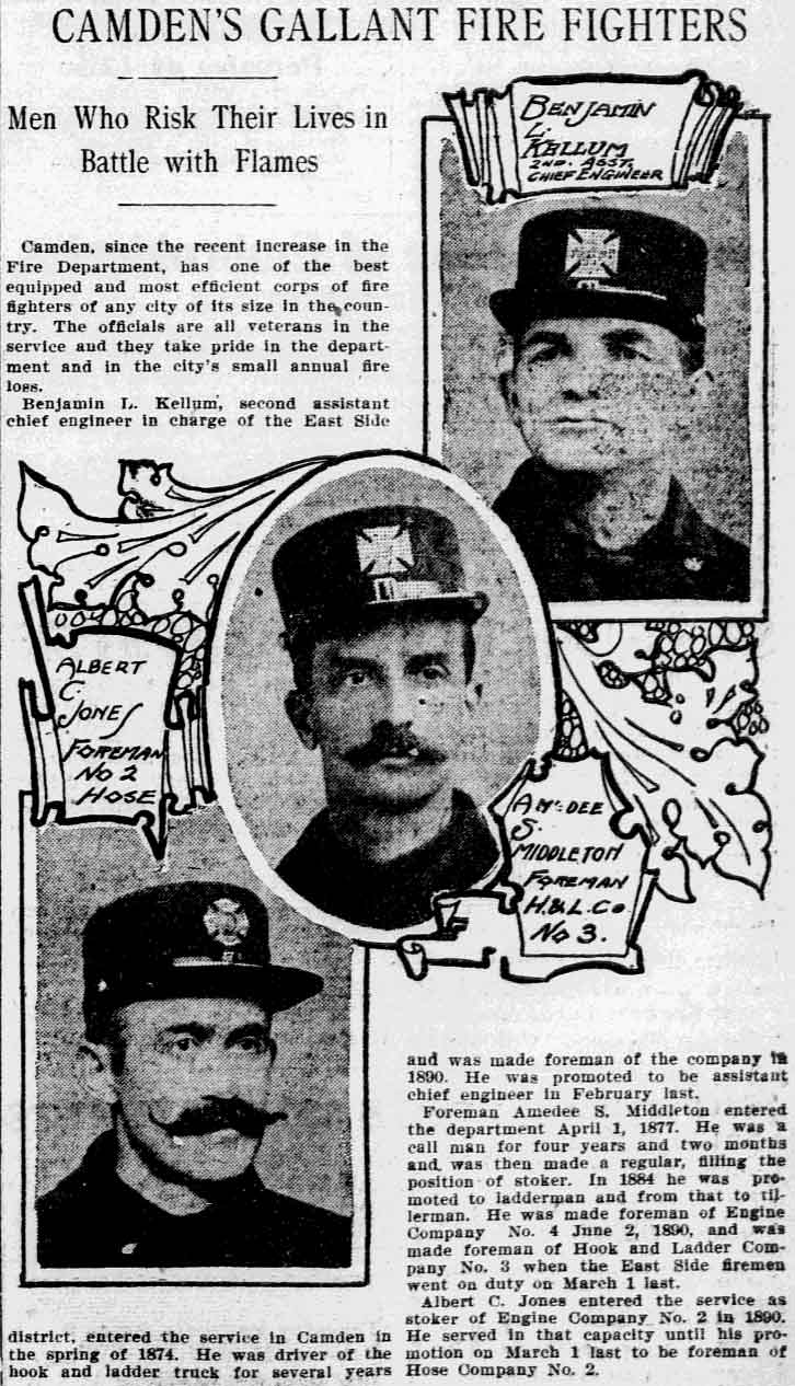 Amedee Middleton's maternal grandfather was Joseph C. Delacour, a retired United States Army officer and one of Camden's most public-spirited citizens of his time; his uncle, Joseph L. Delacour, served in the Union Army during the Civil War; and his great-grandfather had accompanied the Marquis de Lafayette to America during the Revolutionary War. Amos and Sarah Jane Middleton appear to have divorced during the mid-1850s. She married a sea captain, William Moslander and of this second marriage two sons were born, Samuel and William S. Moslander. Amedee Middleton had lived in Camden's South Ward as a little boy, and lived in the Middle Ward after his mother remarried. The 1870 Census shows him living with his mother and younger brothers, and mention that he was working at some sort of occupation relating to brass. He married around 1877, and as mentioned above, was appointed to the Camden Fire Department in April of that year. A daughter, Rena, was born in 1878. Amadee Middleton was living at 835 Penn Street and working as a dyer when appointed to the Fire Department. The 1878 and 1879 City Directories give his address as 836 Kimber Street and 830 Kimber Street, respectively, and mention that he worked as a weaver. The Middletons moved to 28 North 3rd Street prior to the 1880 Census, but had returned to familiar surroundings by 1882. From 1882 through 1888 the family lived at 835 Penn Street. Amadee Middleton secured an appointment with the Post Office as a letter carrier in the 1880s. Amedee Middleton was recalled to the Fire Department as an extra man in 1884, and served for one year. In When the Fire Department reorganized in July of 1886, he became a full time firefighter, as tillerman with the Hook and Ladder Company. The 1890-1891 City Directory states that the Middletons had moved to 837 Penn Street. Amadee Middleton was promoted to Foreman and placed in charge of the new Engine Company 4. He commanded Engine Company 4 through 1899. The Middletons moved around during the 1890s. City Directories record there movements as follows; 1894, 603 North 6th Street; 1895, 532 Market Street; 1896 218 North 5th Street; 1897, 623 Market Street; 1898 319 North 5th Street; and in 1899 he was back at 603 North 6th Street. The 1900 Census shows Amedee Middleton boarding at 603 North 6th Street with former Camden Fire Department member Edward S. Powell, and Mary and Rena Middleton boarding at 103 North 26th Street in what had recently become East Camden. When the Town of Stockton was annexed to the City of Camden in 1899, Cramer Hill and East Camden became a part of the City. New Fire companies were organized and a new firehouse was built at North 27th Street and Federal Streets. Similar growth had been going on in South Camden. A new ladder company, Ladder Company 3 went into service in East Camden on March 1, 1900. Amedee Middleton was placed in charge of this unit. Of the many fires Amedee Middleton fought during his tenure with the Camden Fire Department comes this account of the Camden Storage Warehouse fire of May 1904, written by Lee Ryan for the Camden Fire Department's 125th Anniversary history book, published in 1994: At 4:57A.M. on May 6, 1904 a phone alarm and several pull boxes were received for a fire at the Camden Storage Warehouse at Delaware Avenue and Cooper Street. The massive five-story building contained 600 rooms with furniture storage. Smoke and fire could be seen coming from the fourth floor at the southeast corner of the warehouse. Upon arrival, Chief Samuel S. Elfreth transmitted a general alarm as the blaze spread through the entire fourth floor. Within minutes, engine companies had water on the fire as additional streams were directed from the roof of the adjoining E.G. Locke Paper Company. Hoselines were stretched down Penn and Cooper Streets and along Delaware Avenue to supplement water supplies. Shortly after 5:00 A.M. part of the fourth floor collapsed, spreading the fire to the floor below. This collapse was quickly followed by the crashing of the fifth floor. By 5:30 A.M the front section of roof collapsed onto Cooper Street in a thundering roar, creating a shower of blazing embers that threatened numerous buildings along Amber Street. Within an hour of its discovery, the fire had engulfed the entire warehouse. Only through the gallant efforts of the firefighters was the huge blaze contained. While spectators described the fire scene as waves of withering heat, Camden's Bravest held there ground within forty feet of the walls. The City of Philadelphia offered assistance but Chief Elfreth declined and by 7:00 A.M. he declared the fire under control. While battling the blaze, Foreman Amedee Middleton was struck on the head by falling bricks. Only his helmet, which cracked, saved his life. Losses were placed at $50,000. Chief Elfreth and Assistant Chief Buzine stated that the blaze was harder to fight than the Victor Talking Machine fire two weeks prior. Engine Company 1 assigned to the foreground detail remained on the scene until 7:00 P.M. and before leaving found two black kittens still alive in an office area adjoining the ruins of the burned warehouse. The Camden Post-Telegram newspaper described the departing crew of Engine Company 1 as "water soaked and the color of coal stained breaker boys". A crowd of onlookers cheered the weary firefighters as thy left the scene after fourteen hours at the fire.