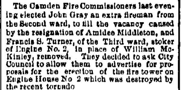 AMEDEE ST. CLAIR MIDDLETON was first appointed to the Camden Fire Department's Hook & Ladder Company as an extra man in April 8, 1877. He served for until April 1882, then was replaced by Robert Miller. Amedee Middleton was recalled to duty for one year in the spring of 1884, replacing Logan Bates. Again called to serve in 1886 Amedee Middleton was promoted to Tillerman of the Hook and Ladder Company. On June 1, 1890 , when Engine Company 4 went into service in 1890, Amedee Middleton was promoted to Foreman and assigned to Engine Company 4 as it first went into service at 320 Vine Street in North Camden. Other personnel initially assigned to the new company included Frank Turner, engineer, Edward Hartman, driver, Barney Harvey, stoker and the hosemen were Walter Browning and Charles Berry. Amedee St. Clair Middelton was born to Amos Archer Middleton and his wife, the former Sarah Jane Delacour, in July of 1852, according to the 1900 Census. Of the six children born only three reached adulthood, Stanislaus, Frederick, and Amedee. |