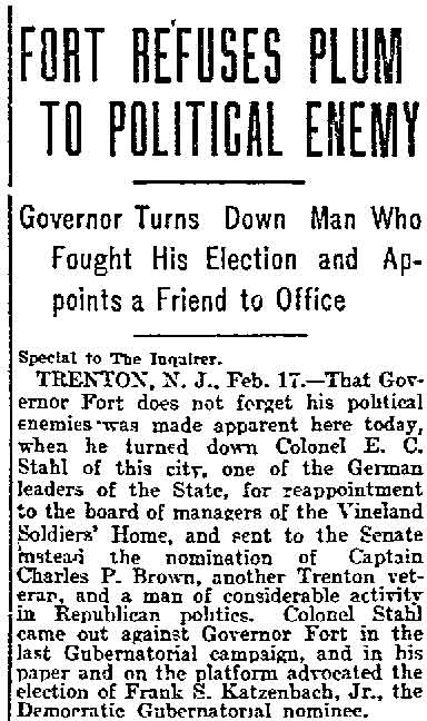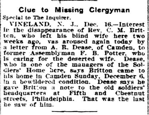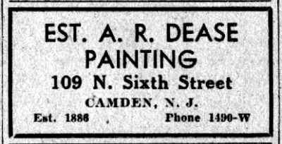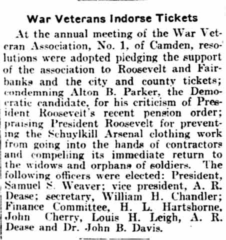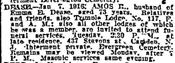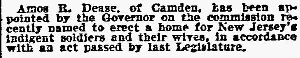 Private Dease was among those who mustered out of Company E, 128th Pennsylvania Infantry Regiment on May 19, 1863 at Harrisburg. He returned to his home and family in Reading, and stayed in reading through July, 1870. Amos Dease subsequently moved to Camden, New Jersey with his wife Emma and daughter Maggie and went to work as a painter. The Dease family was in New Jersey by 1872 when daughter Mary was born. By June of 1880 there were three more children, Harry, Walter, and William Dease. Camden Fire Department records show that Amos R. Dease was living on Newton Avenue, but do not give a house number. Amos R. Dease was appointed to the Camden Fire Department as an extra man with Engine Company 1 on May 8, 1877 taking the place of Asa V. Borton. He was removed from service of April 1, 1879, and was replaced by Howard Sharp. The 1878-1879 City Directory gives his address as 939 Newton Avenue. From City Directories we know that he had moved to 911 Reese Street by 1882. Reese Street was renamed St. John Street by the time the 1884 Camden City Directory was compiled. The Dease family remained at 911 St. John Street through at least 1885. Amos R. Dease had worked for others as a painter, including Mahlon Ivins Sr. In late 1884 or early 1885 he went into business for himself, with former Camden Fire Department member Nesbert Y. Sloan as a partner, at 416 Market Street. The venture was called, appropriately enough, Dease & Sloan. After six months the partnership had dissolved due to illness on the part of Mr. Sloan, and Amos R. Dease carried on at 416 Market Street into the next century. Amos R. Dease had moved to 714 South 4th Street by the end of 1887. The 1890-1891 City Directory shows that he had moved to 414 Berkley Street, where he remained through 1894. By 1896 the Dease family had moved to 437 Stevens Street. This address was Amos R. Dease's home until his passing on January 7, 1916, at the age of 73. Amos R. Dease also became active in politics, as a Republican, and was active in civic and fraternal organizations. He was a member of Camden Lodge 293 of the Elks, Trimble Lodge No. 117, Free and Accepted Masons, the William B. Hatch Post No. 37, Grand Army of the Republic, and the War Veterans Association No. 1 of Camden. He served as a member of City Council from the Fourth Ward and at least once ran as a candidate for Camden County freeholder from Camden's Fourth Ward. Amos Dease's most lasting work was his participation in the founding and administration of the New Jersey Home for Disabled Soldiers, Sailors, Marines and their Wives, or Widows which first opened at Vineland, New Jersey in 1900. In August of 1898 he was appointed to a commission to look into the feasibility of such a home by then-Governor Foster M. Voorhees, for whom Voorhees Township is named. Once the Home went into operation, Amos R. Dease served on its Board of Managers until 1914. As stated above, Amos R. Dease passed away on January 7, 1916 at the age of 73. He was buried at Evergreen Cemetery in Camden.. |