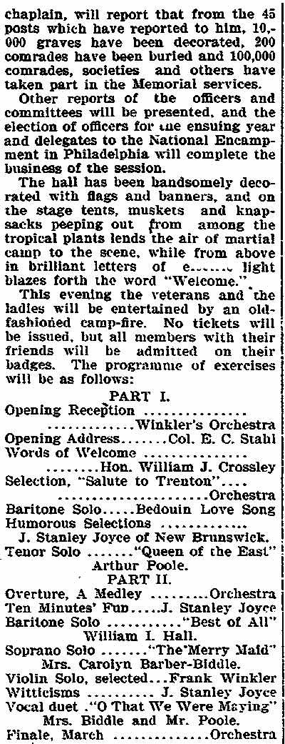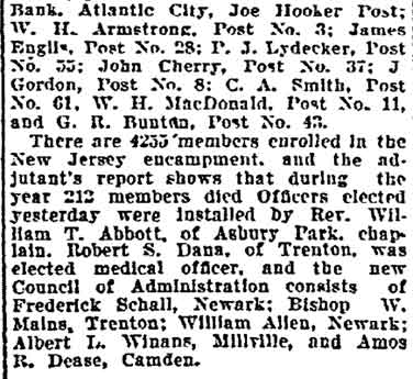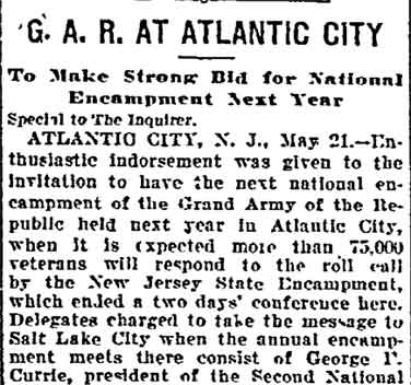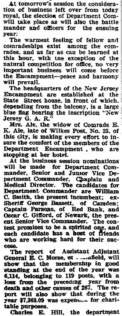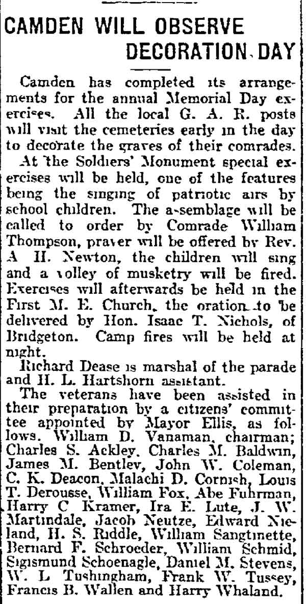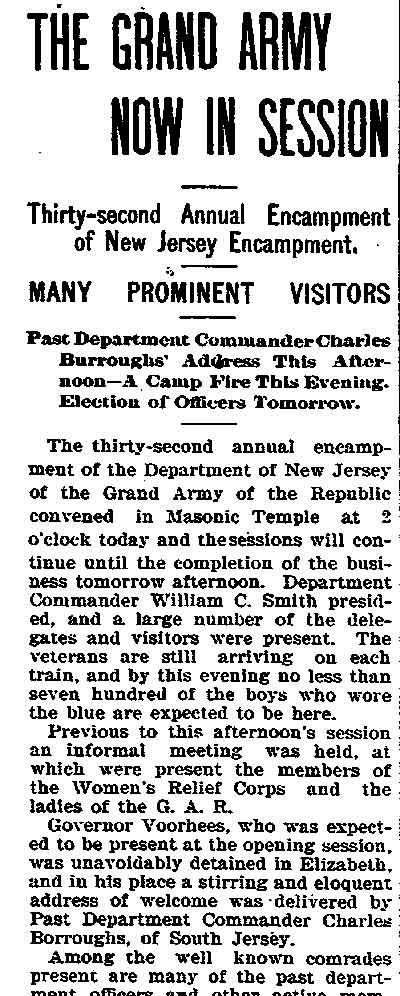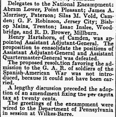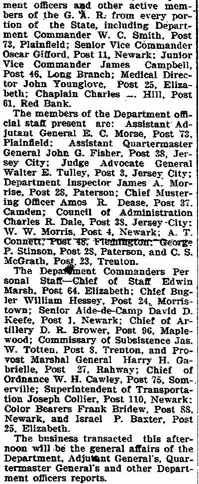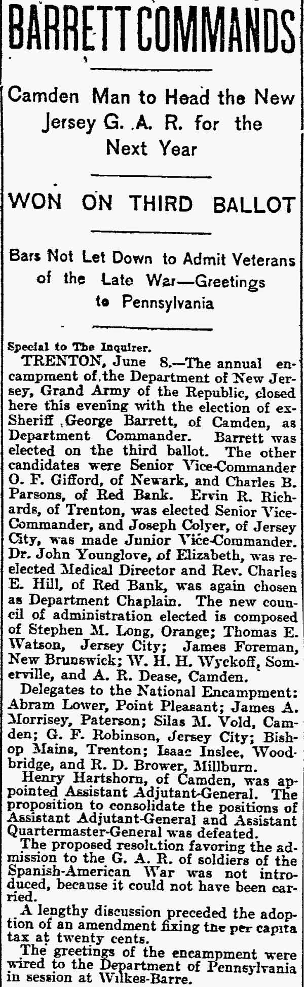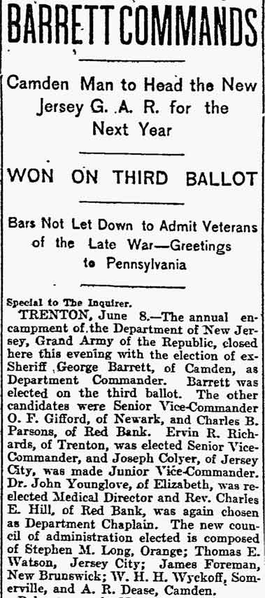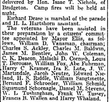 B. Hatch Post No. 37, G.A.R. William B. Hatch Camp No. 1, Sons of Veterans - George M. Robeson Post No. 51, G.A.R. General John A. Logan Post 101, G.A.R. Samuel Dodd - Benjamin D. Coley - Amos Dease - C.S. Magrath Charles P. Bowers - Preston Hughes - h.h. franks - william h. butts Rev. W.P. Strickland - Morris S. Garman - Gatling Gun Company B Captain Robert Eckendorff - East Camden Fife & Drum Band |