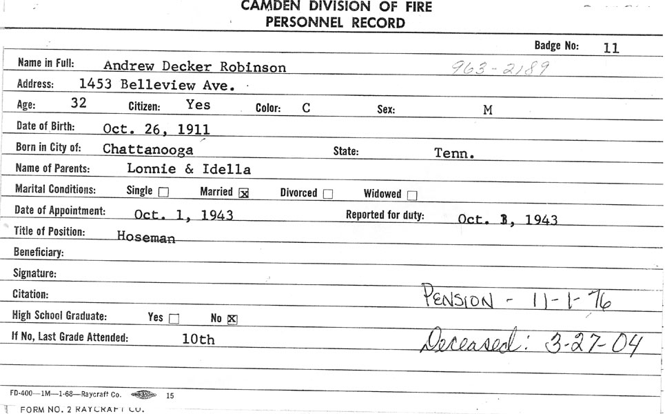 Circa 1949- Engine Company 1, wagon and pumper at front of quarters, South 4th & Pine Streets, South Camden. From left: Firemen Alfred Green, Fred Henderson, Charles Cook, Leroy Hatchett, Robert Thomas, Andrew Robinson, James Richardson, Eugene Alston, James Clinton, Captains jesse jones and Raymond Amos. |