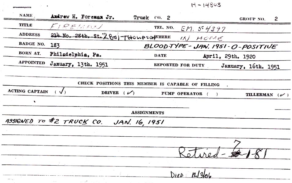 ANDREW H. FOREMAN JR. was born in Philadelphia on April 29, 1920 to Blondella and Andrew Foreman. Andrew Foreman lived in Philadelphia prior to World War II. He completed two years of high school before entering the workforce. On February 27, 1942 Andrew Foreman was inducted into the United States Army. He served with one of the three all-black Tank Battalions that were active in France and Germany during the war, and had been promoted to Corporal prior to his leaving the Army. By 1946 Andrew Foreman was married and living in East Camden, at 214 North 28th Street. On January 13, 1951 he was appointed to the Camden Fire Department, and reported for duty with Ladder Company 2 at 619 Kaighn Avenue three days later. He served with Ladder Company 2 for over 30 years, retiring on July 1, 1981 |