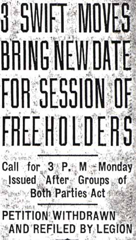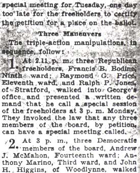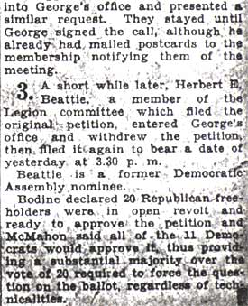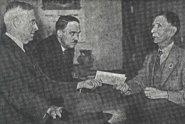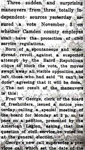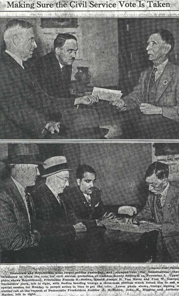 Democrats and Republicans forgot politics yesterday and stamped out technicalities which threatened to block the vote for Civil Service protection for Camden County employees on November 3rd. Freeholder Francis B. Bodine, Sheriff Joseph H. Van Meter, and Fred George, freeholder's clerk, left to right, with Bodine handing George a three-man petition which forced home to cal a special session for Monday to permit action to get the vote. |