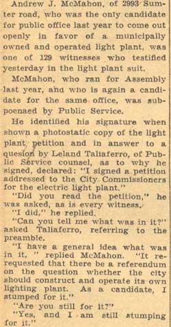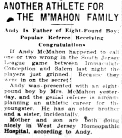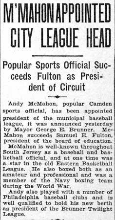 ANDREW J. McMAHON was born February 14, 1895. A fine athlete as a youth, he boxed both as an amateur and as a professional, was a star in the old Eastern Basketball League, played with number of semi-pro baseball clubs, and was well known as a baseball and basketball referee. Andrew J. McMahon ran unsuccessfully for the New Jersey State Assembly in 1933 and 1934. A Democrat, he backed Edward J. Kelleher in the bitter fight to wrest control of the Democrat party in Camden County from Harry Maloney and Emma Hyland. In August of 1935 newly elected Mayor George Brunner named Andrew McMahon as commissioner of the city's municipal baseball league. He served as a Freeholder from Camden's 14th Ward in the mid-1930s, and played a role in bringing Civil Service protection to Camden County employees. By 1947 he was a Commissioner on the Camden County Jury Commission. By 1947 Andrew J. McMahon made his home at 1095 Trent Road in Camden. He would reside on Trent Road until his passing in December of 1976. |