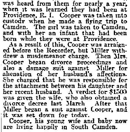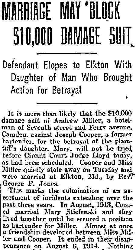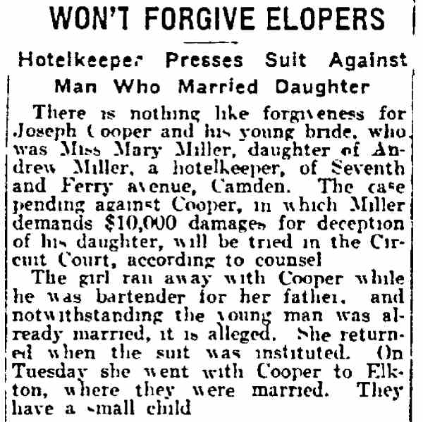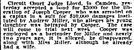 ANDREW MILLER operated bars in Camden on at least two occasions. He was licensed to sell liquor at 1423 South 10th Street in 1906, and appears in the 1907 City directory working as a laborer and living at 939 Mechanic Street, just two doors away from that location. In late 1913 or early 1914 Andrew Miller went into the bar business at 625 Ferry Avenue, where Kolman Goldstein had been running a tavern and a real estate office since 1911. Andrew Miller stayed in the bar business through the fall of 1916. Not long afterwards, he left the liquor trade. William Plevinsky took over the bar and was in business at 625 Ferry as late as 1924. By September of 1918 Andrew Miller had moved to 1617 Mt. Ephraim Avenue. He was then working as a butcher at for the Joseph Campbell Company, better known as Campbell Soup. The Millers were still at that address in January of 1920. Andrew Miller had gone back into business as a butcher. The family stayed at that address into 1922. The 1924 City Directory shows Andrew Miller and family at 1169 Van Hook Street. This would remain his home until at least 1940. In September of 1928 Andrew Miller's daughter Cecelia married Philip John Golaszewski, who was well known as a long distance runner and later as a local businessman as John Glazer. Andrew Miller passed away on April 5, 1958. |