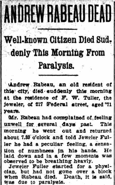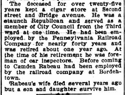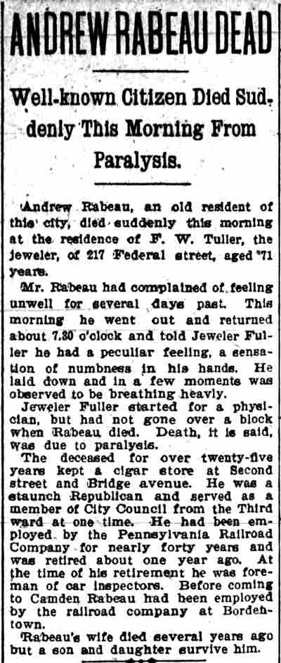 ANDREW RABEAU was born in February of 1832 in New Jersey. He was the son of Andrew and Mary Rabeau. The family was living in Bordentown, new Jersey when the Census was taken in 1850. Andrew Rabeau married in the mid-1850s. He was living and working in Camden as a railroad car inspector when the Census was taken in 1860. He was then married, his wife Abbie by then had given birth to their first child, Emma. Andrew Rabeau was appointed to the Camden Fire Department to replace Samuel Patton as an extra man with Engine Company 2, who resigned April 2, 1870. He was working or the Pennsylvania Rail Road as a master car inspector and was making his home at 215 Mickle Street when appointed to the Fire Department. When the Census was taken in 1870 Andrew Rabeau was married with four children. He was living with his wife, Abbie, and children Emma, Laura, Mary, and William. After leaving the Fire Department, Andrew Rabeau returned to working for the Pennsylvania Rail Road. He operated a tobacco store at 17 South 2nd Street, the northeast corner of South 2nd Street and Bridge Avenue, in the late 1870s and into the early 1890s, before returning to the railroad. Andrew Rabeau was a member of Camden's City Council in 1881 and 1882. When the 1894 City Directory was compiled Andrew Rabeau was living at 217 Federal Street. The Census taken in 1900 states that Andrew Rabeau was a widower. He and his daughter Laura were living at 217 Federal Street in Camden at that time.. Andrew Rabeau retired from his job with the Pennsylvania Rail Road in March of 1902. He is not listed in the 1906 City Directory, and may have passed away. |