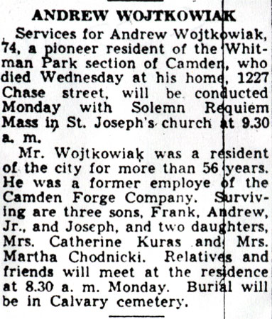 ANDREW WOJTKOWIAK was one the first Polish immigrants to settle in Camden. Born in the Posen district of what was then Germany, he came to America in 1884 with brothers John L. and Adalbert Wojtkowiak. He married around 1896. When the Census was taken in 1910, the Wojtkowiaks were living at 831 Sycamore Street. By 1920 the family had moved to 1227 Chase Street. There were five children, Frank, Andrew Jr., Joseph, Catherine, and Martha. Andrew Wojtkowiak was then working as a puncher at one of Camden's shipyards. Andrew Wojtkowiak later worked at Camden Forge. He had retired by April of 1930, when the census was enumerated. Preceded in death by his wife Mary, Andrew Wojtkowiak passed away in May of 1942. One of Andrew Wojtkowiak's nephews Private John Wojtkowiak, was killed in action serving with the United States Army during World War I. Another nephew, Stanley Wojtkowiak, founded the Stanley Heat & Fuel Company, later run by great nephew John White, which served many residents of Camden Whitman Park neighborhood from the 1920s through the 1970s. A third nephew, Casimir Wojtkowiak, worked as a Camden County detective under Chief Larry Doran in the 1930s and 1940s. |